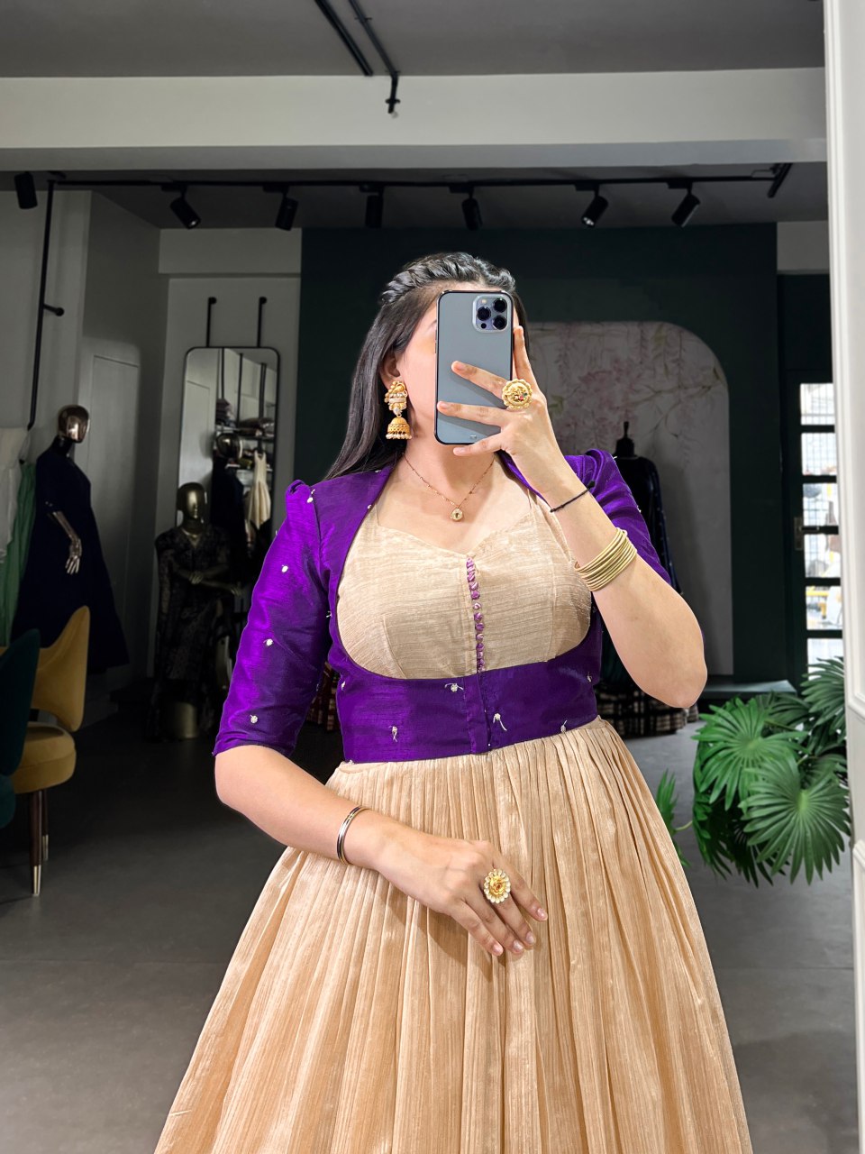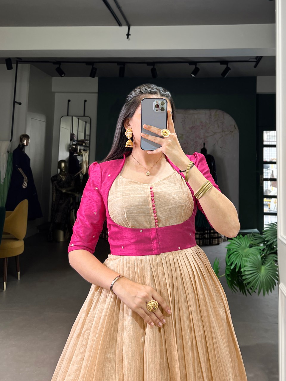 Beige Silk Printed Gown with Embroidered Banglory Koti