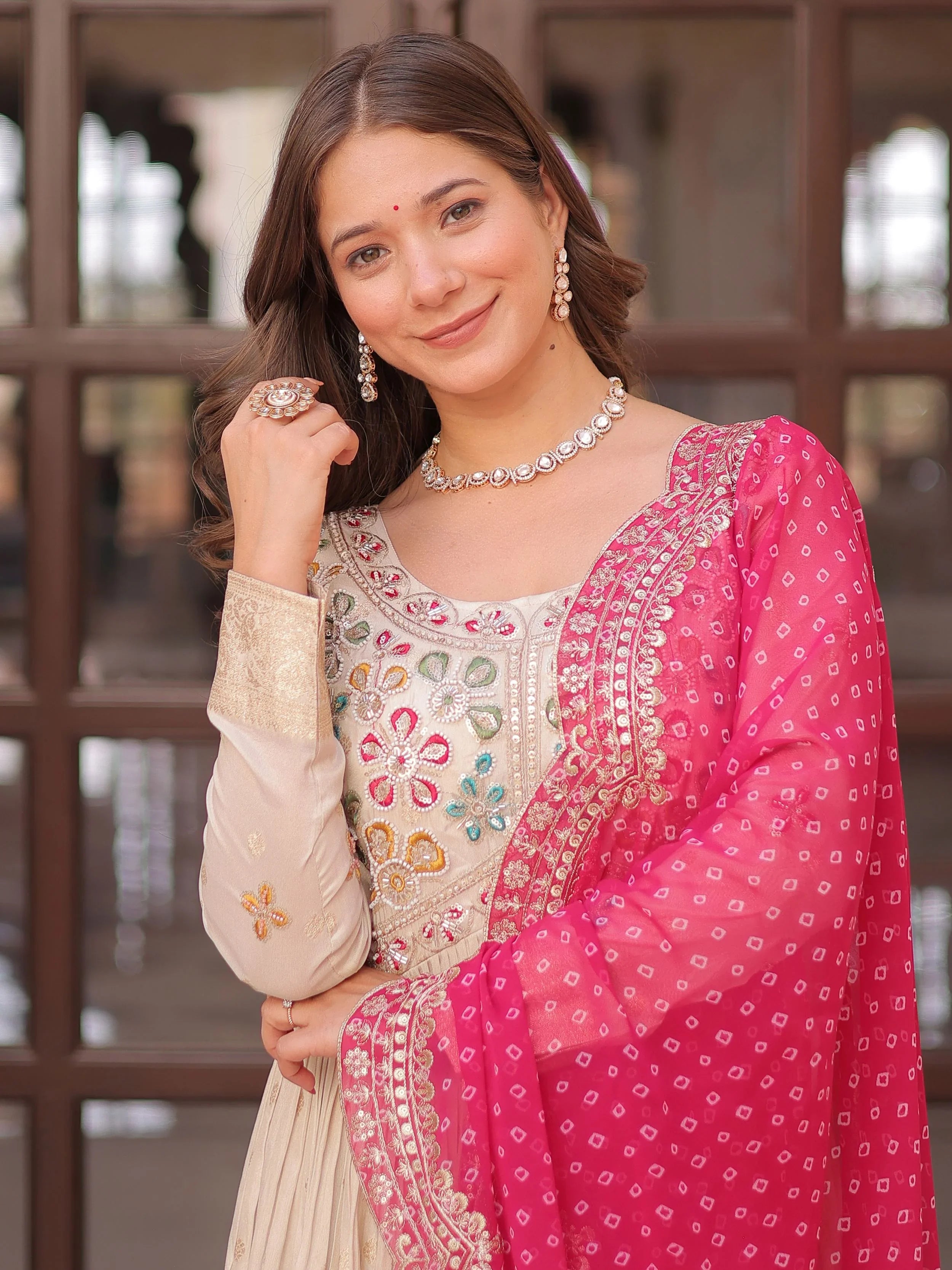 Cream Silk Pearl Beads Embroidery Gown with Pink Bandhani Dupatta