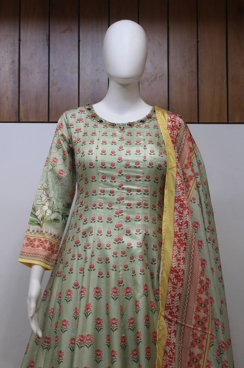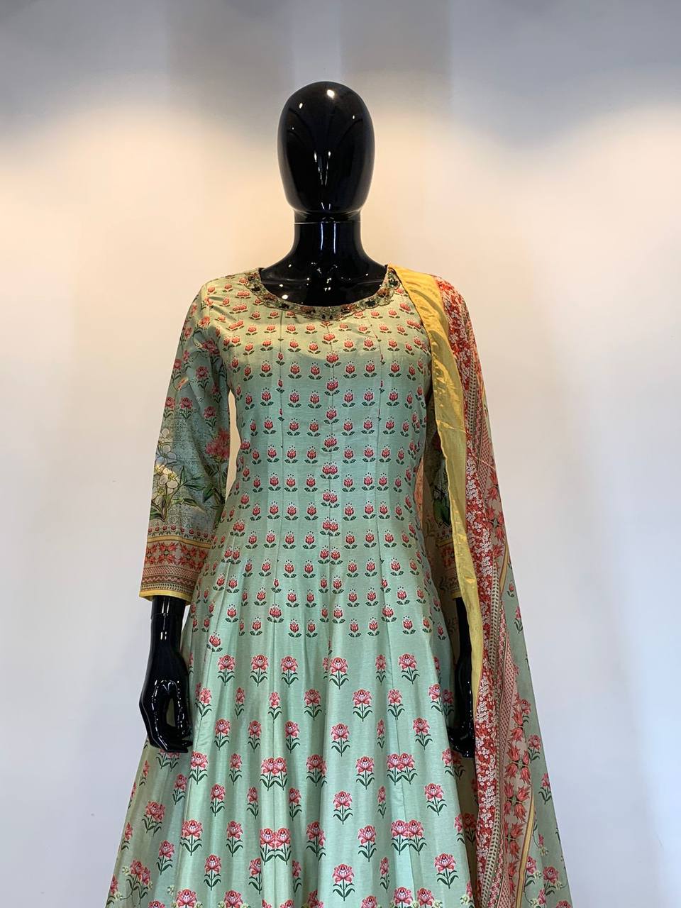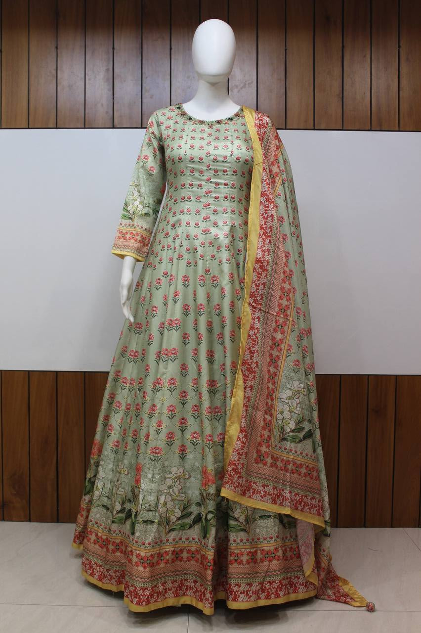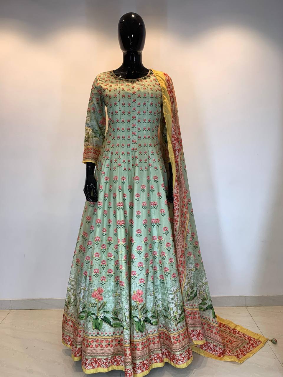 Step into the world of bold and daring fashion with our Manvi Green Silk Flared Anarkali Gown Set! Made from luxurious silk, this set features a stunning flared Anarkali gown, perfect for making a statement at any event. Embrace your adventurous side and stand out from the crowd in this one-of-a-kind ensemble.