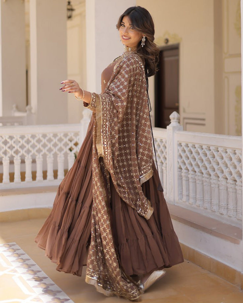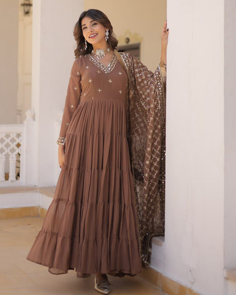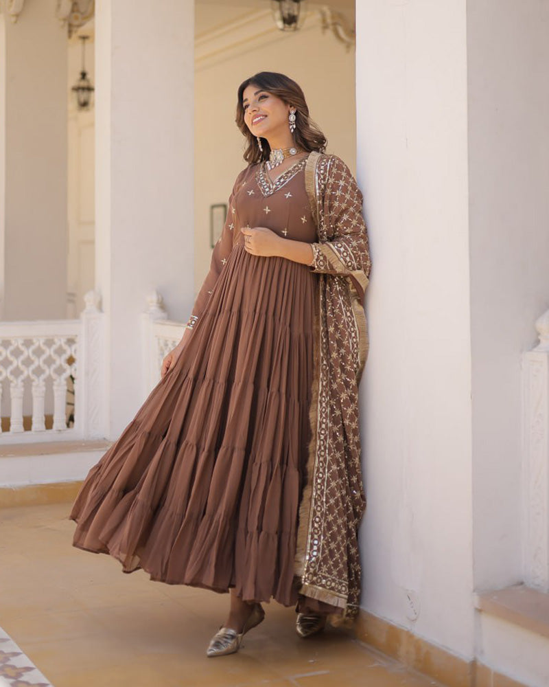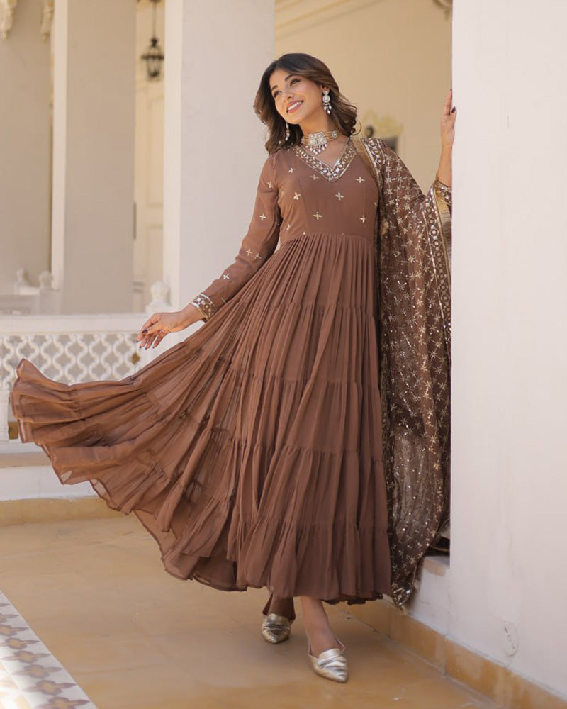 This Ridhika Brown Georgette Anarkali Gown Suit Set is expertly designed with 100% Georgette fabric and features a stunning anarkali gown style. Perfect for special occasions, this elegant outfit offers a luxurious and comfortable fit, making you feel confident and stylish. Elevate your wardrobe with this unique and sophisticated piece.