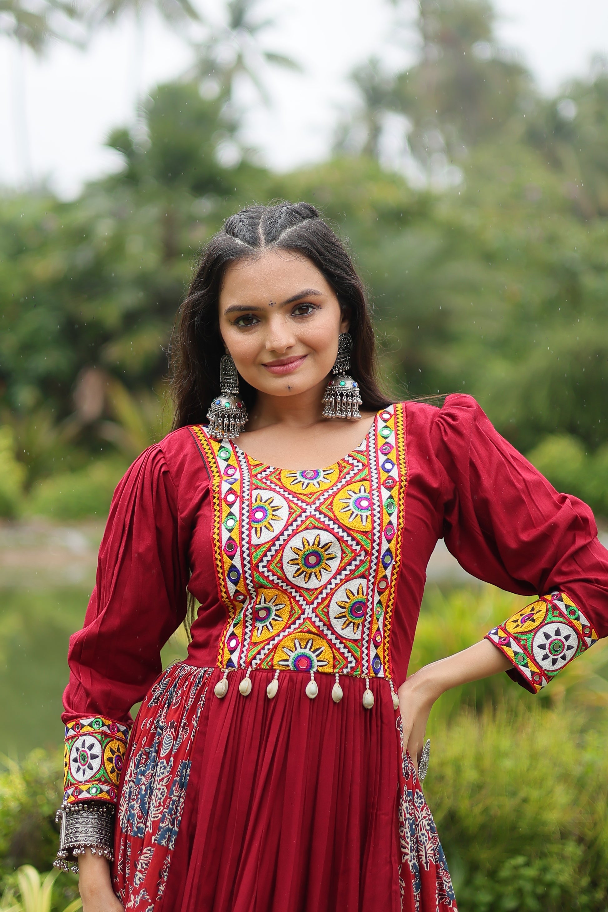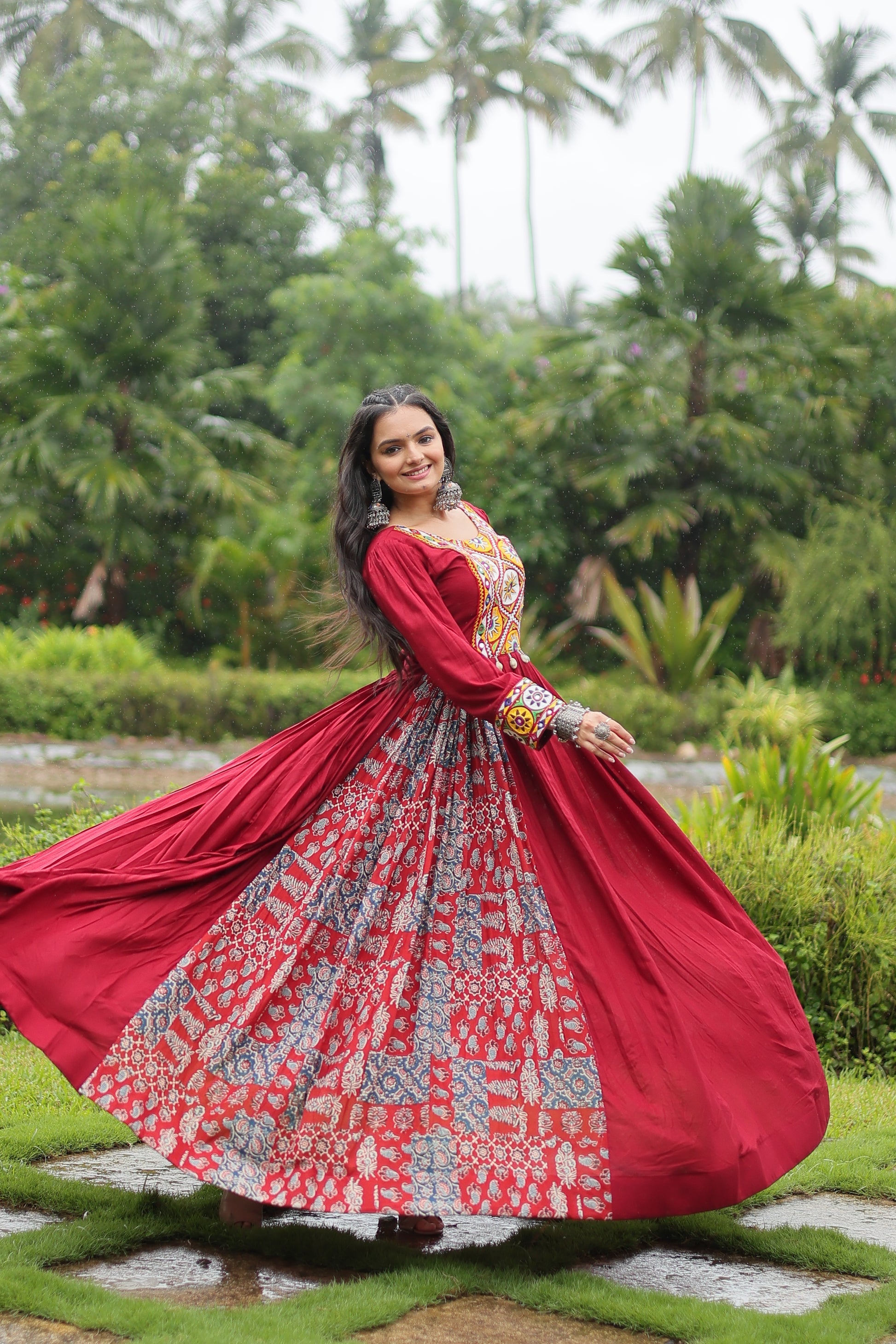 Sankita Maroon Rayon Gamthi Work Navratri Gown