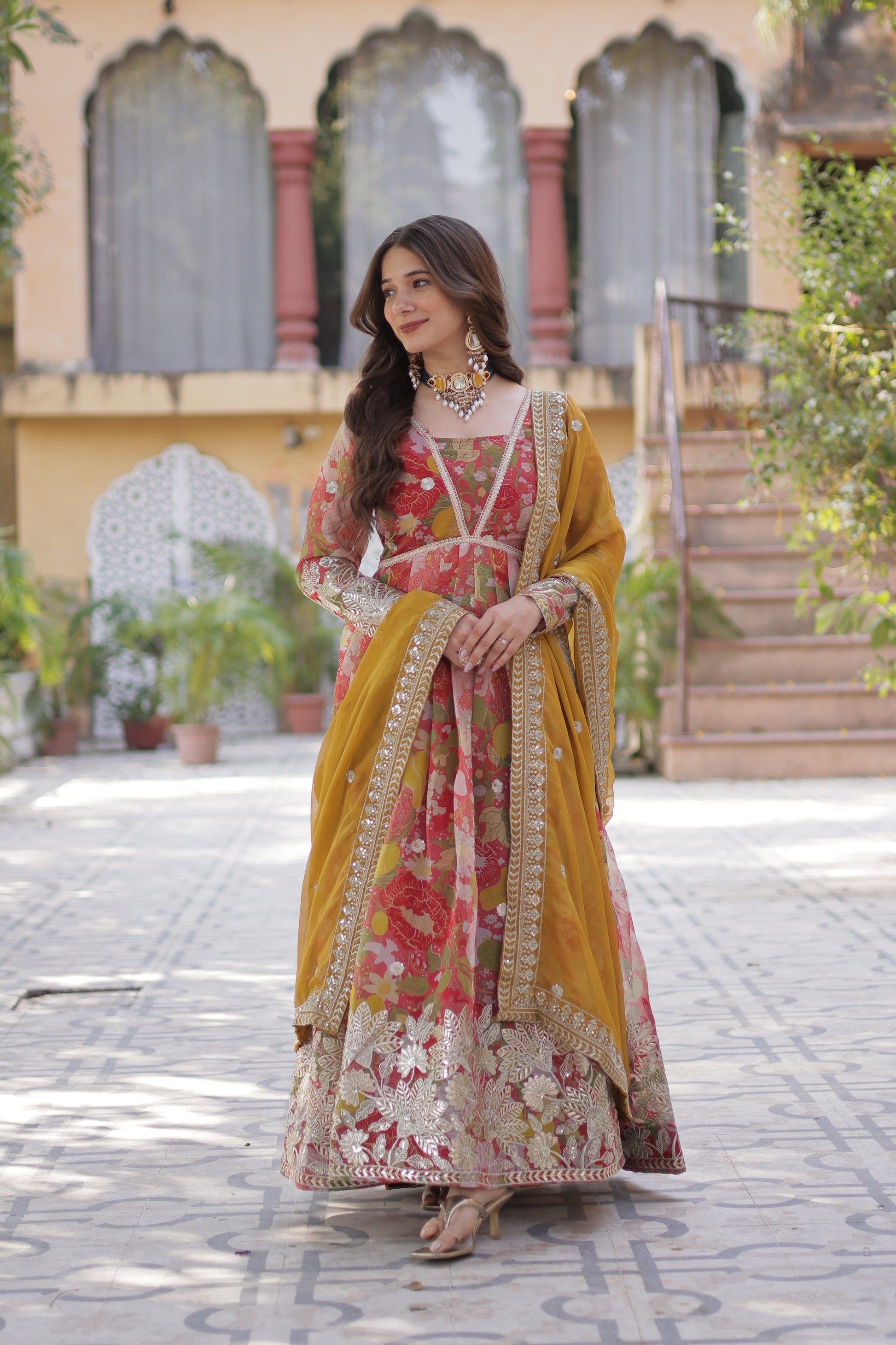 Whether you're searching for a designer Anarkali suit online, red Anarkali for wedding, ready to wear festive wear, or digital print gown set for women, this ensemble ticks every box. Its contemporary yet traditional look fits well in top-ranking search trends like Zari work gowns, foil print festive sets, premium stitched ethnic sets, bridal function outfits, navratri gown collection, and designer Indian dresses for festivals.