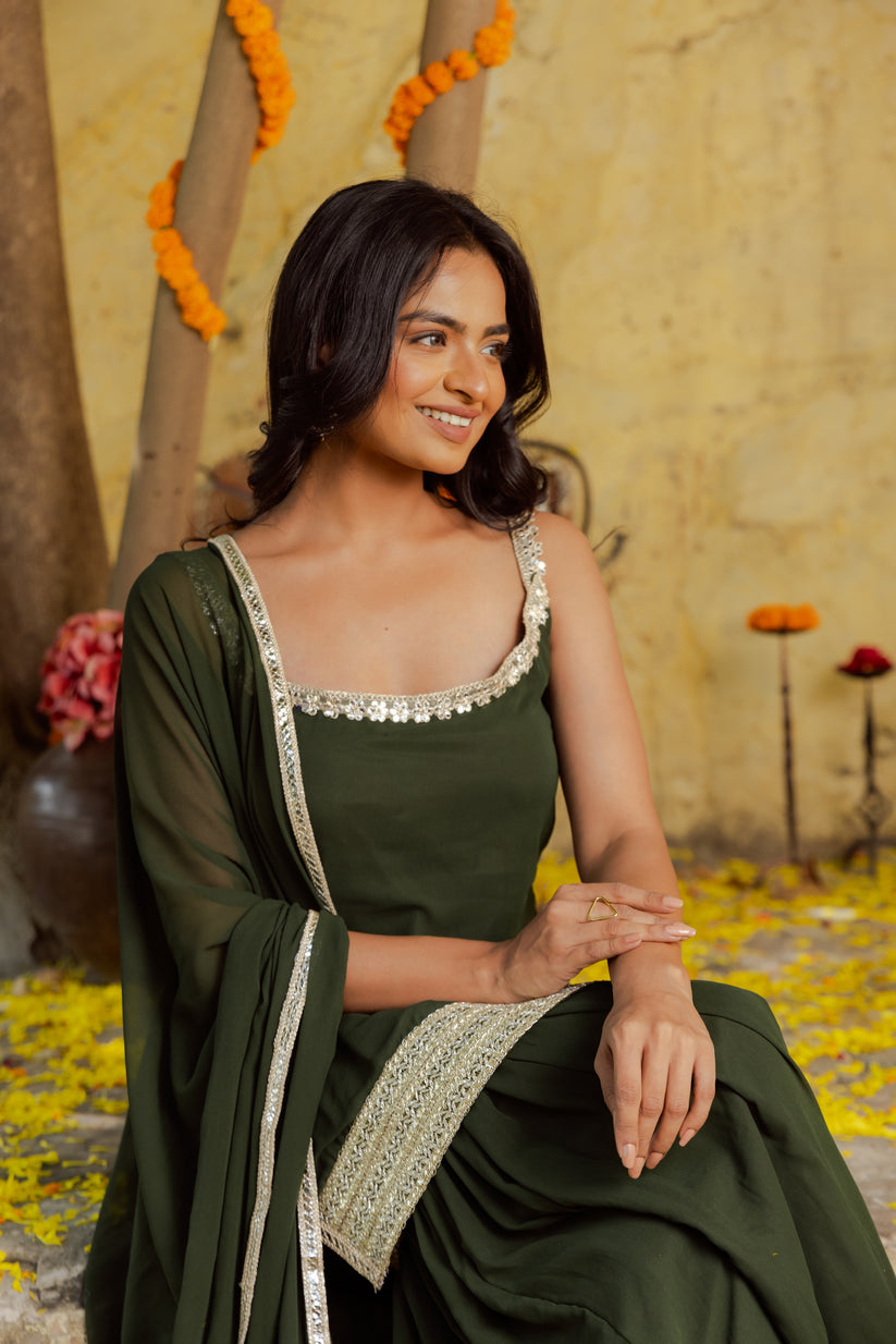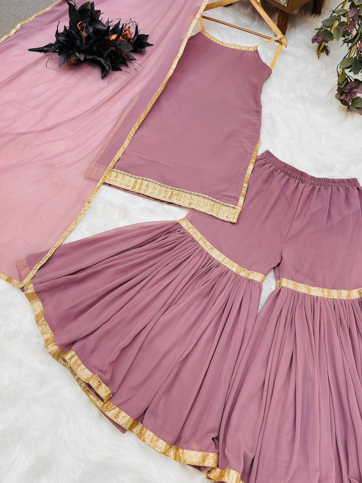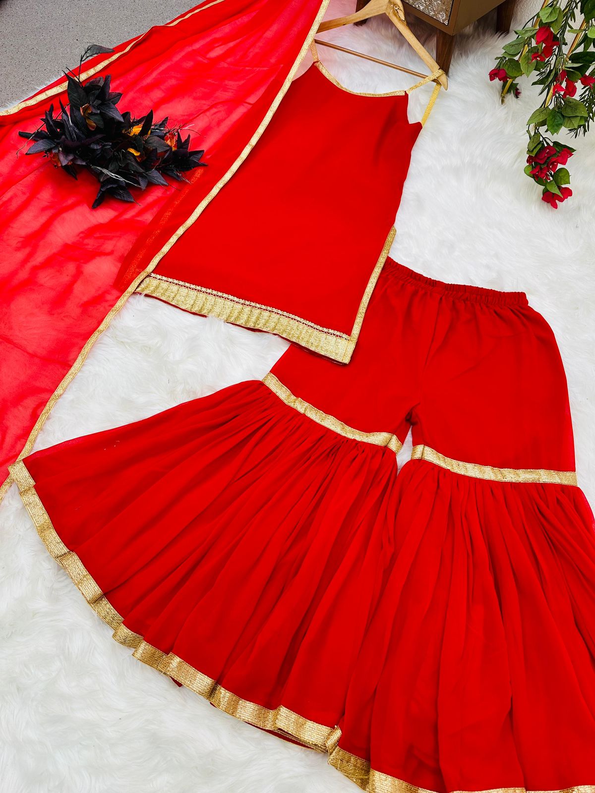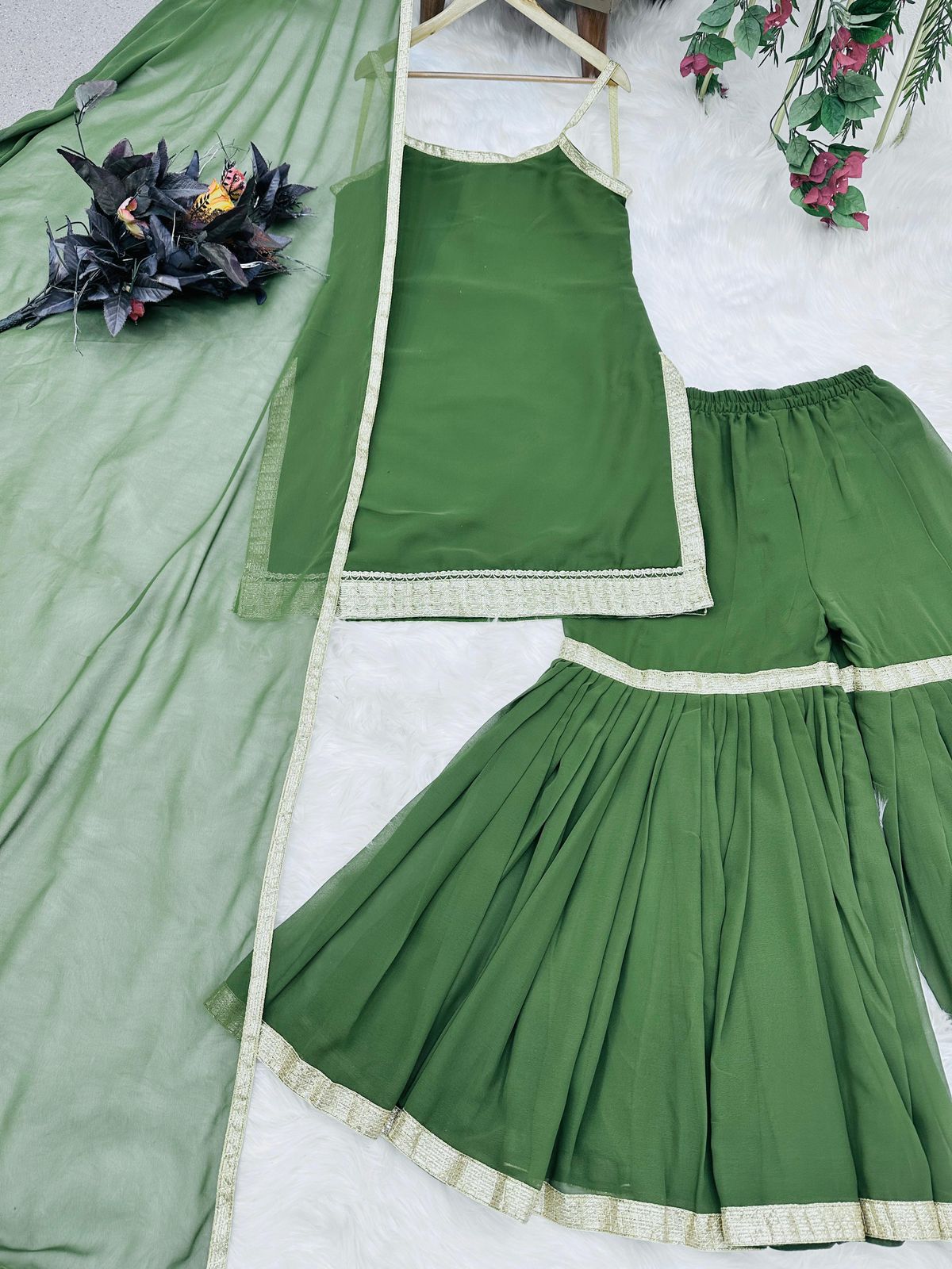 Unleash your graceful elegance with this stunning Set that includes a Suit, Sharara, and Dupatta. Perfect for any occasion, this set will elevate your style and leave a lasting impression. Exude confidence and sophistication, while embracing a playful and quirky tone. (No more than 2 exclamation points, promise!)