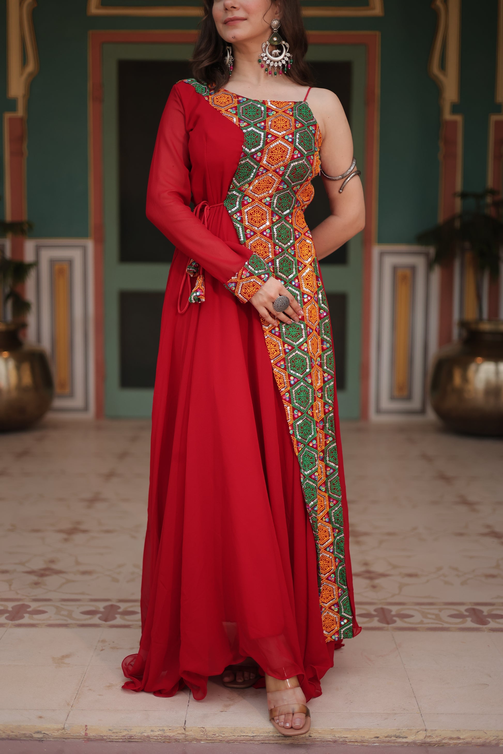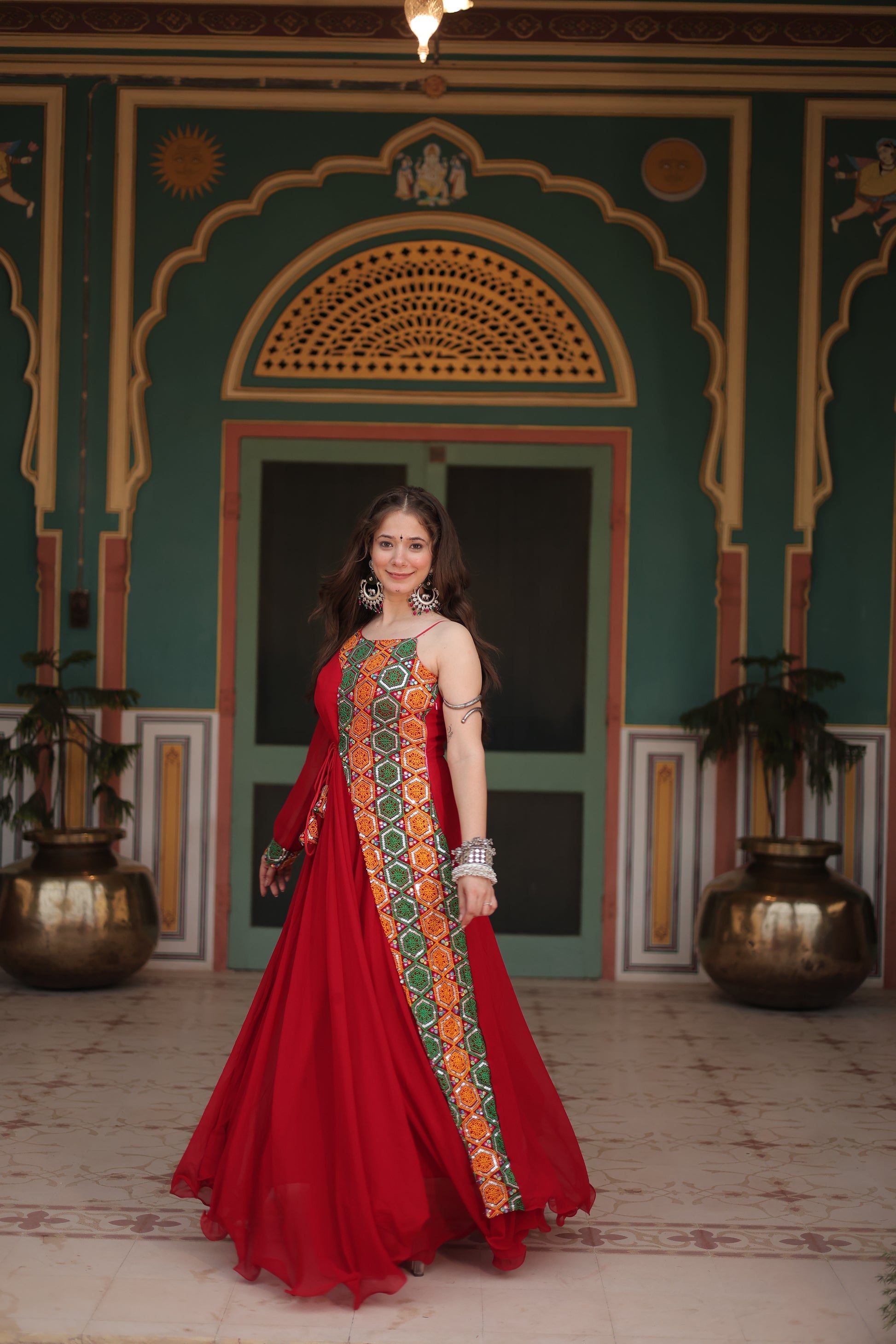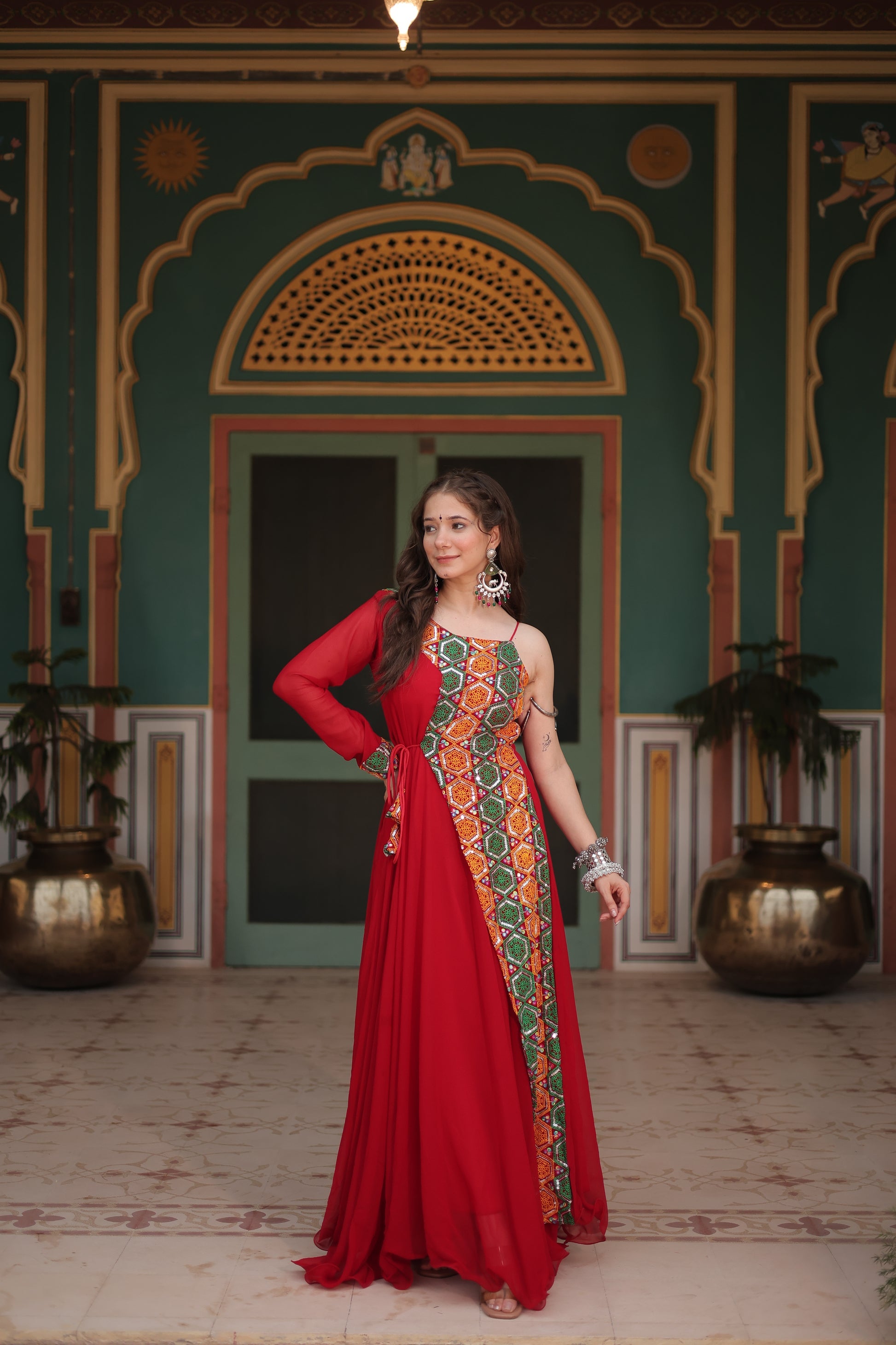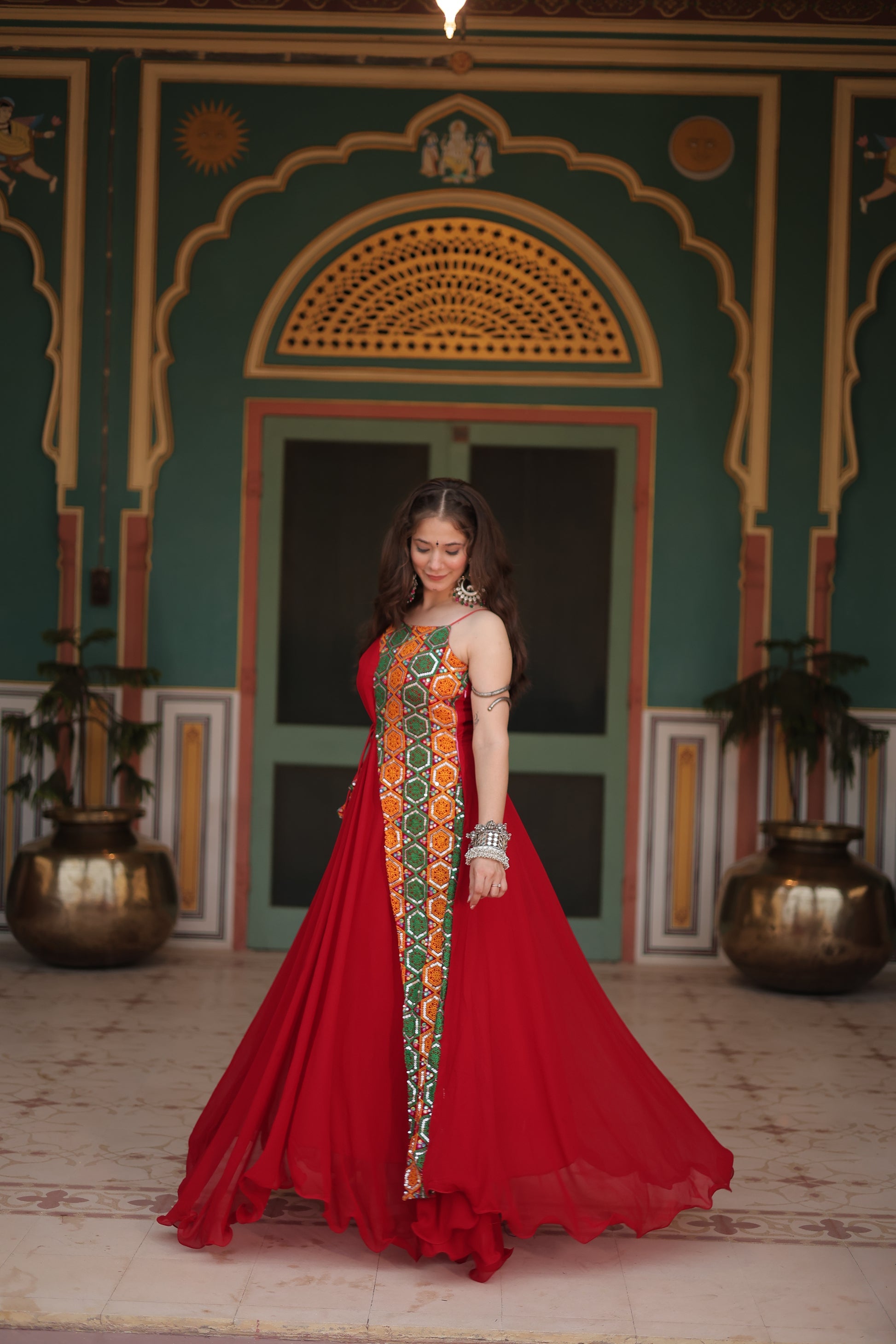 Get ready to turn heads in our Vini Red Georgette Kutchi Gamthi Kodi Work Gown. This stunning piece features intricate embroidery and beautiful design, making you the center of attention at any special occasion. Express your unique style with this playful and alluring gown. (Limited quantities available!)