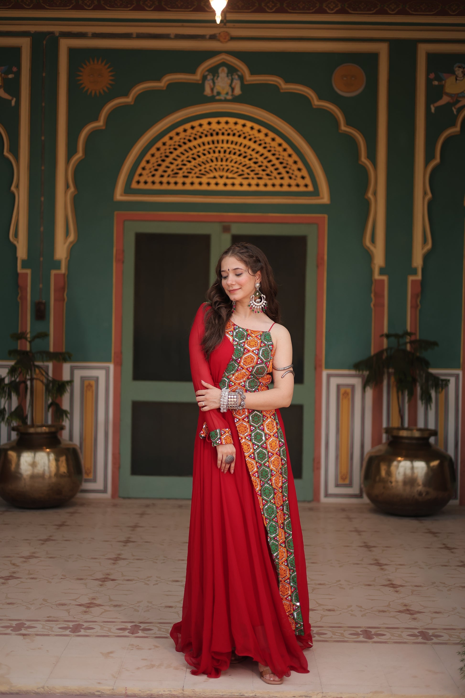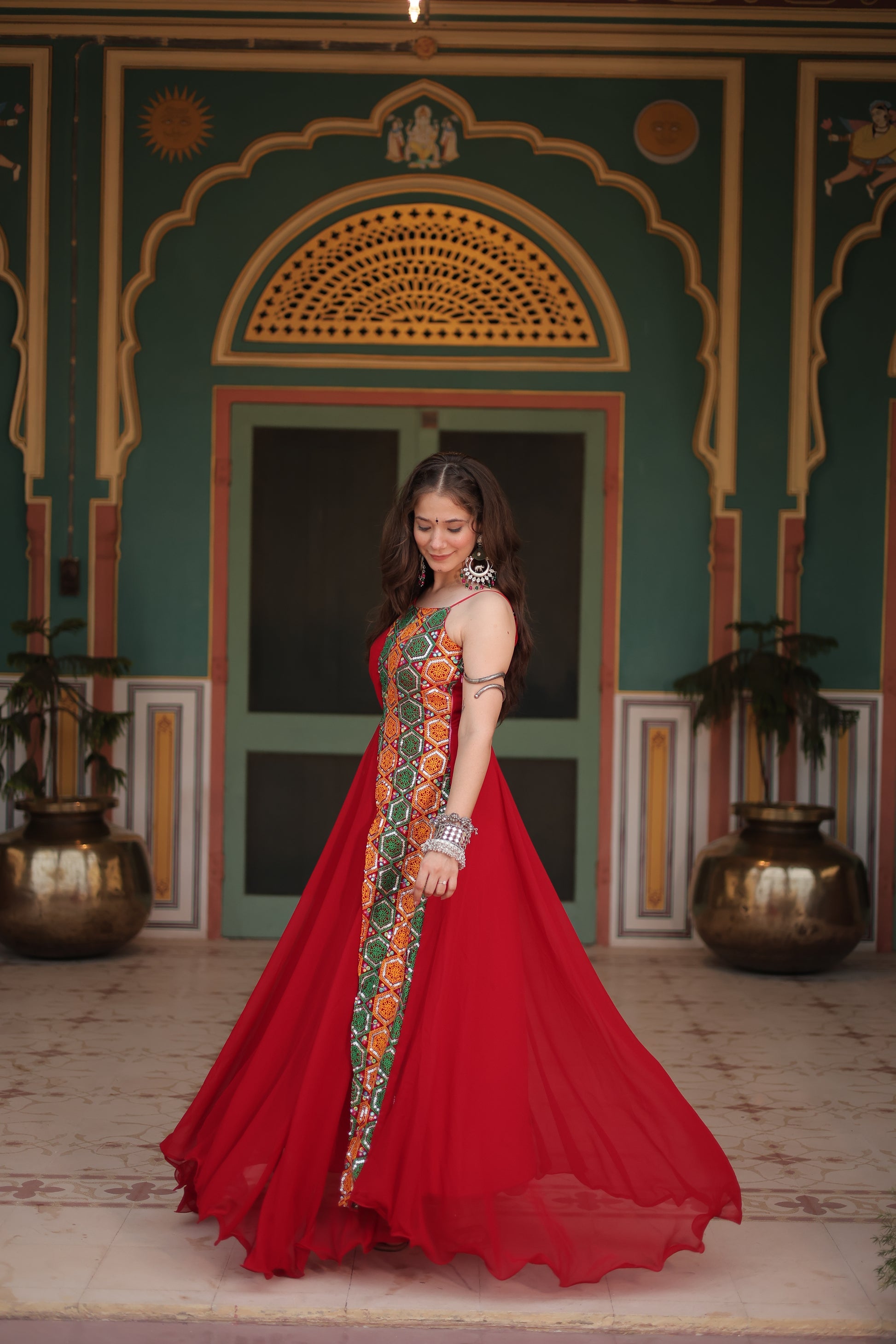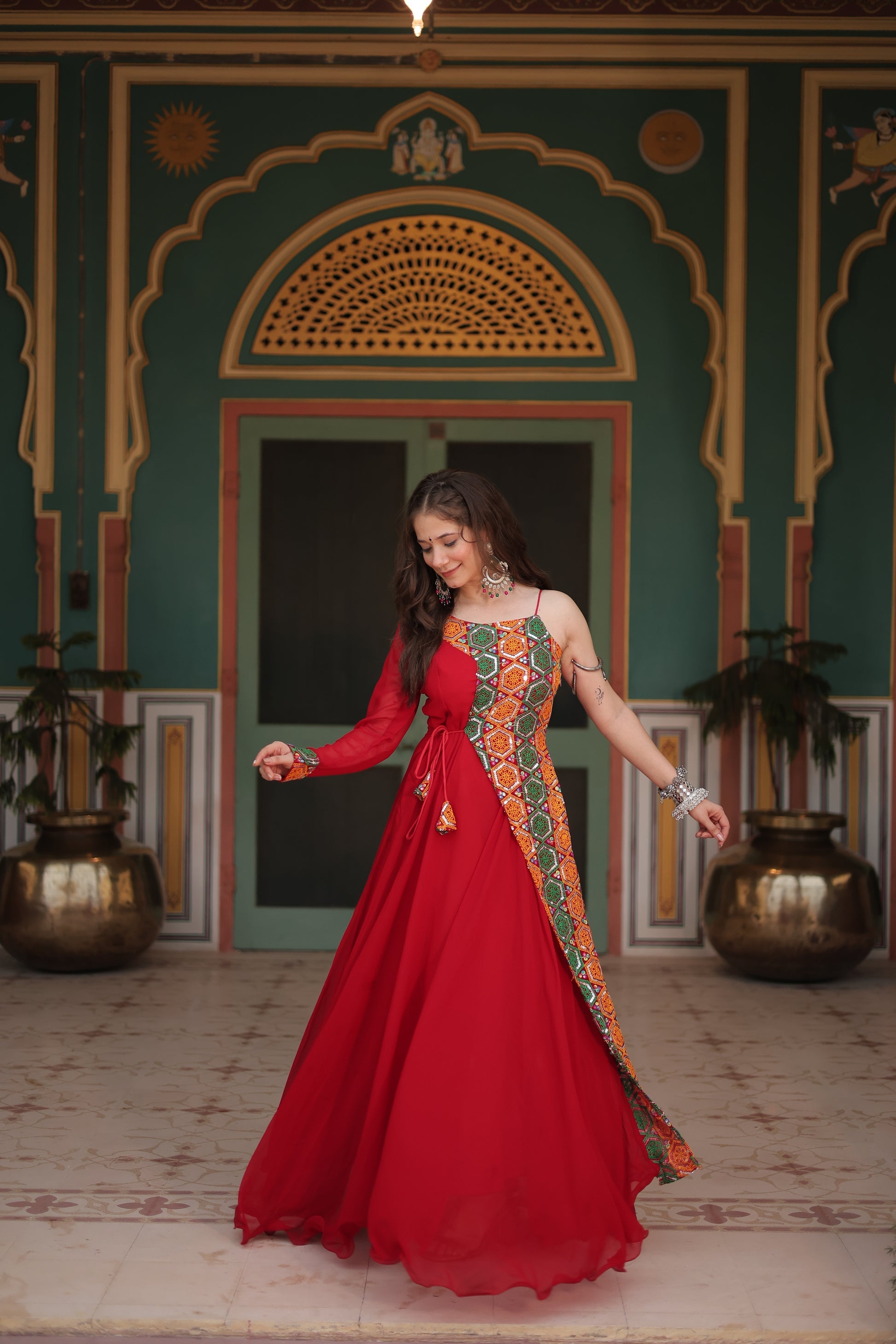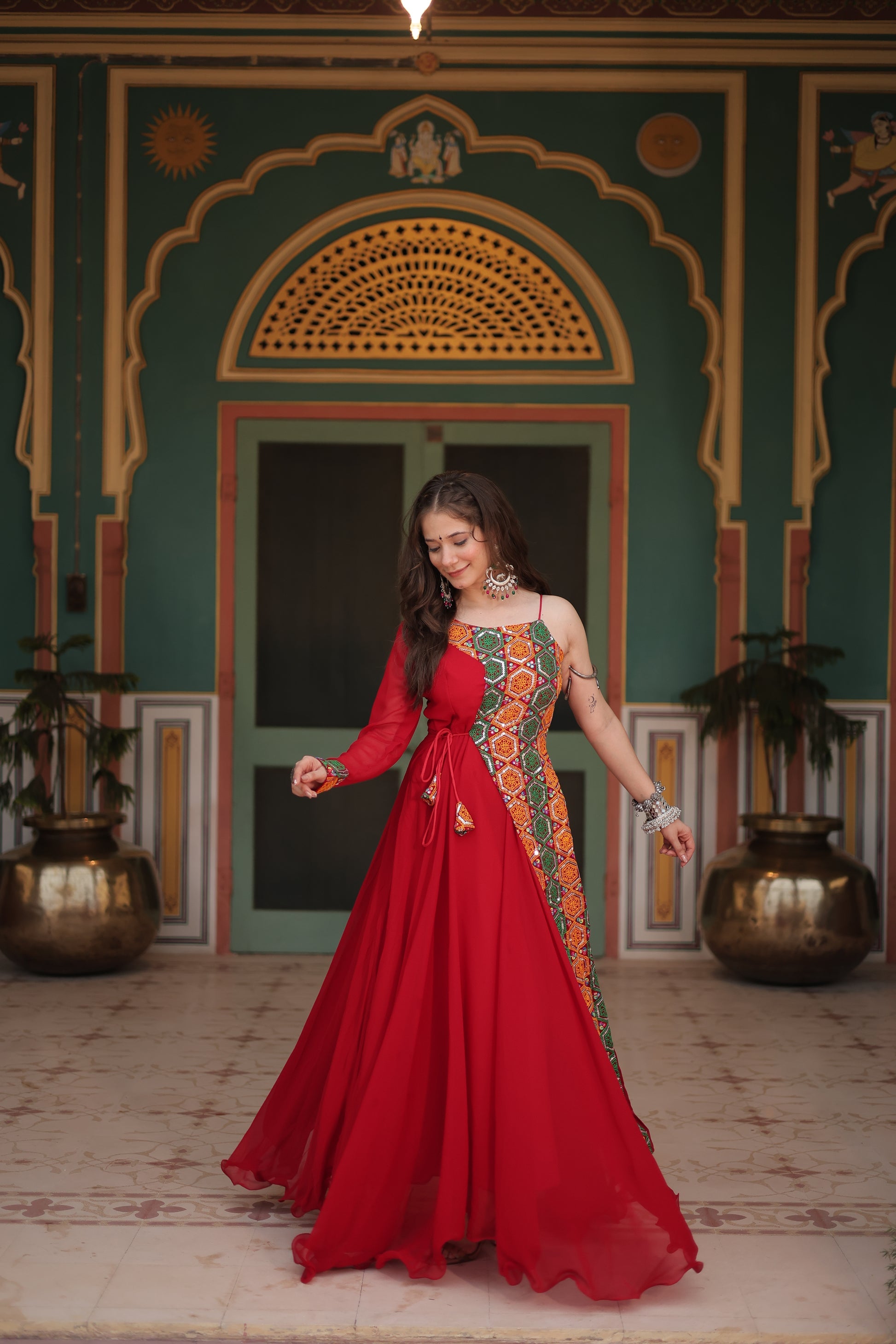 Get ready to turn heads in our Vini Red Georgette Kutchi Gamthi Kodi Work Gown. This stunning piece features intricate embroidery and beautiful design, making you the center of attention at any special occasion. Express your unique style with this playful and alluring gown. (Limited quantities available!)