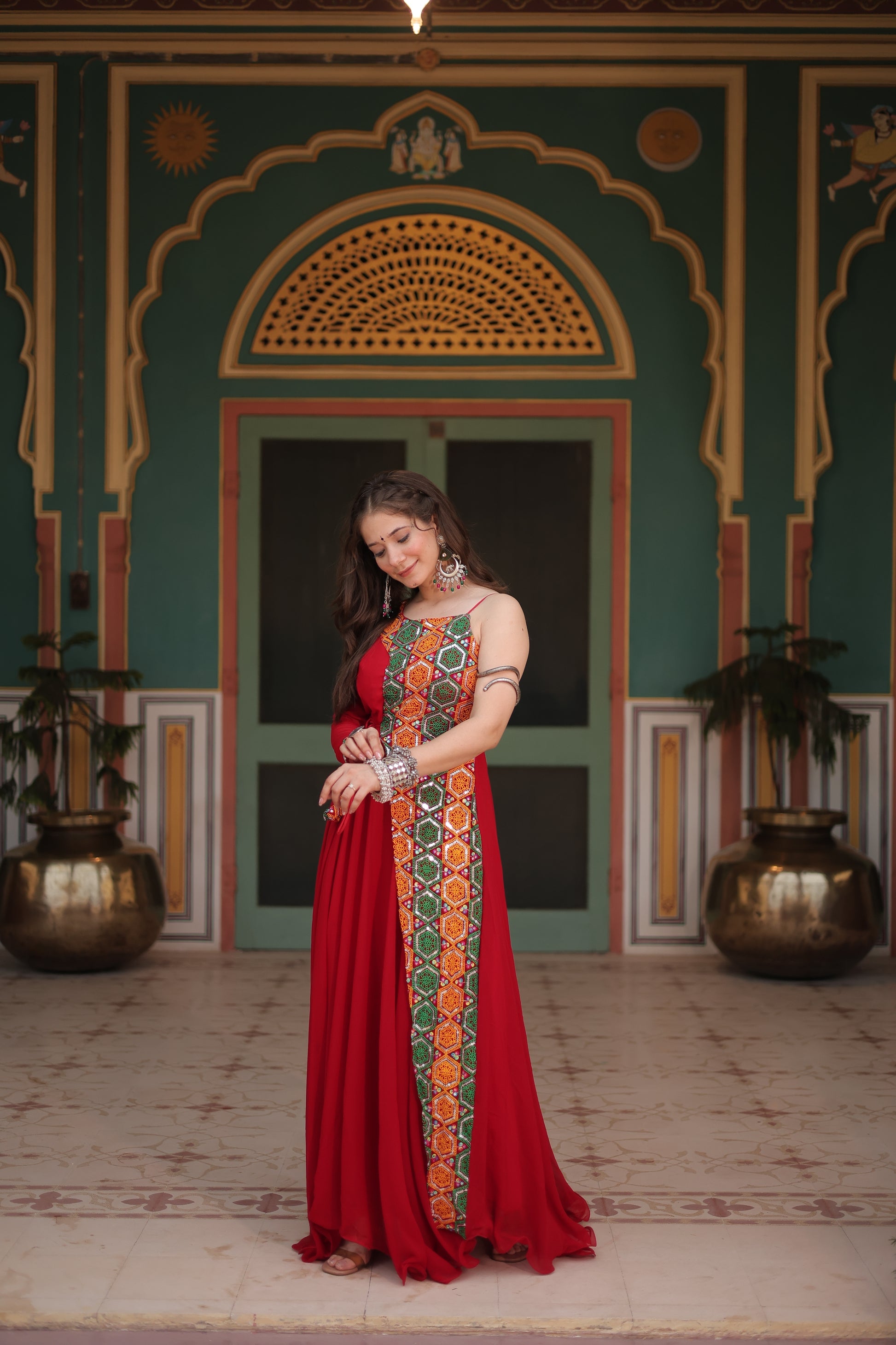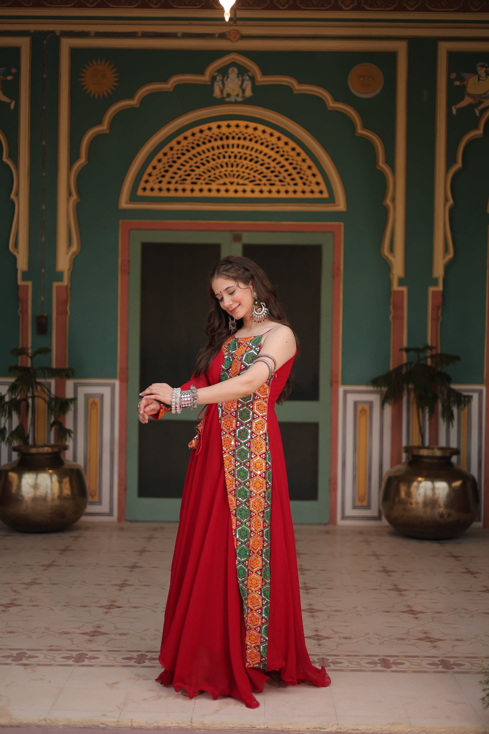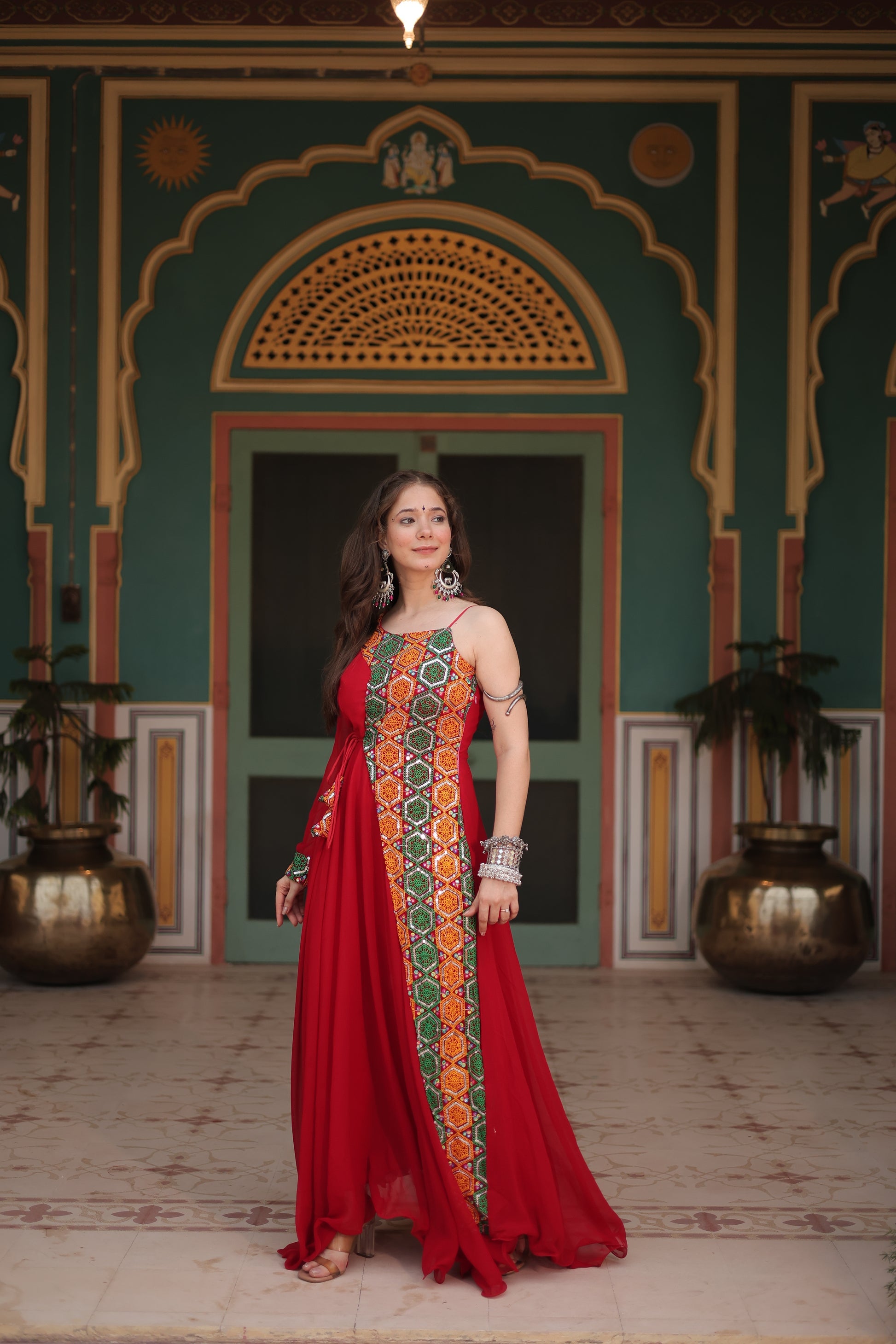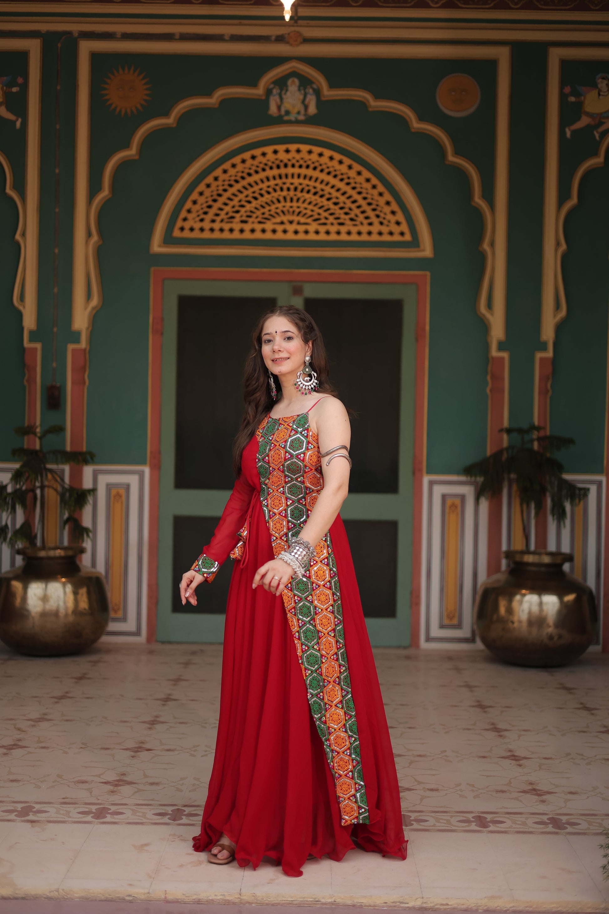 Get ready to turn heads in our Vini Red Georgette Kutchi Gamthi Kodi Work Gown. This stunning piece features intricate embroidery and beautiful design, making you the center of attention at any special occasion. Express your unique style with this playful and alluring gown. (Limited quantities available!)