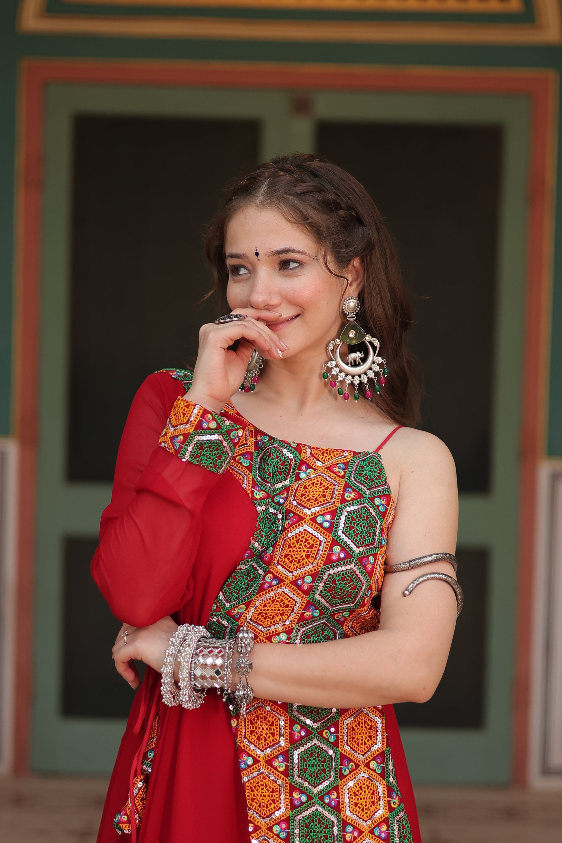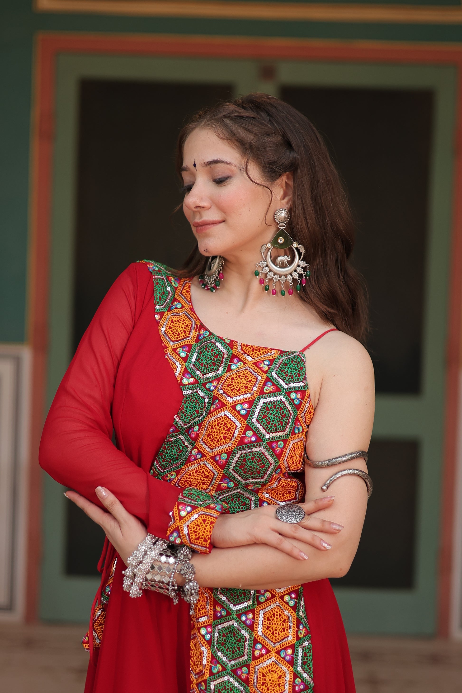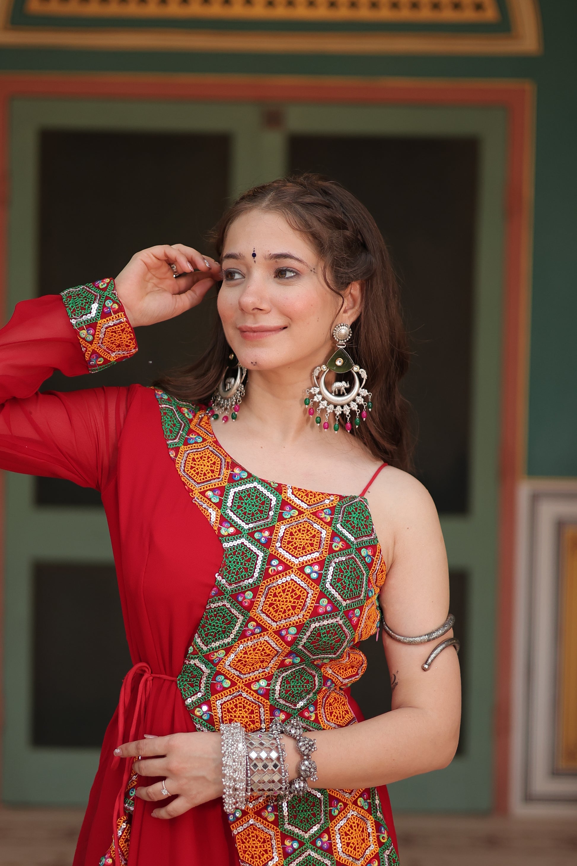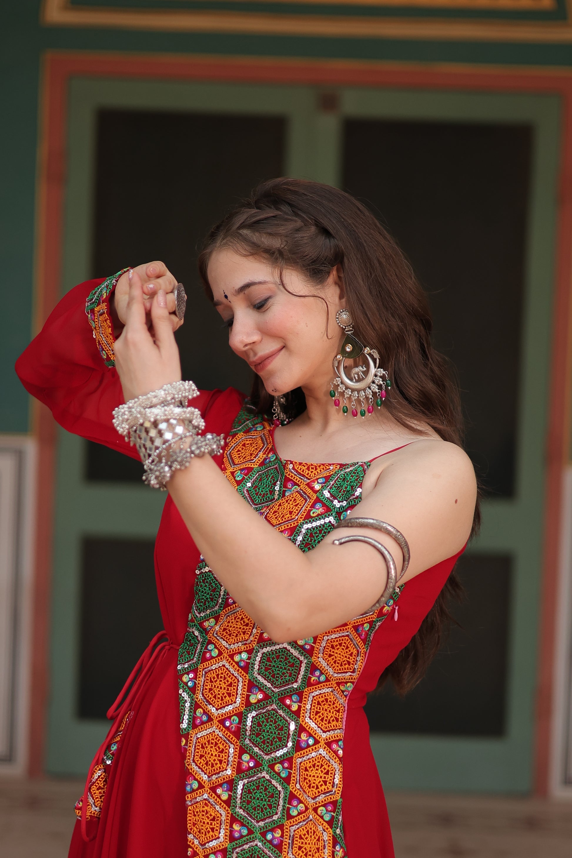 Get ready to turn heads in our Vini Red Georgette Kutchi Gamthi Kodi Work Gown. This stunning piece features intricate embroidery and beautiful design, making you the center of attention at any special occasion. Express your unique style with this playful and alluring gown. (Limited quantities available!)