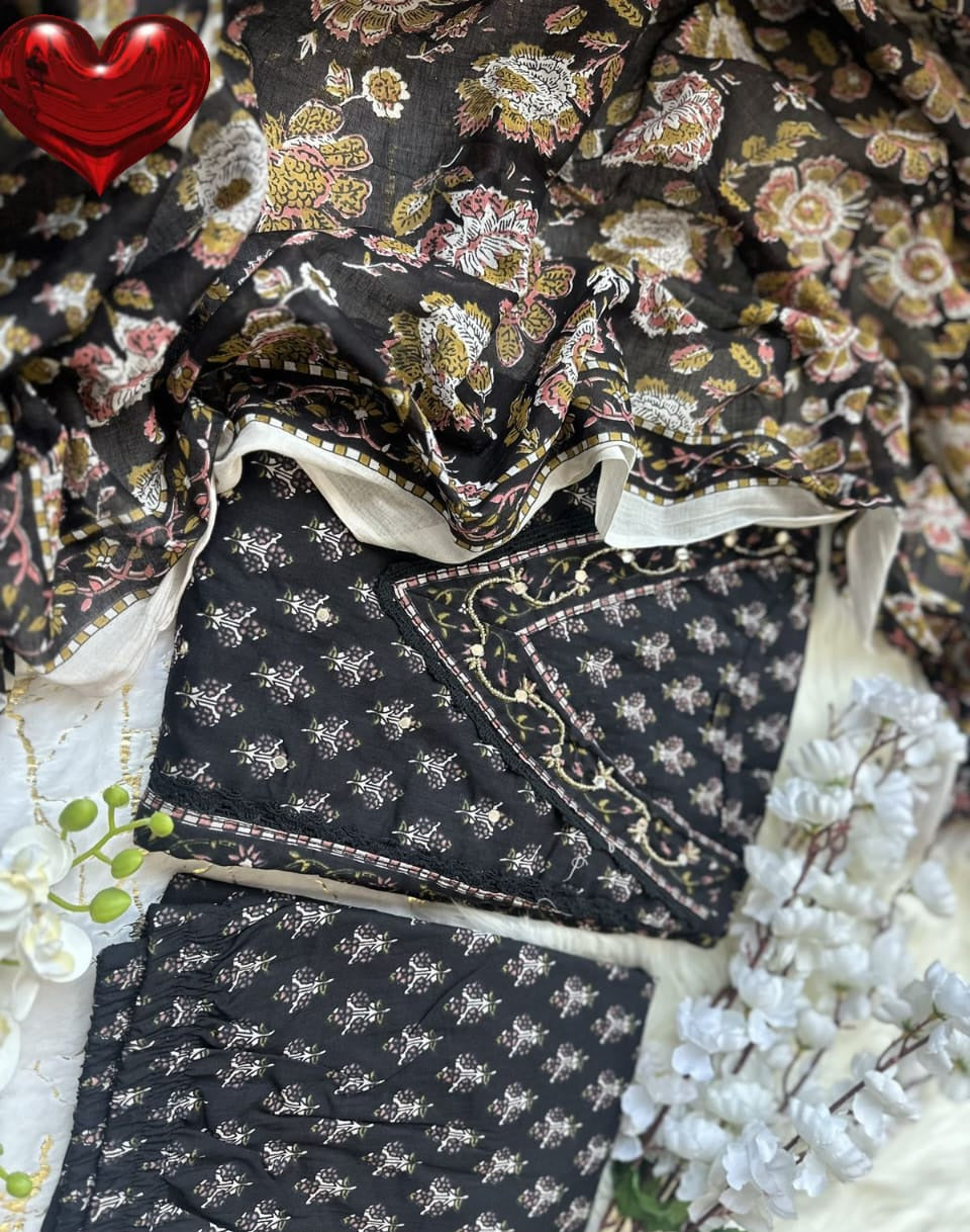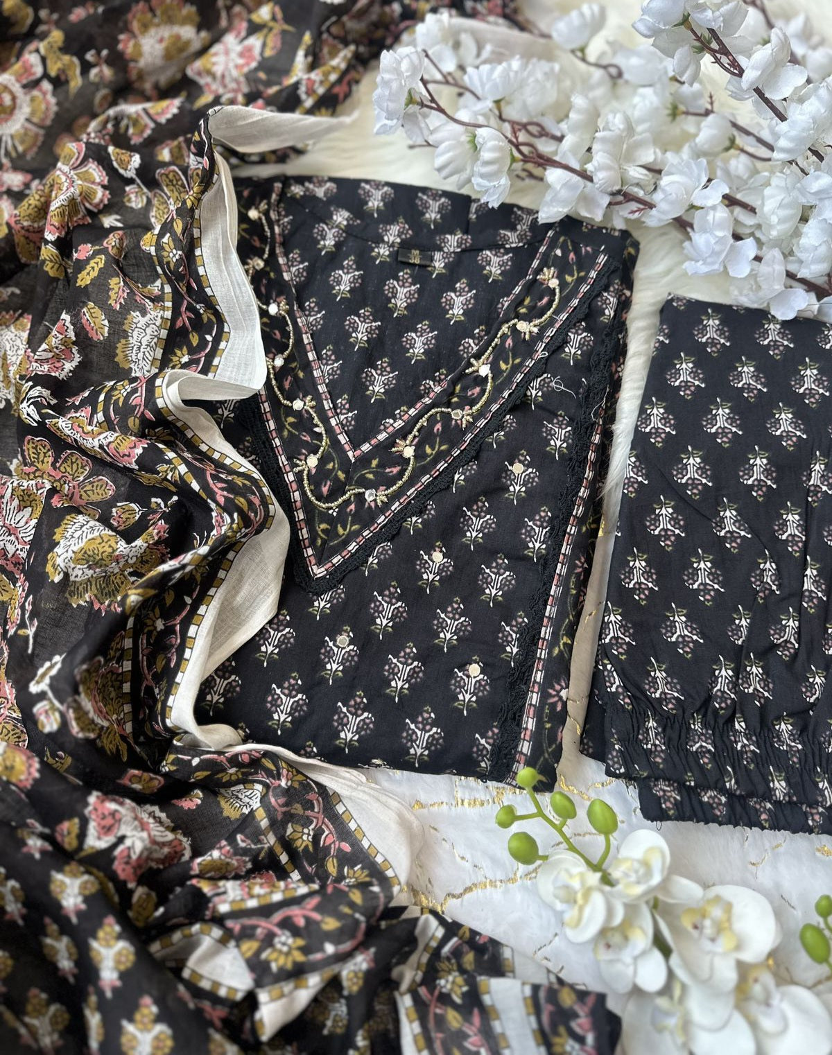Experience effortless elegance with the Ishani Black Cotton Printed Anarkali Suit Set. Crafted with soft and comfortable cotton, this suit set features a stylish and intricate print for a unique look. Perfect for any occasion, it offers both comfort and style for a confident and fashionable statement.