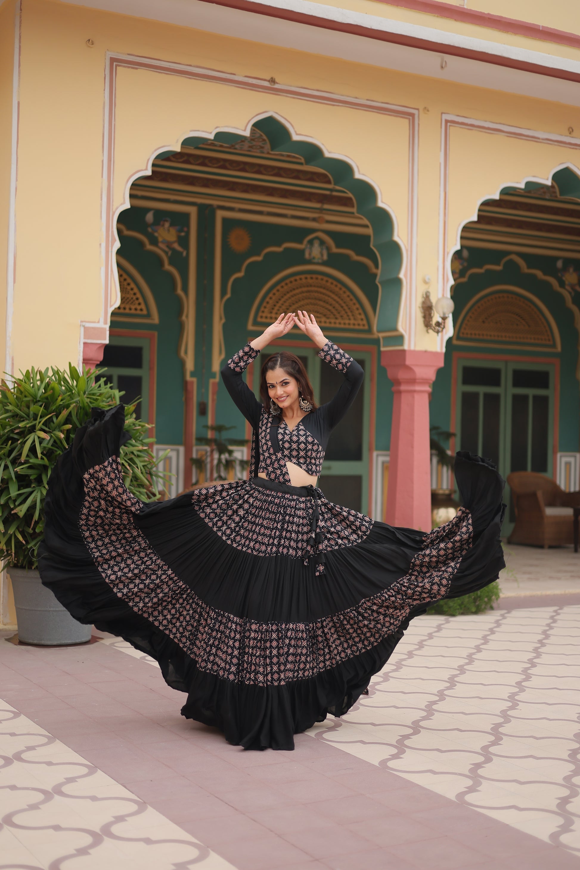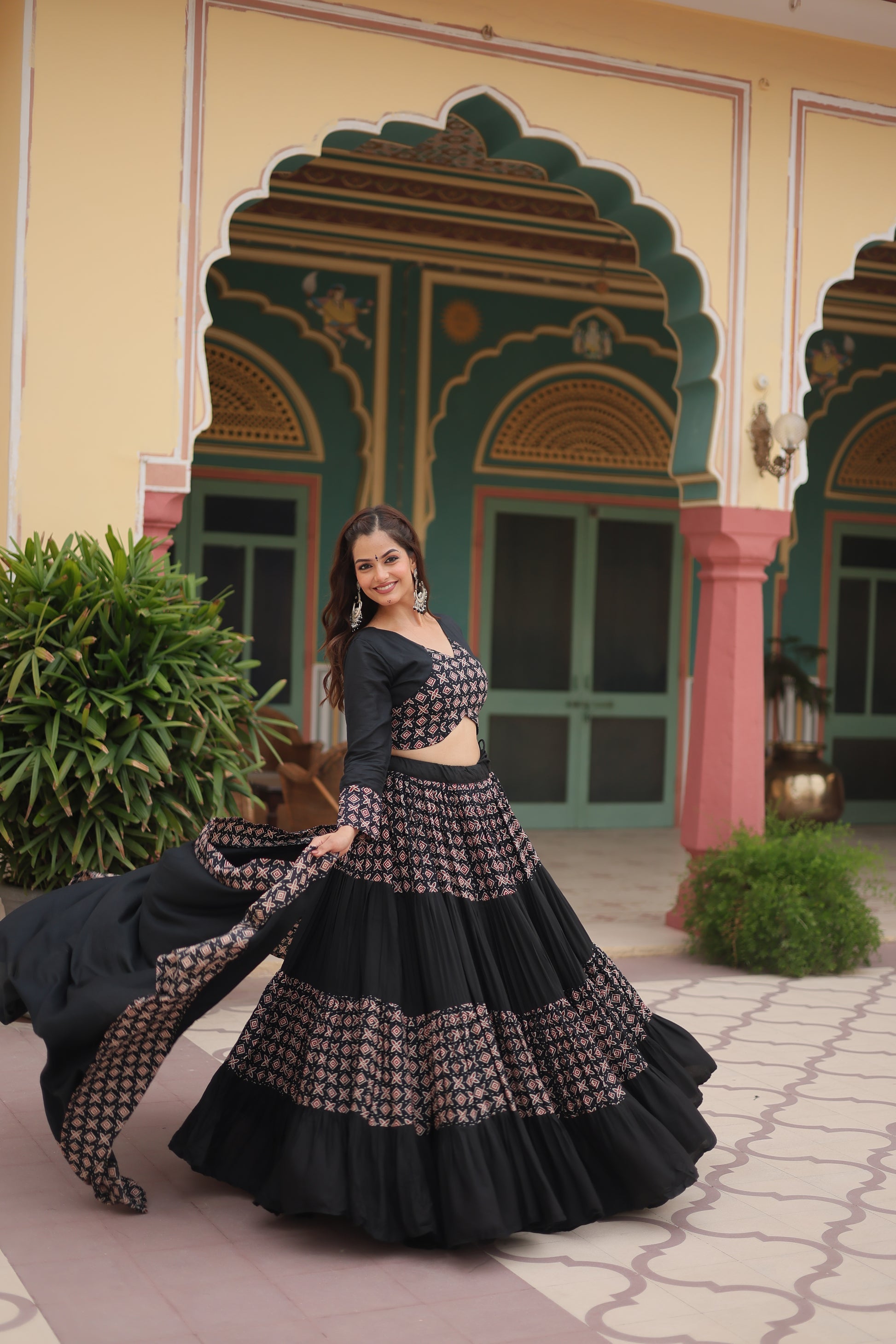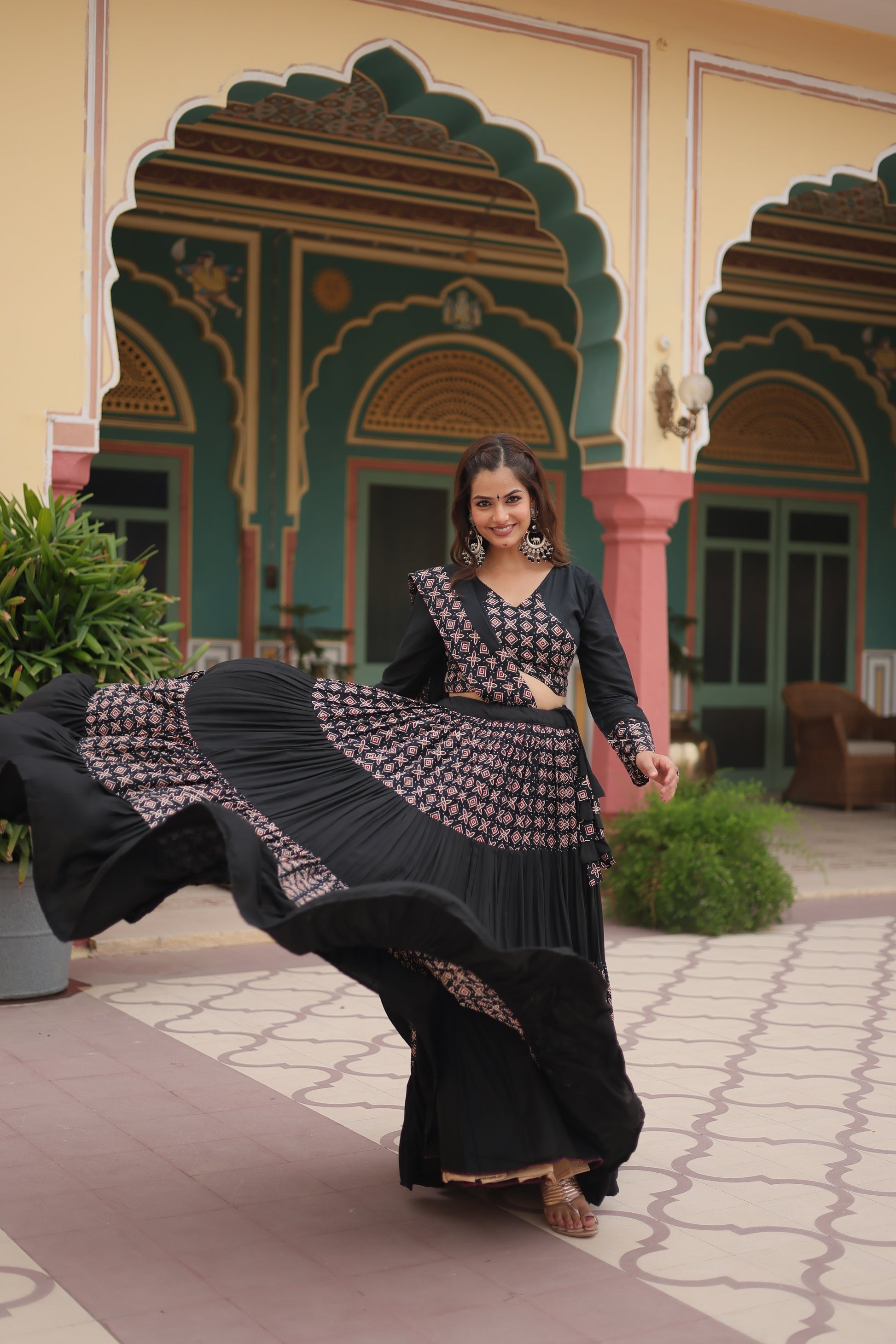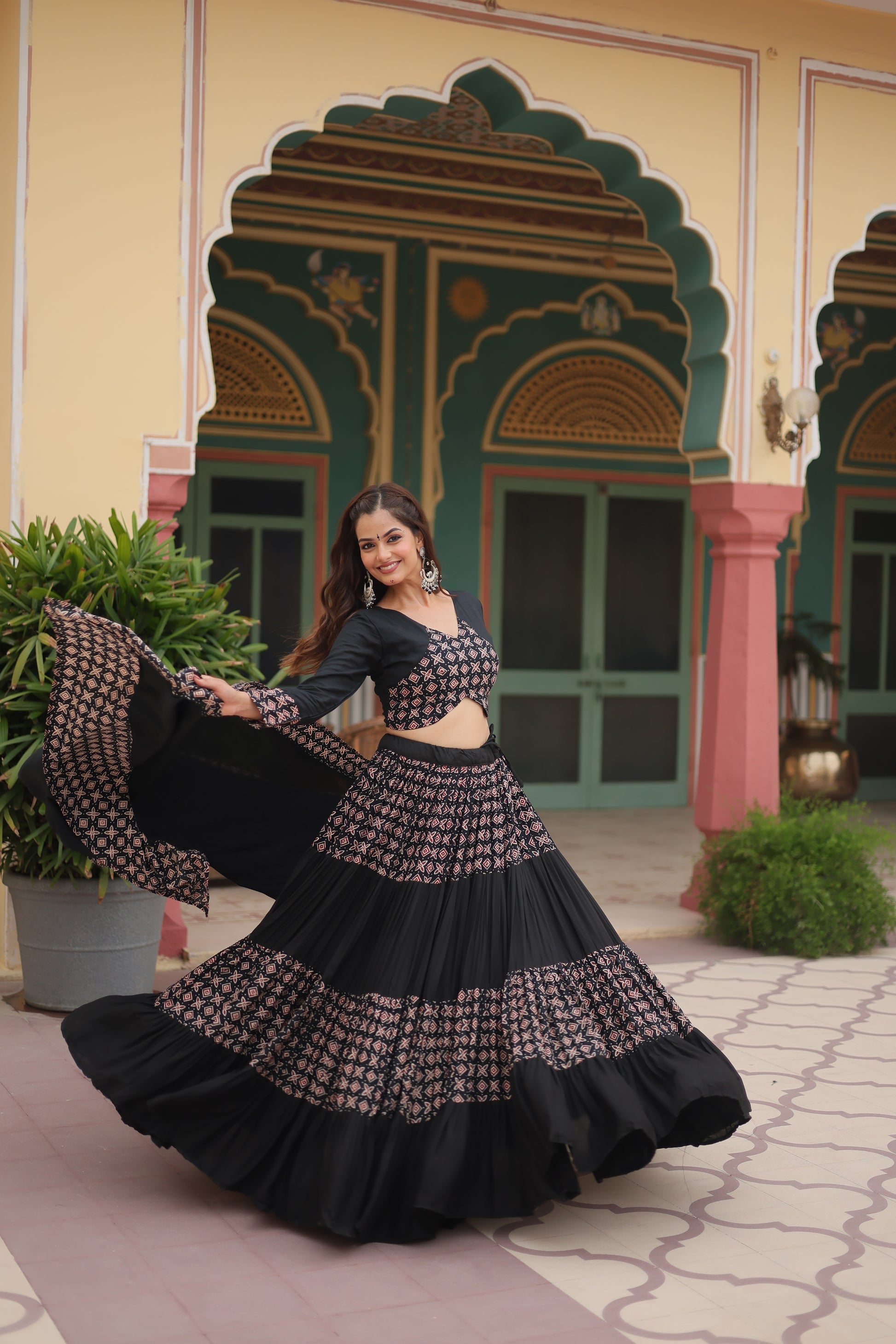Introducing the Reya Black Rayon Printed Navratri Lehanga Choli! This stunning traditional piece is made of high-quality rayon material and features a unique printed design, perfect for the festive occasion of Navratri. With its elegant style and comfortable fit, you'll feel confident and stylish while celebrating. Don't miss out on this must-have addition to your wardrobe.