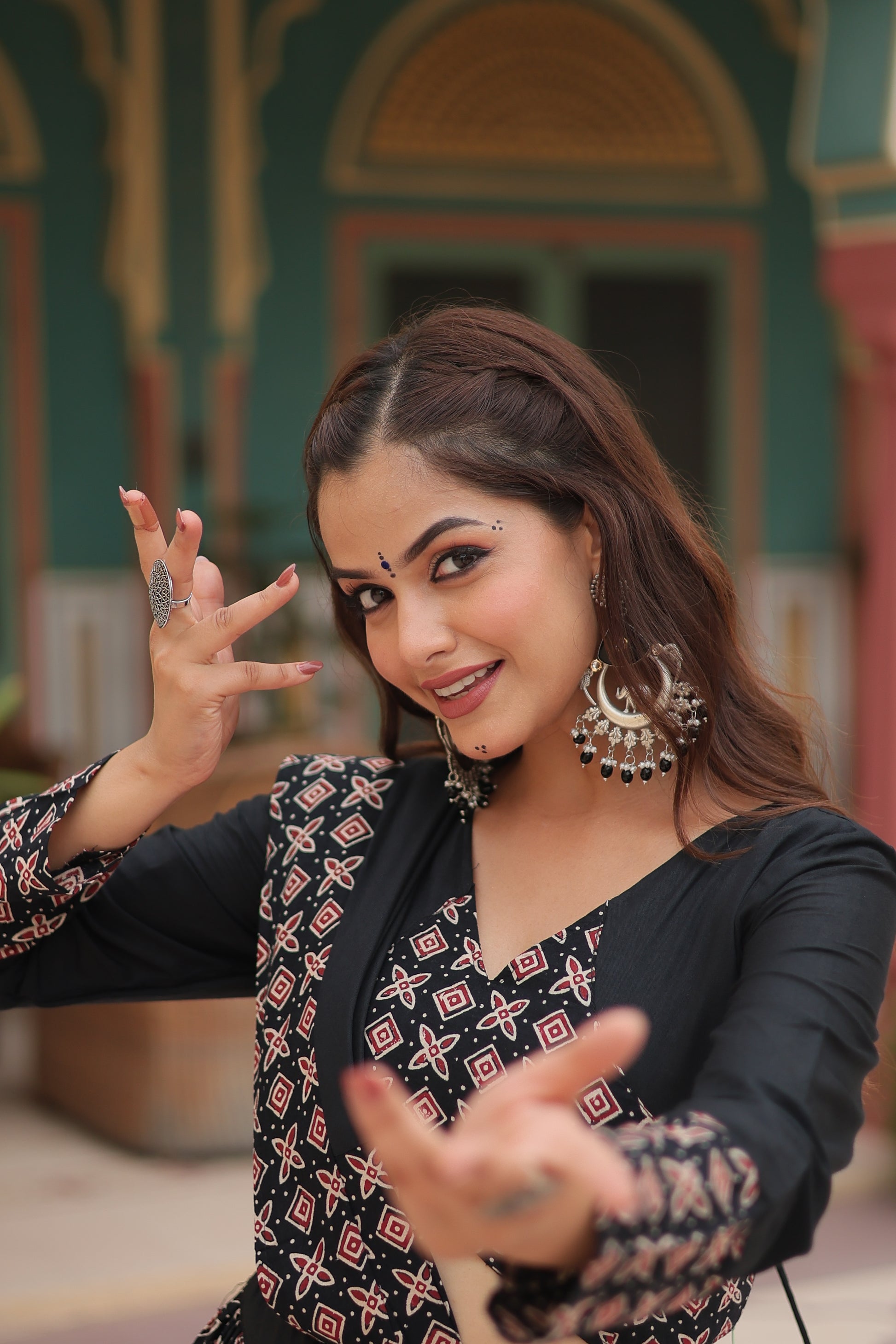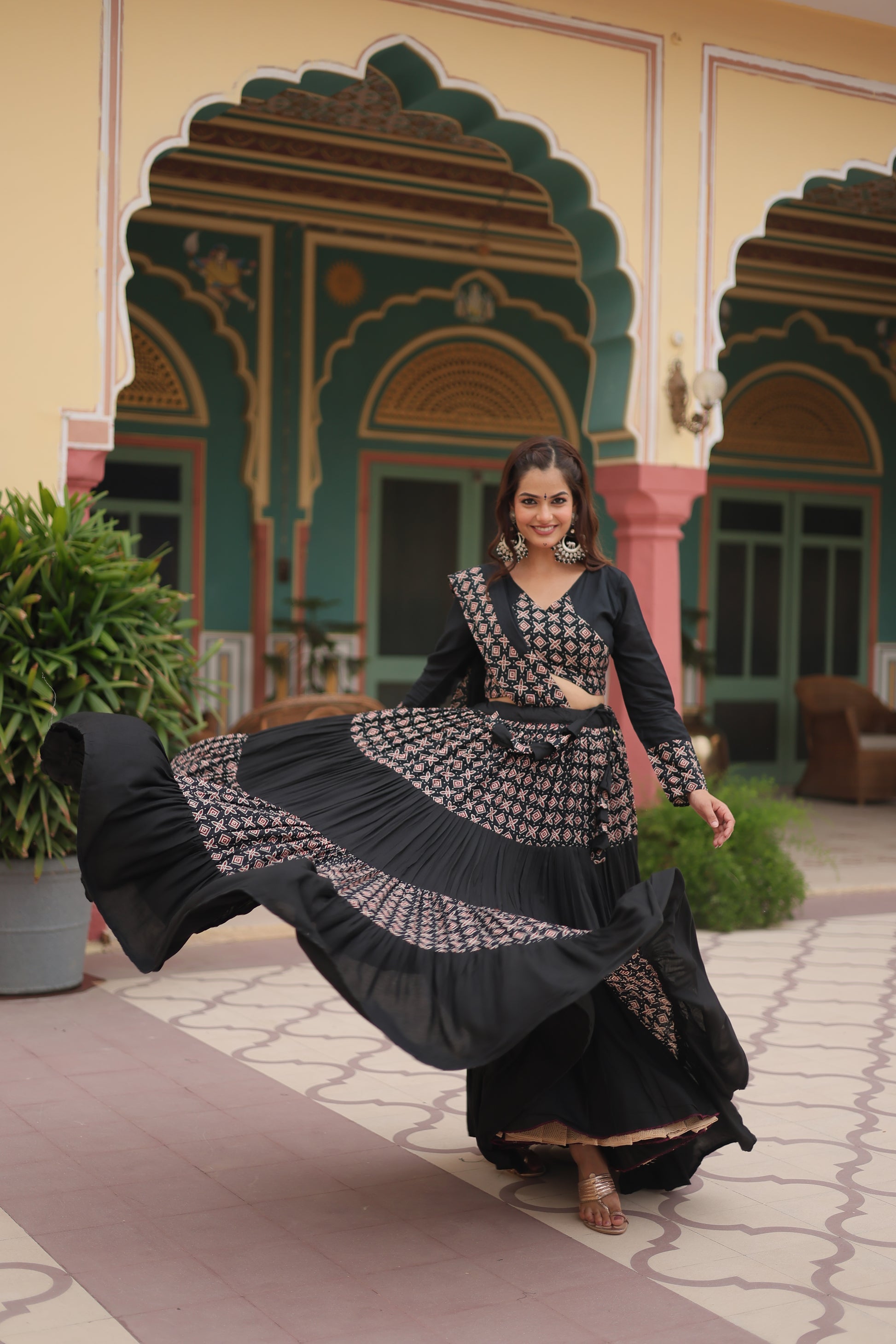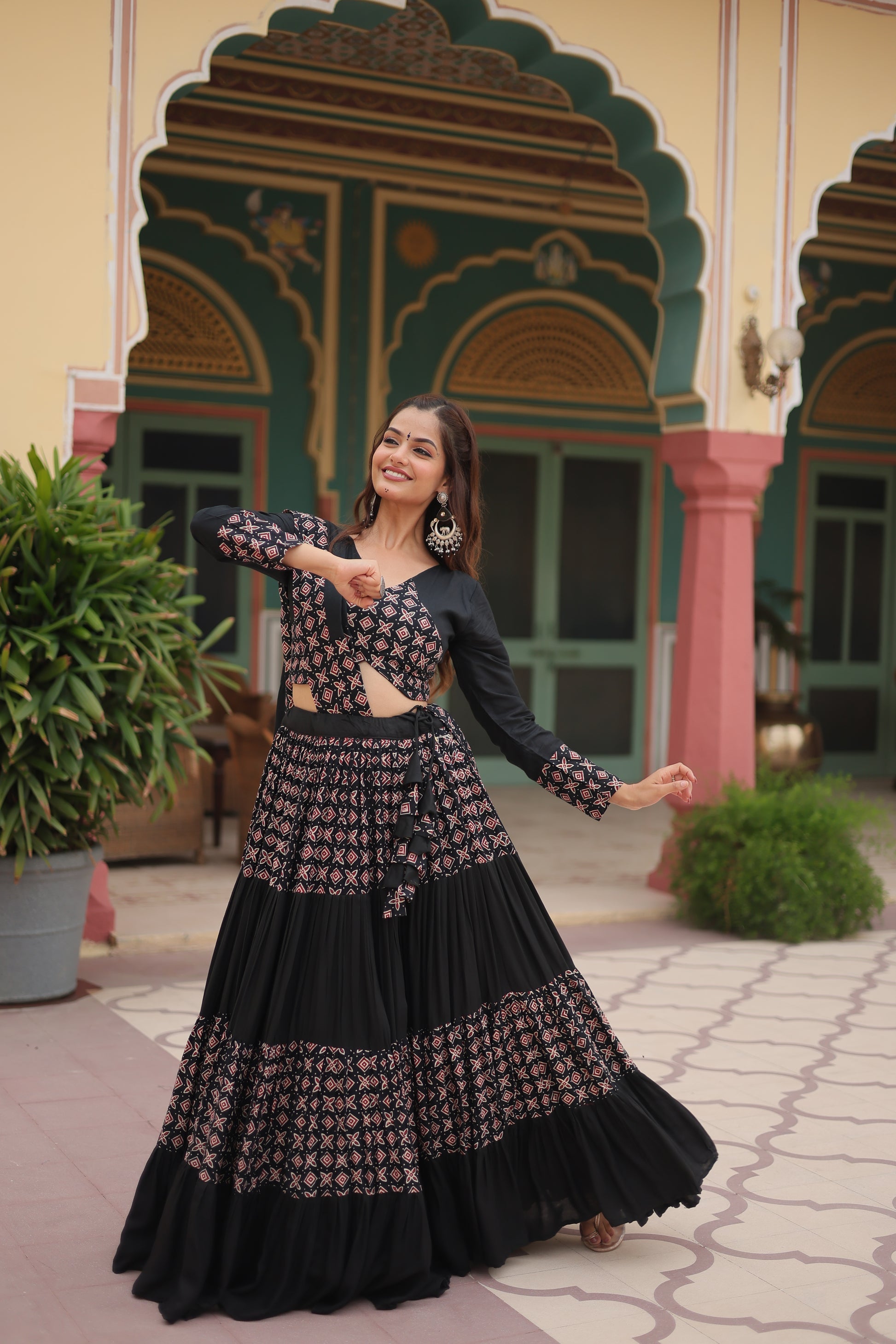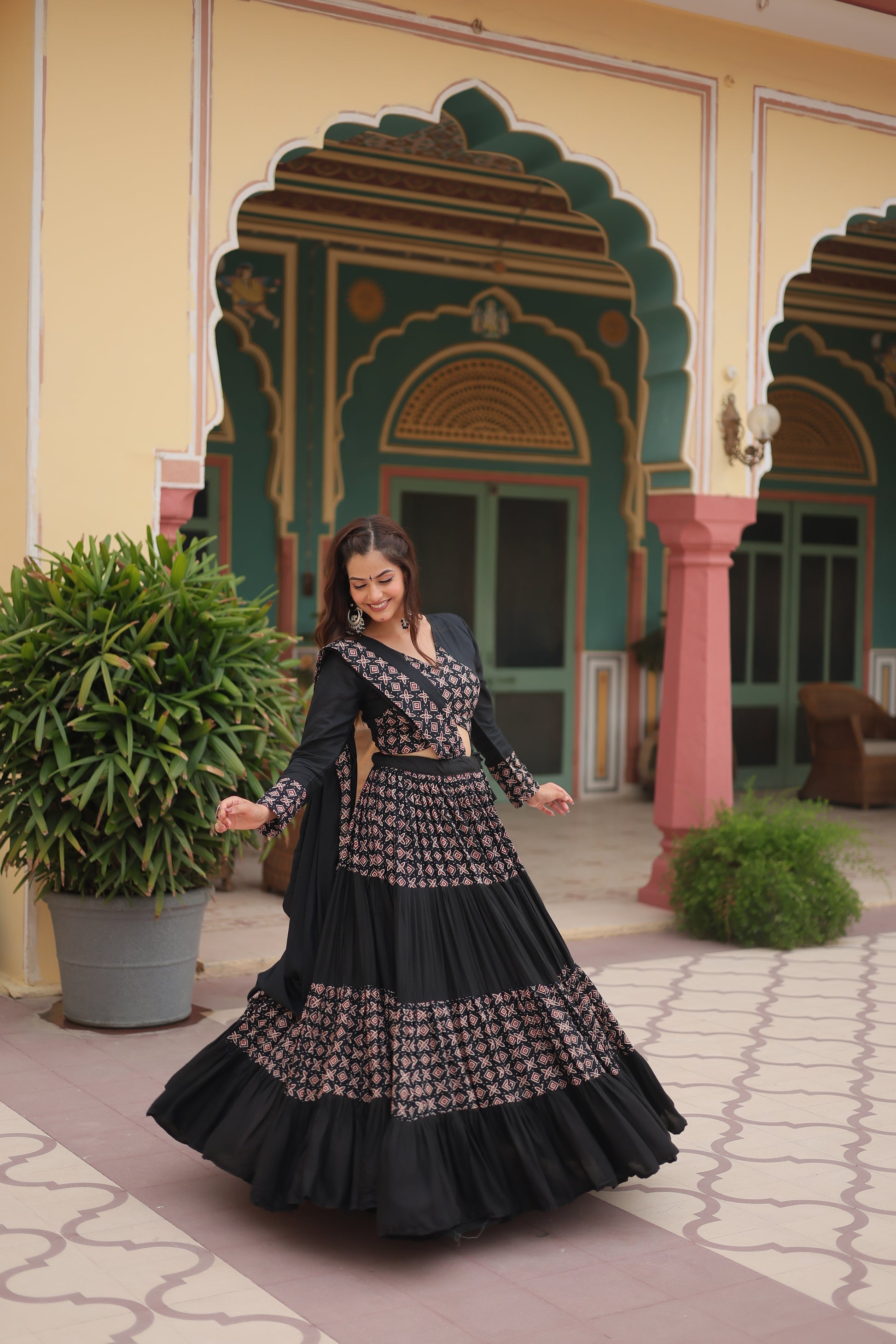 Introducing the Reya Black Rayon Printed Navratri Lehanga Choli! This stunning traditional piece is made of high-quality rayon material and features a unique printed design, perfect for the festive occasion of Navratri. With its elegant style and comfortable fit, you'll feel confident and stylish while celebrating. Don't miss out on this must-have addition to your wardrobe.