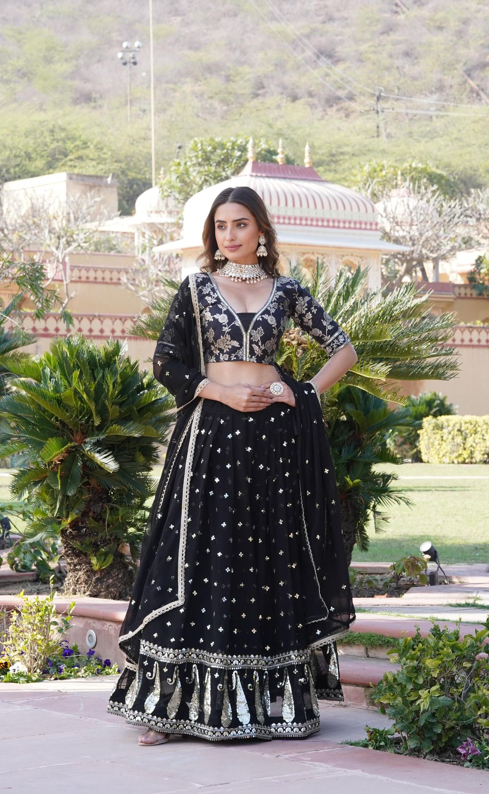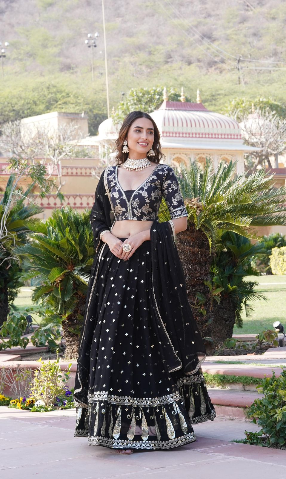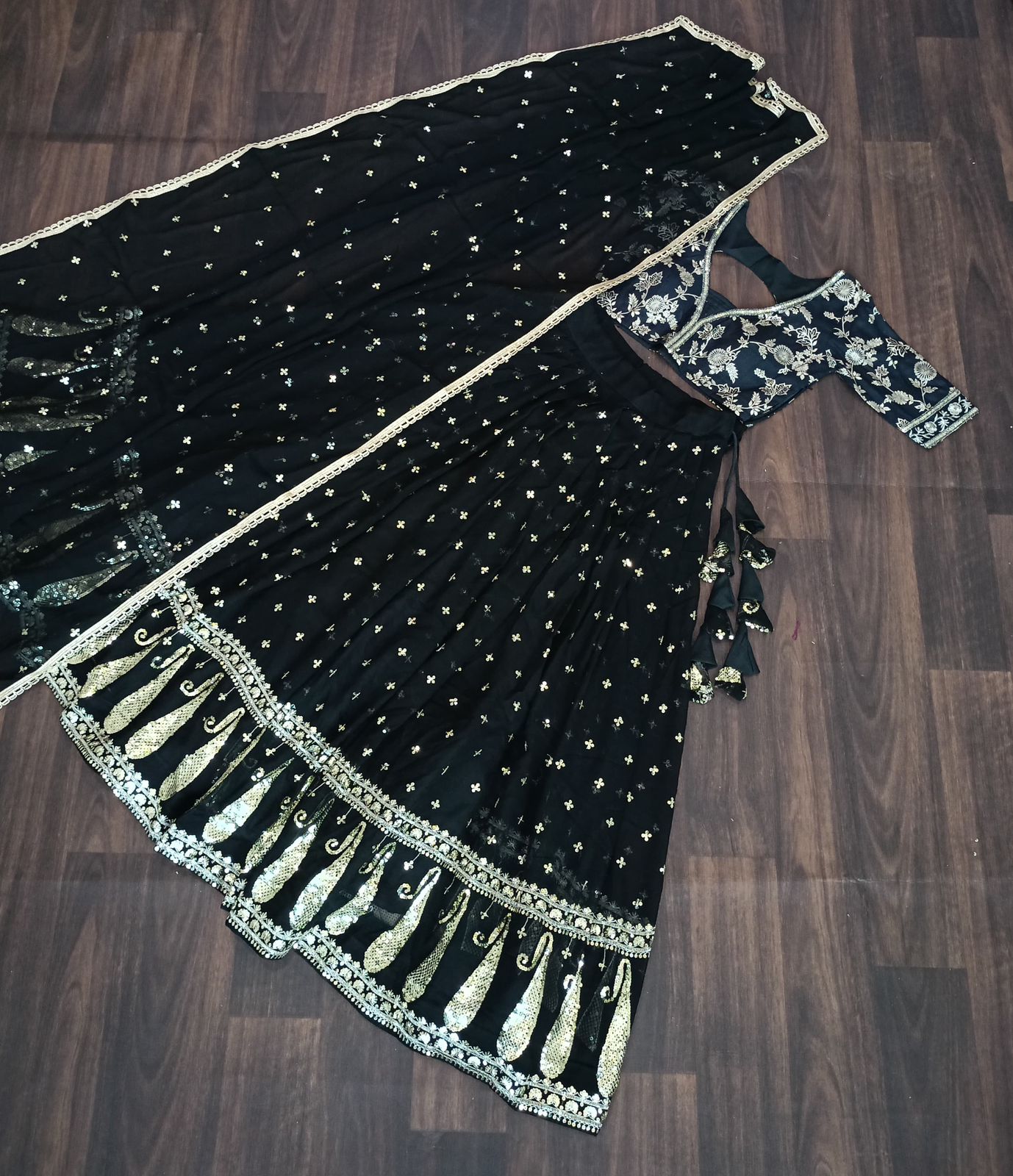 Discover elegance and charm with our Vrinda Black Sequence Embroidered Lehenga Set. This intricately designed lehenga set features delicate embroidery and sparkling sequins, perfect for any special occasion. Elevate your look with this stunning ensemble and make a statement wherever you go.