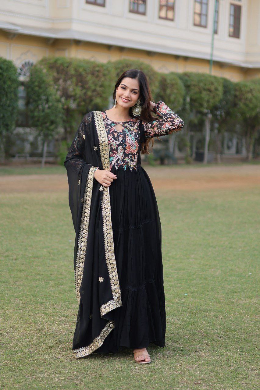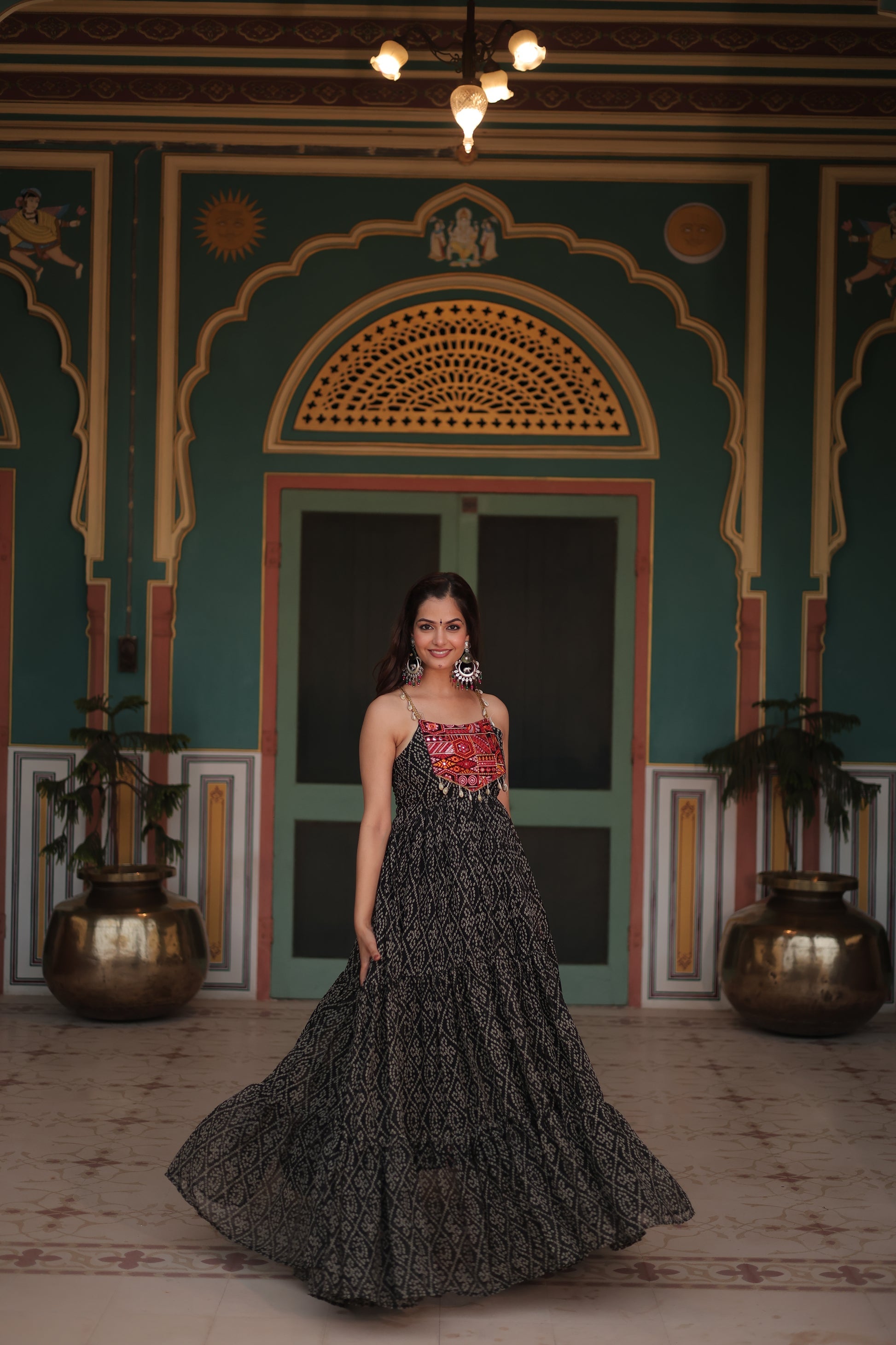 Mahika Black Rayon Kutchi Gamthi Kodi Work Gown