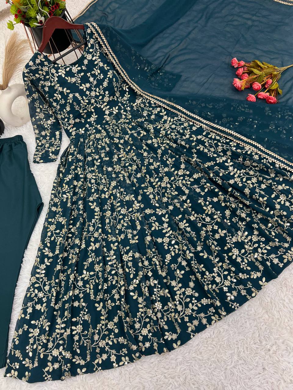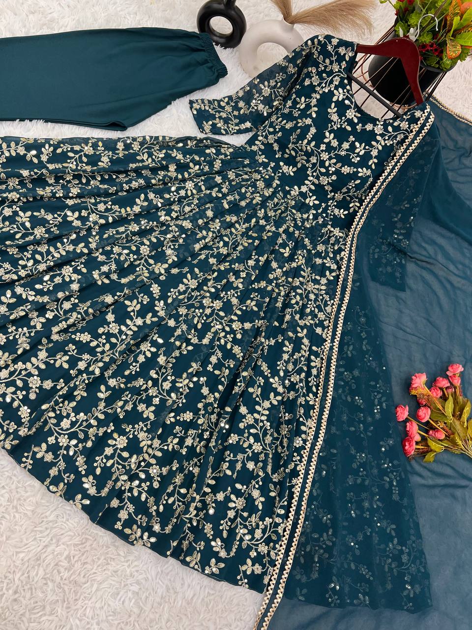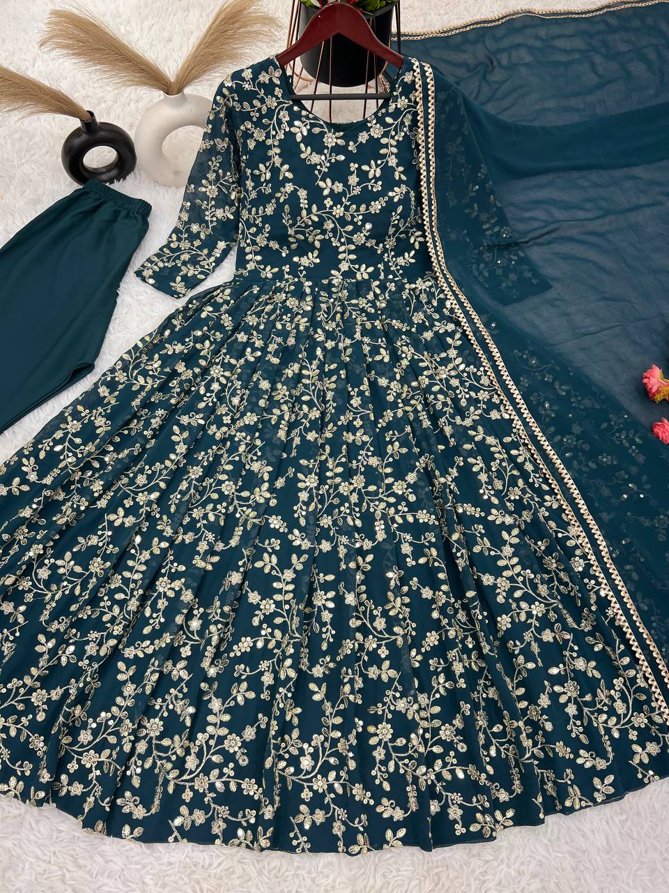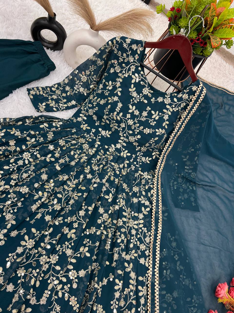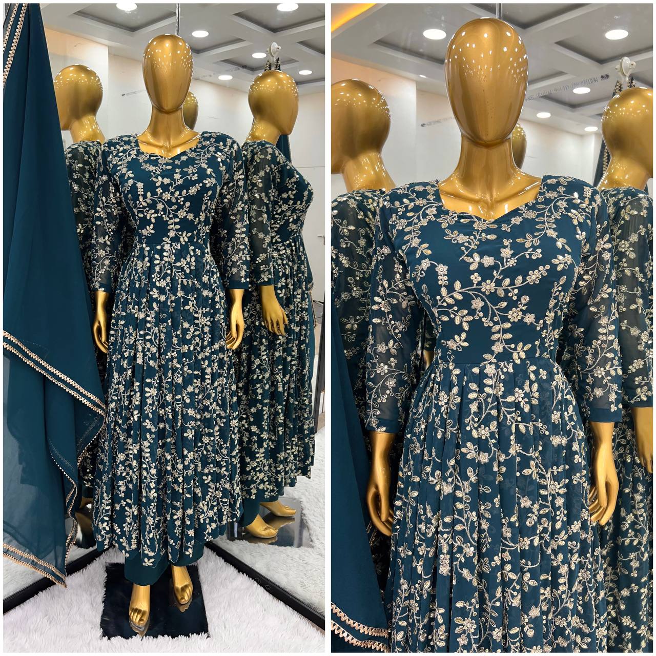 This Janvika Blue Embroidered Georgette Anarkali Suit Set is crafted with delicate embroidery and made with high-quality georgette fabric. The elegant design and intricate detailing of this suit set make it a perfect choice for any special occasion. Experience luxury and comfort with this timeless piece.