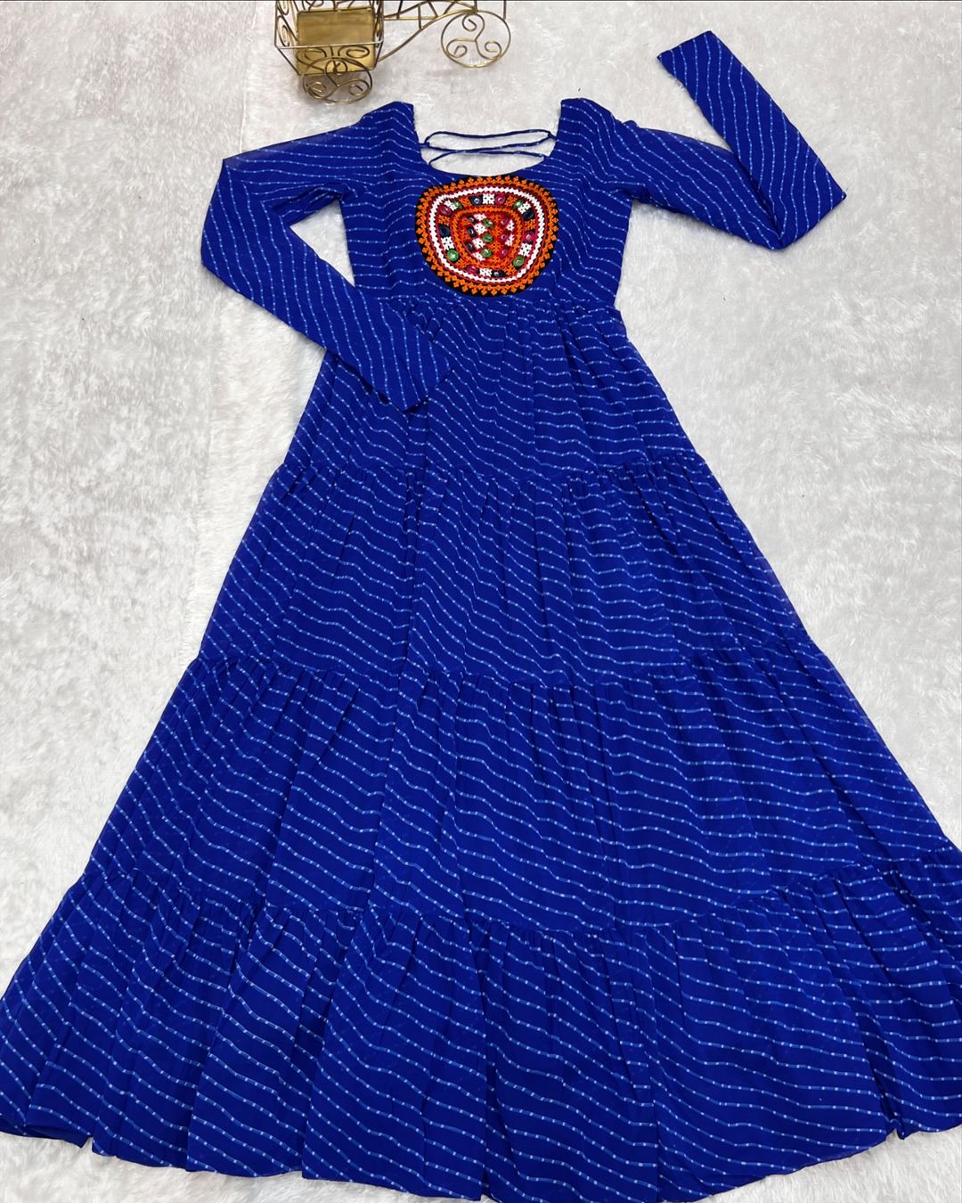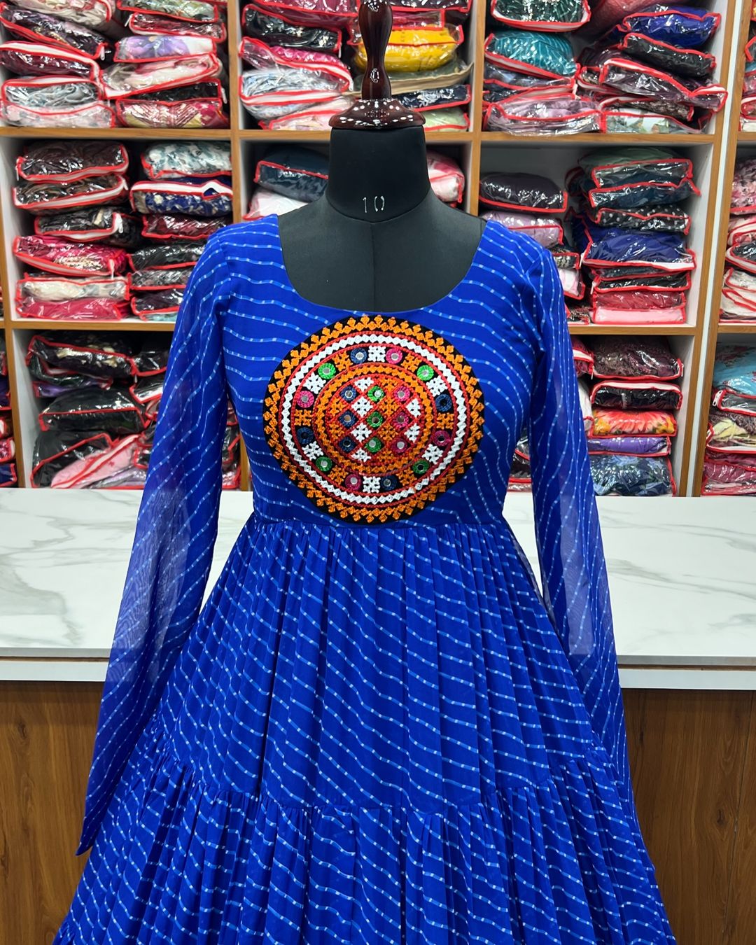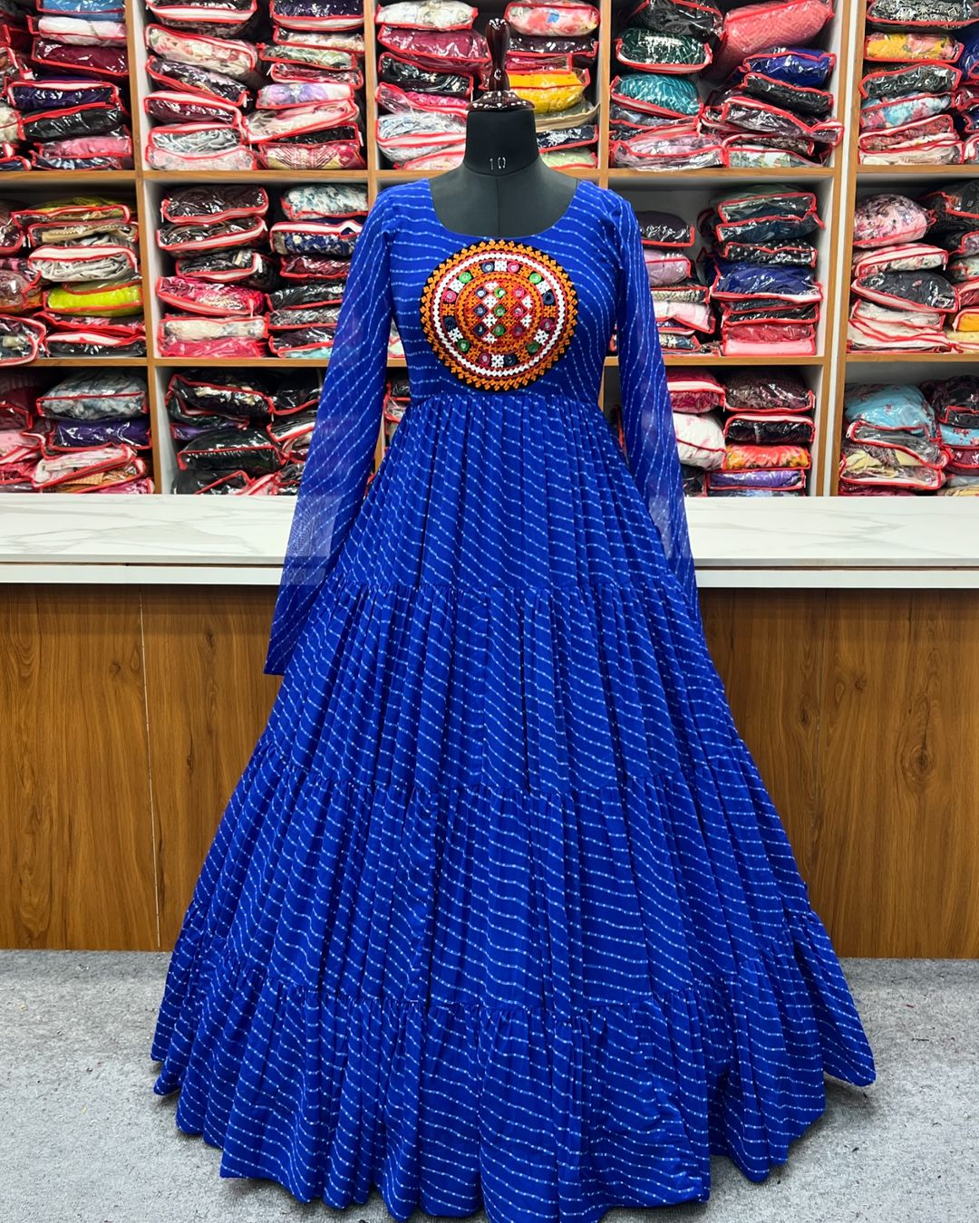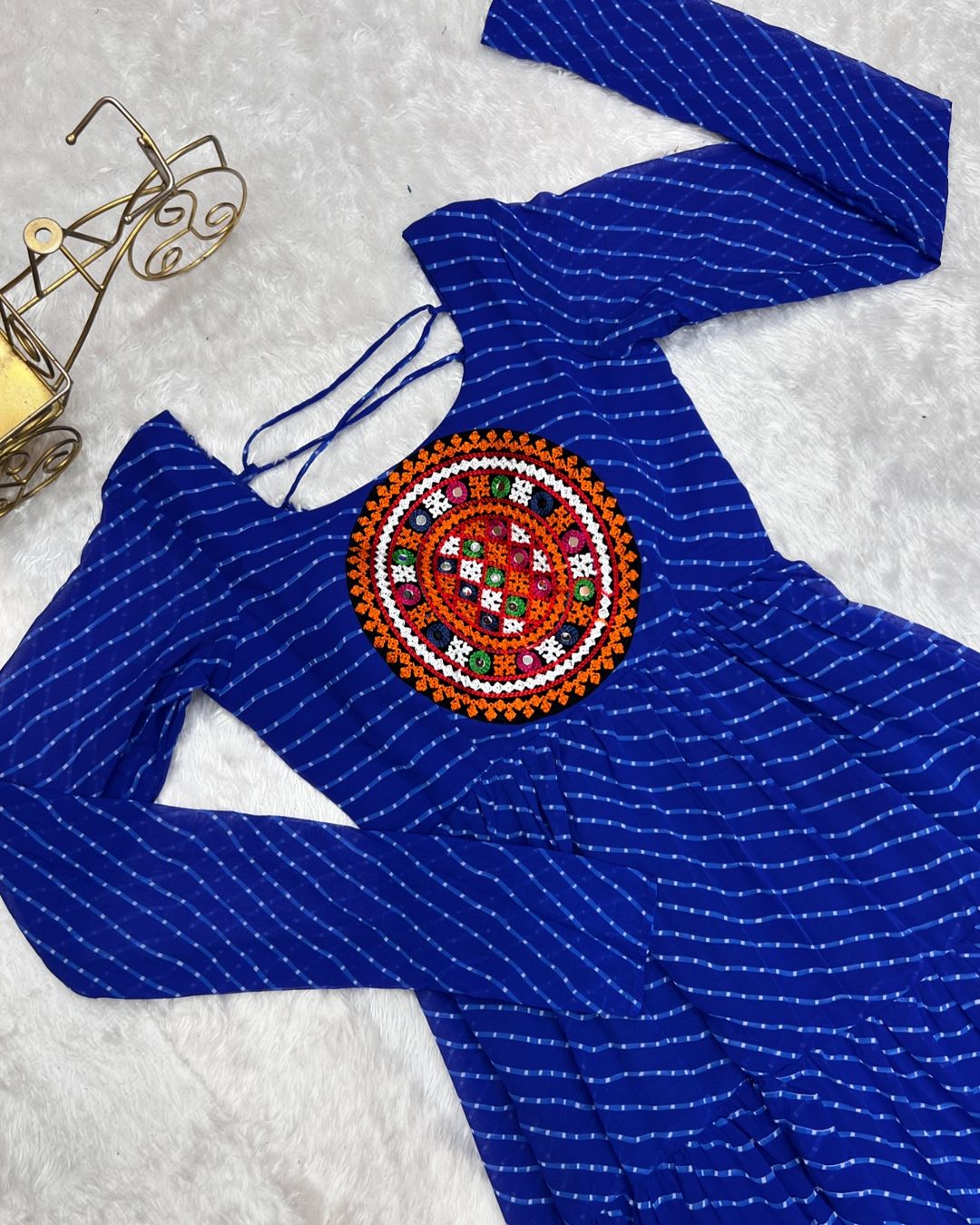 Experience elegance and style in our Manvitha Blue Georgette Leheriya Printed Navratri Gown. Made from high-quality georgette fabric, this gown features a beautiful leheriya print and is designed specifically for the festive season. Add a touch of tradition to your wardrobe and make a statement at any Navratri celebration.