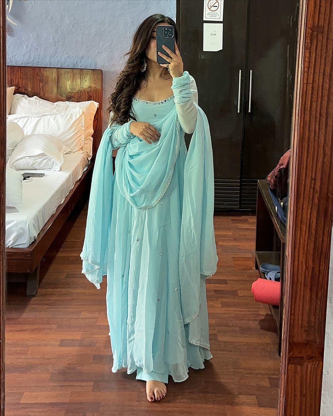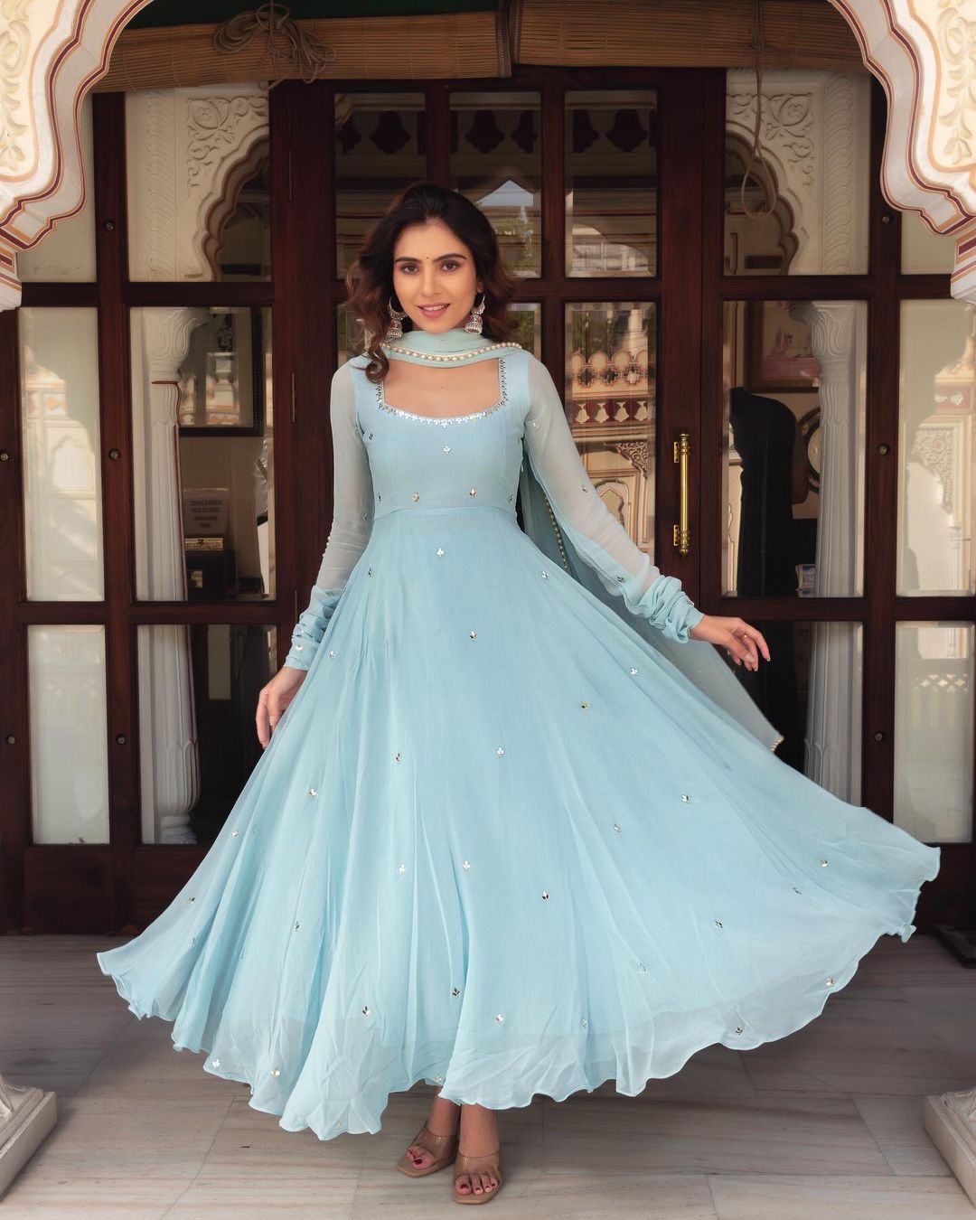 Discover a stunning way to elevate your ethnic wardrobe with our Niya Sky Blue Georgette Embroidery Anarkali Gown Set. Made with high quality georgette fabric, this elegant suit set boasts intricate embroidery for a touch of traditional charm. Perfect for any occasion, it offers unmatched style and comfort.