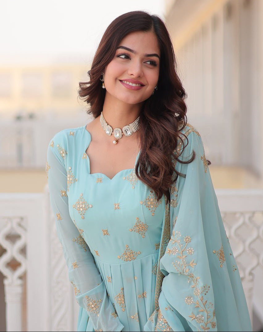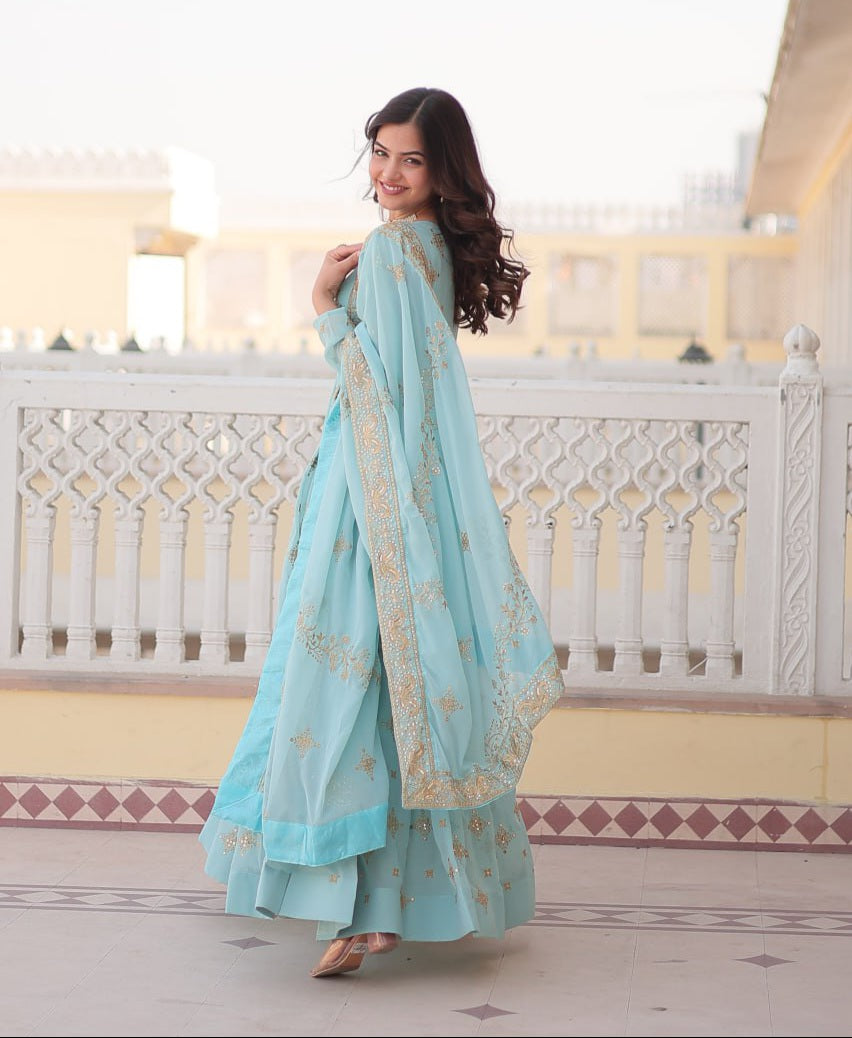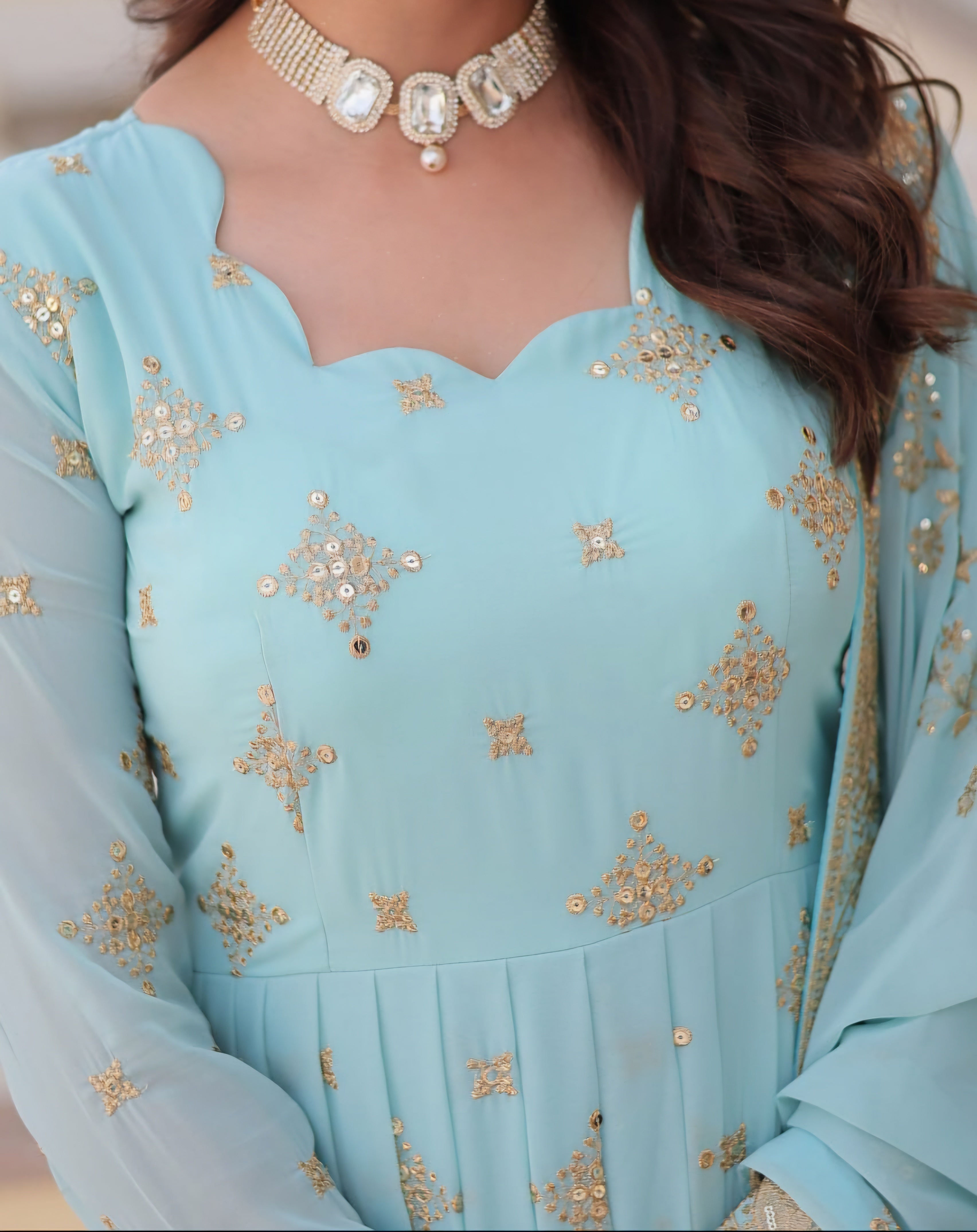 Elevate your ethnic look with Sevya Blue Georgette Embroidered Anarkali Gown Set. Crafted with a sky blue faux georgette gown and adorned with intricate sequins embroidery, it comes with a matching dupatta for a complete look. Stand out and make a statement at any occasion with this elegant ensemble.