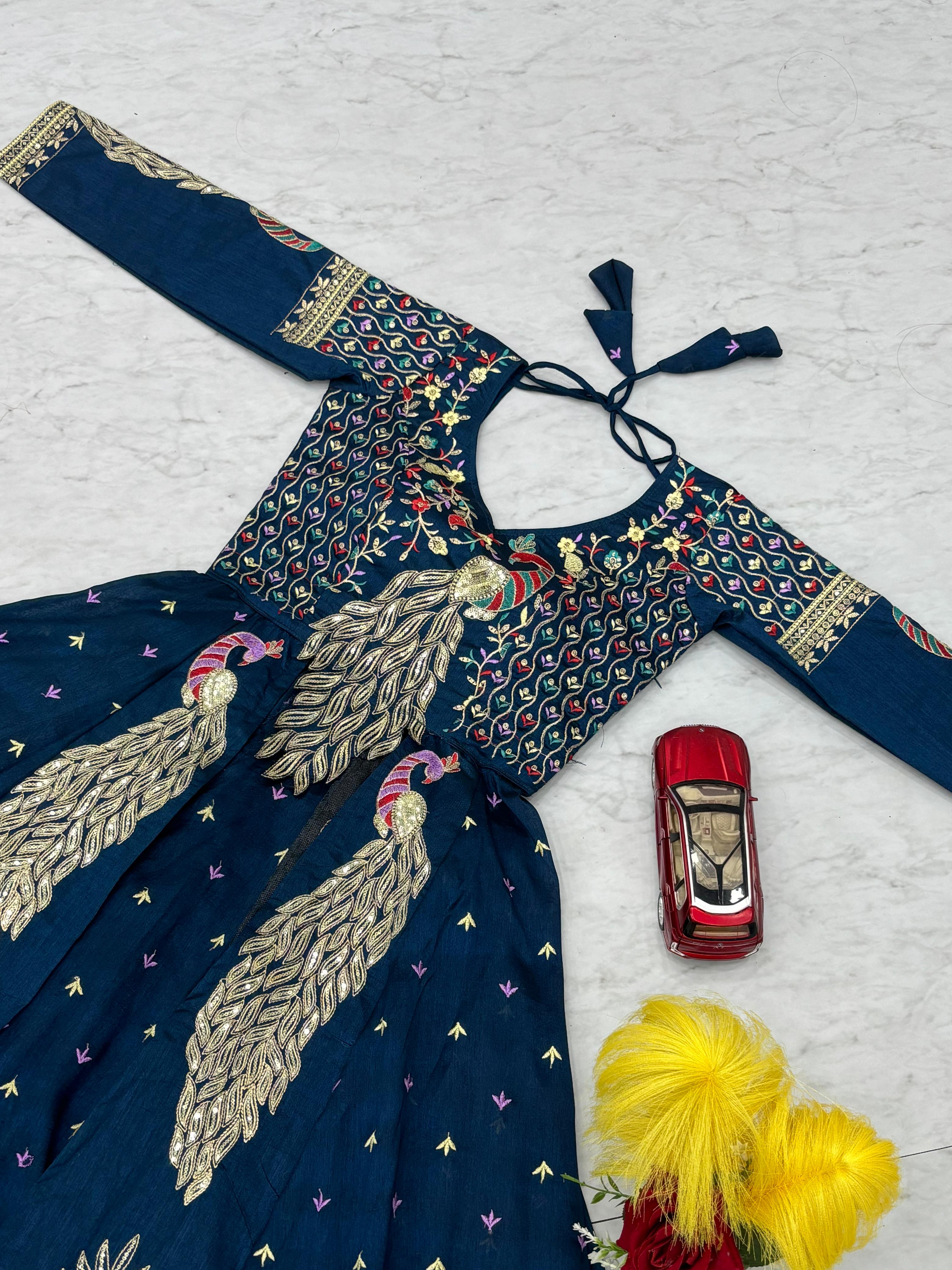 Experience the elegance of our Teal Blue Color Vichitra Silk Crop Top Peacock Design Lehenga with Embroidered Shrug. Made from high-quality vichitra silk, this crop top lehenga features intricate peacock design and embroidery, exuding sophistication and grace. Perfect for weddings or any special occasion, elevate your style with this stunning ensemble.