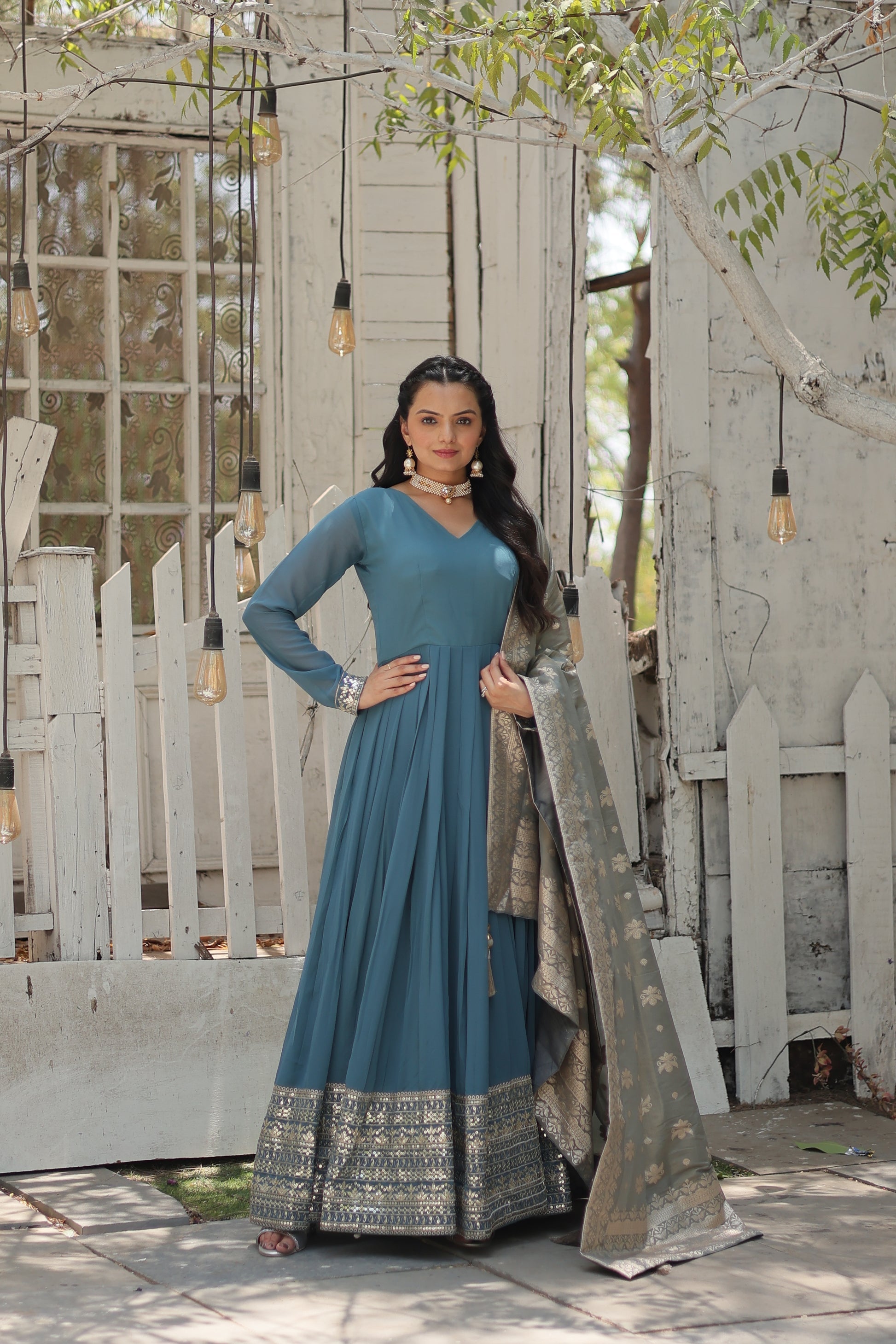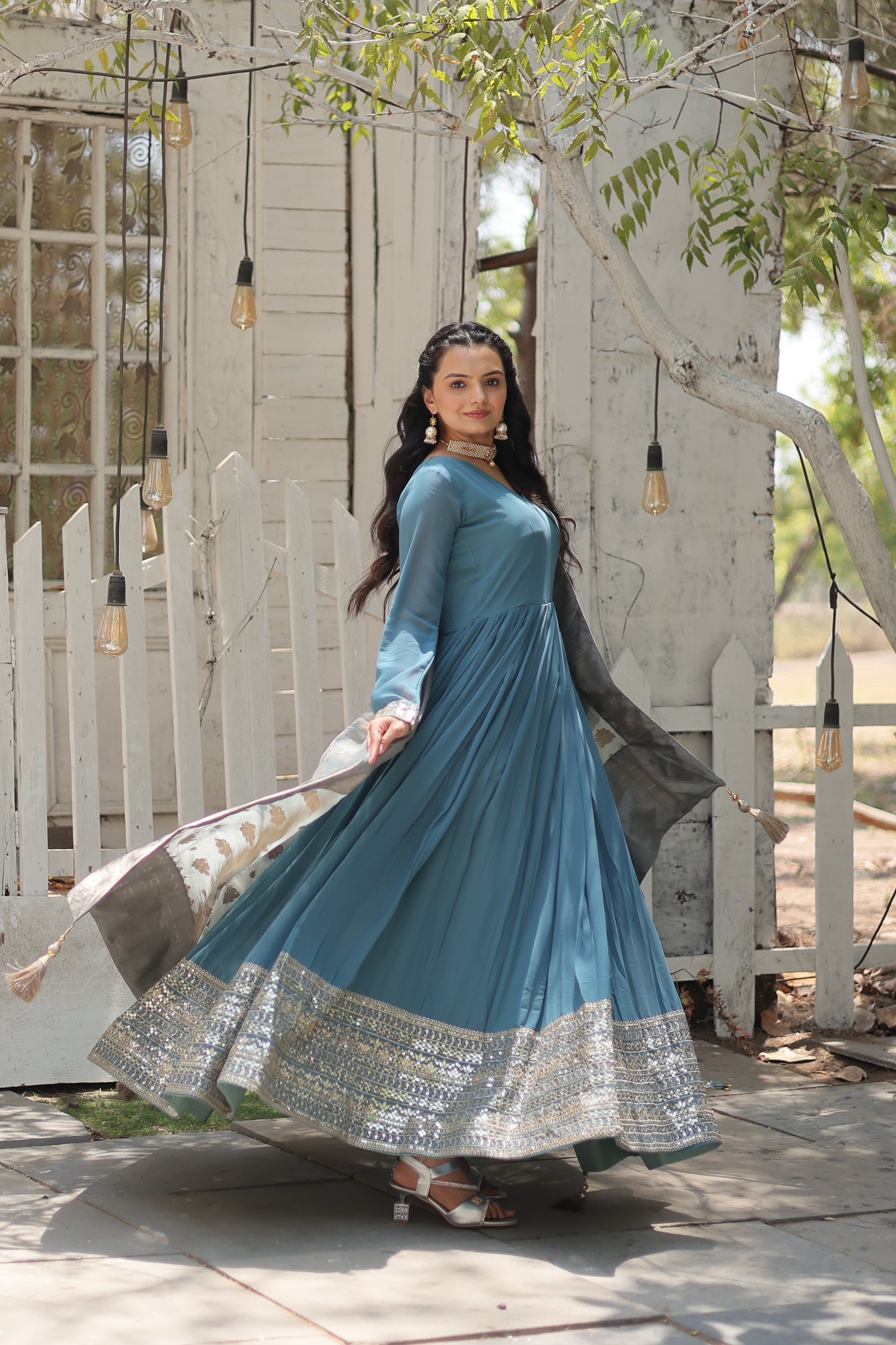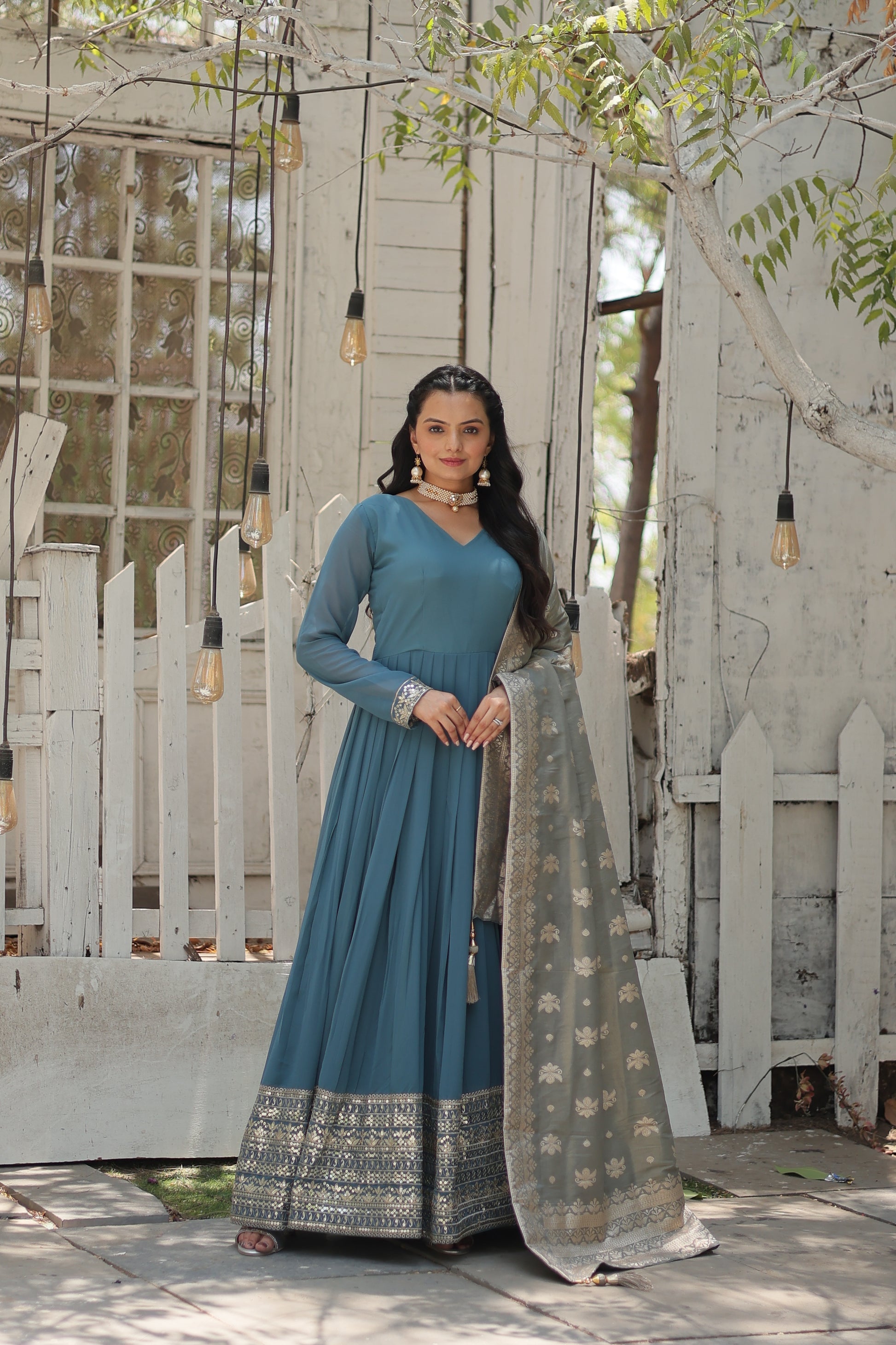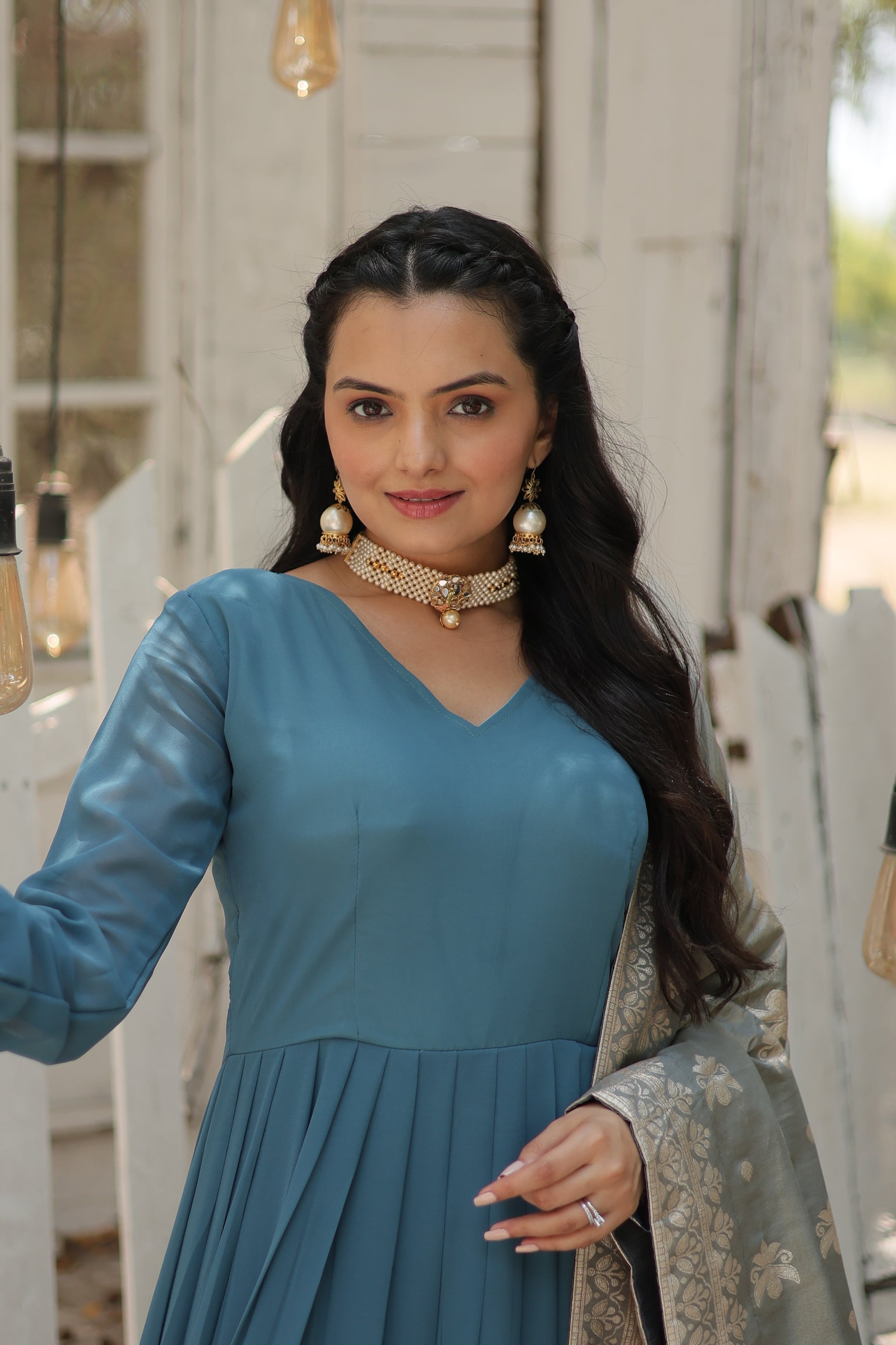 Introducing the Tiya Sky Blue Georgette Anarkali Gown Set. Made from high-quality georgette, this elegant gown set is designed for style and comfort. Its sky blue color adds a touch of grace to your wardrobe. Perfect for any occasion, the set comes with a gorgeous anarkali gown that will make you stand out in any crowd.