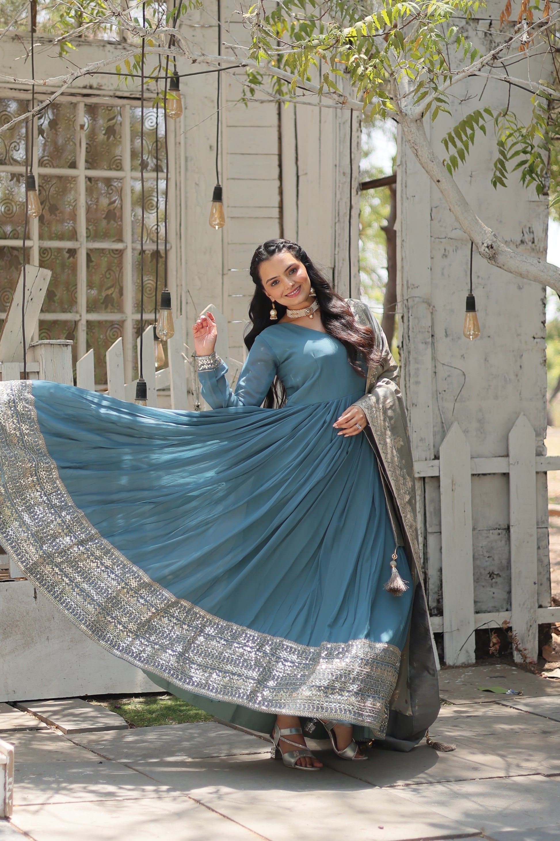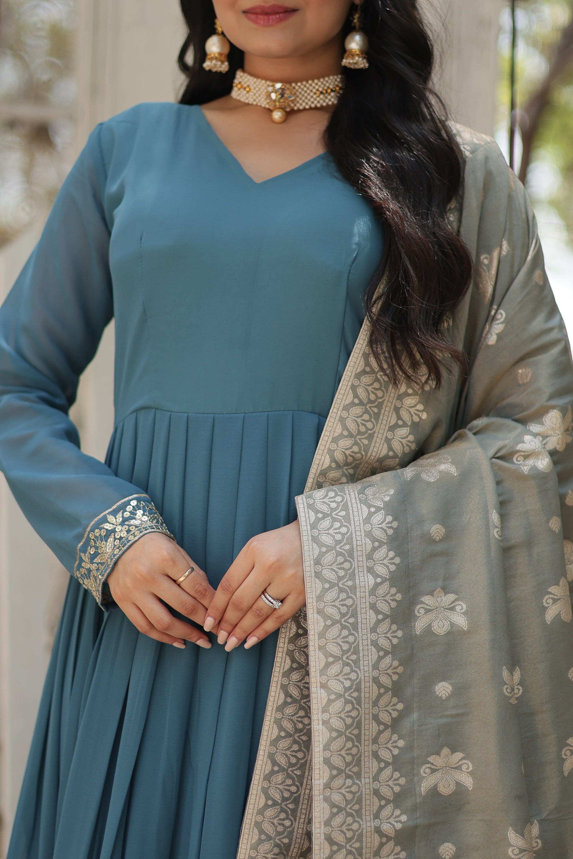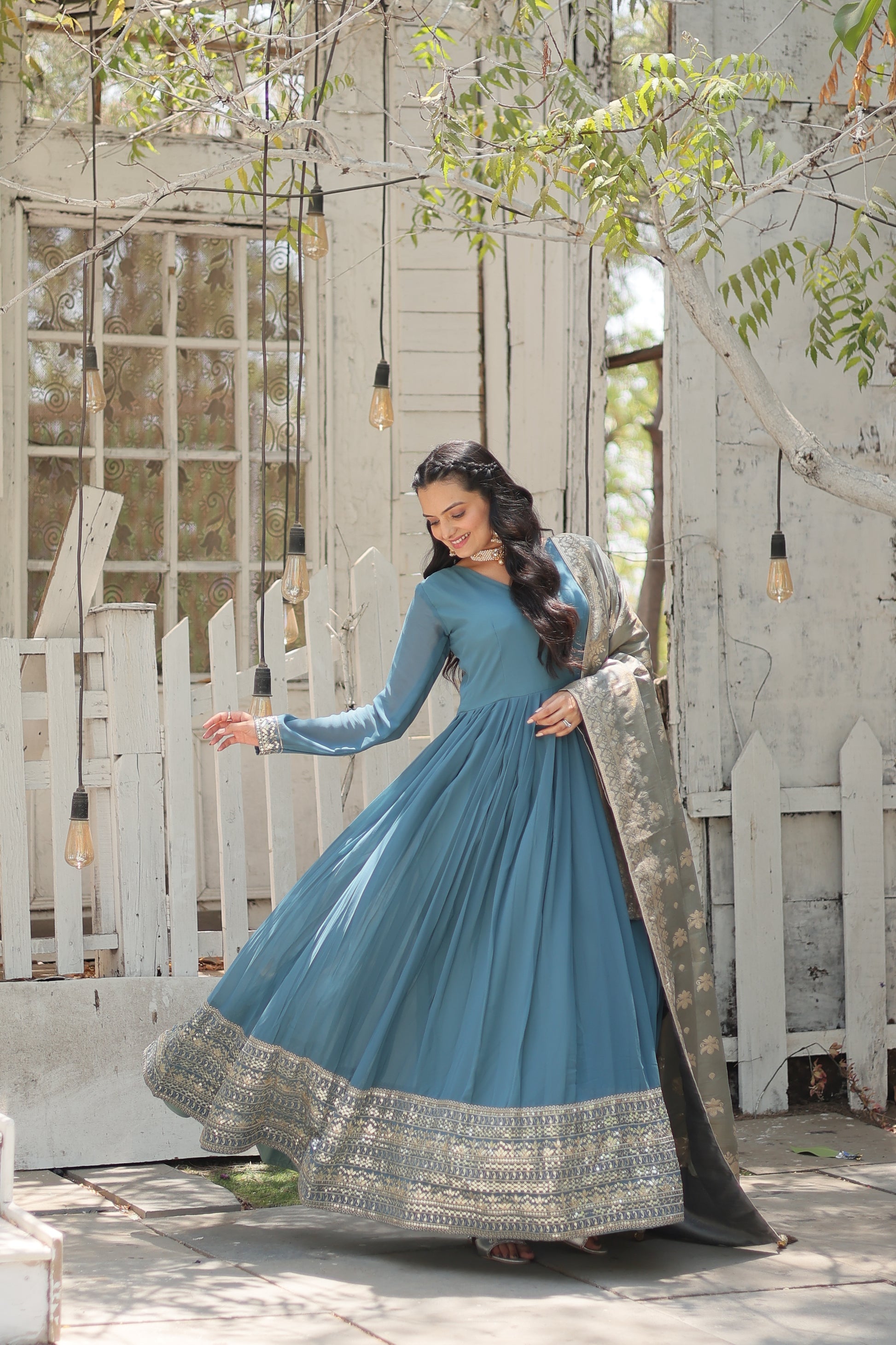 Introducing the Tiya Sky Blue Georgette Anarkali Gown Set. Made from high-quality georgette, this elegant gown set is designed for style and comfort. Its sky blue color adds a touch of grace to your wardrobe. Perfect for any occasion, the set comes with a gorgeous anarkali gown that will make you stand out in any crowd.