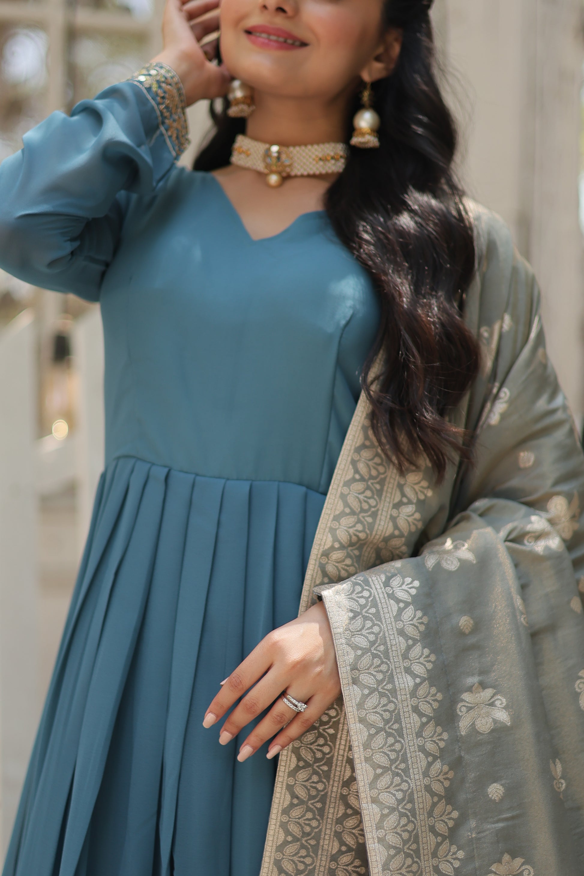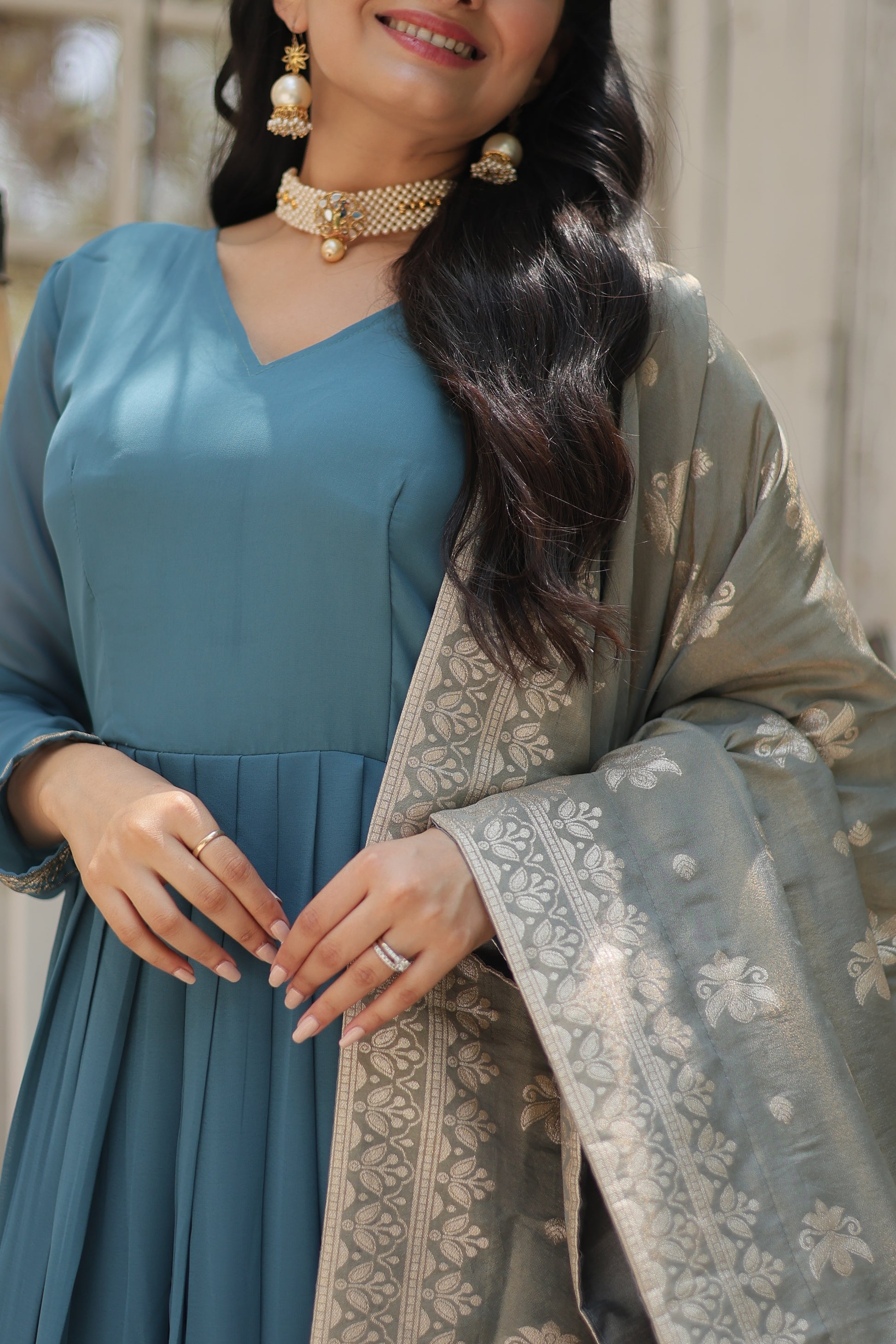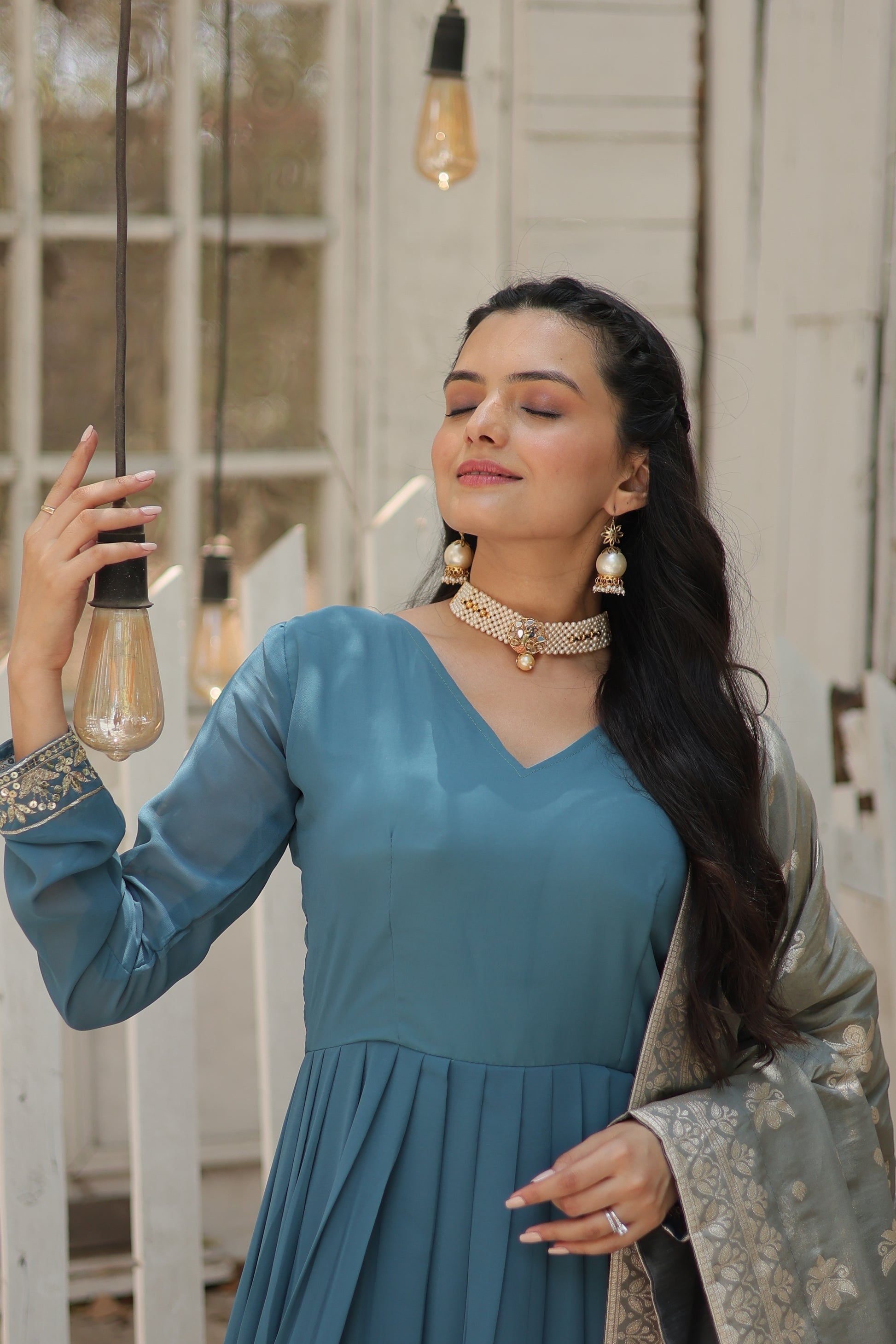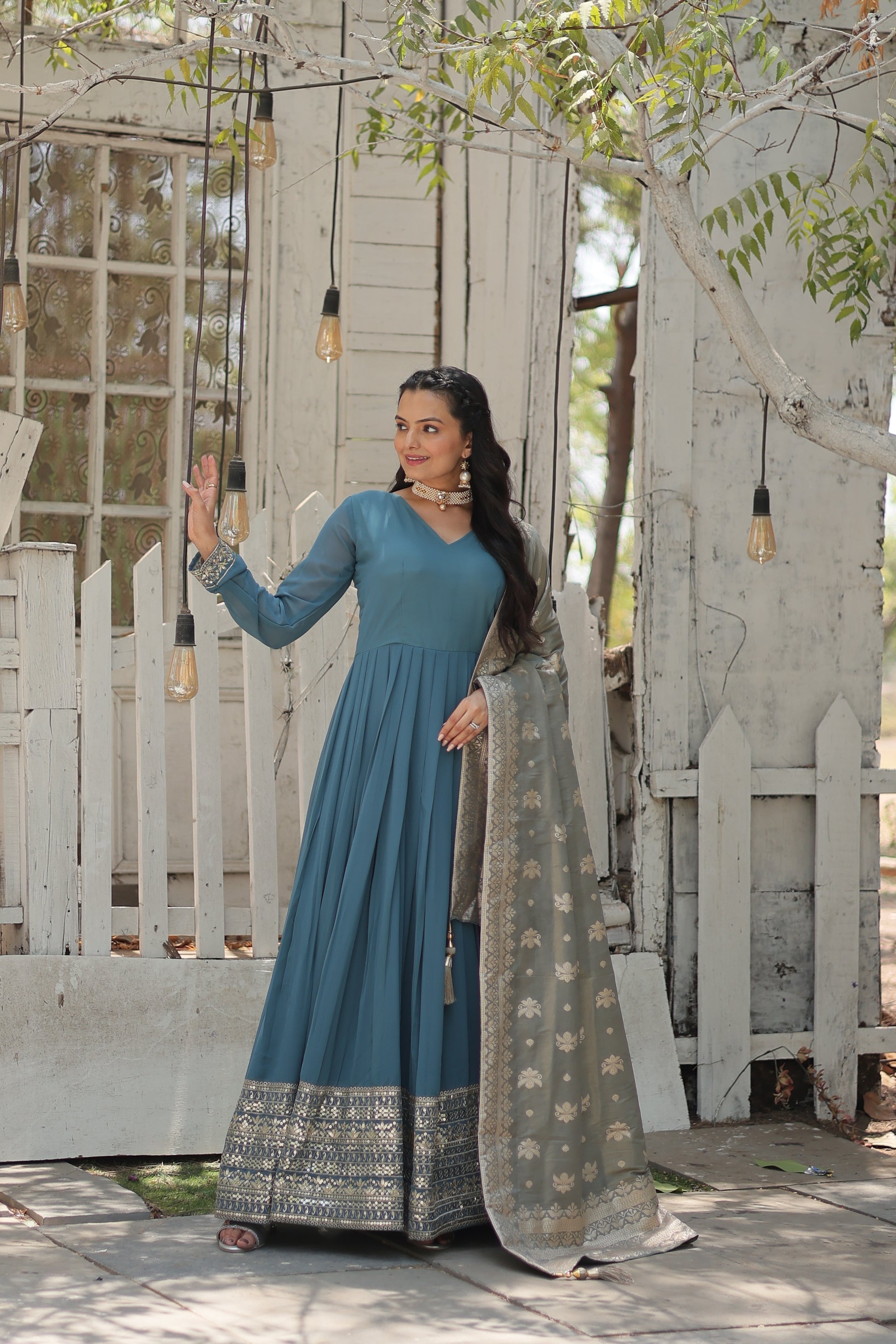 Introducing the Tiya Sky Blue Georgette Anarkali Gown Set. Made from high-quality georgette, this elegant gown set is designed for style and comfort. Its sky blue color adds a touch of grace to your wardrobe. Perfect for any occasion, the set comes with a gorgeous anarkali gown that will make you stand out in any crowd.