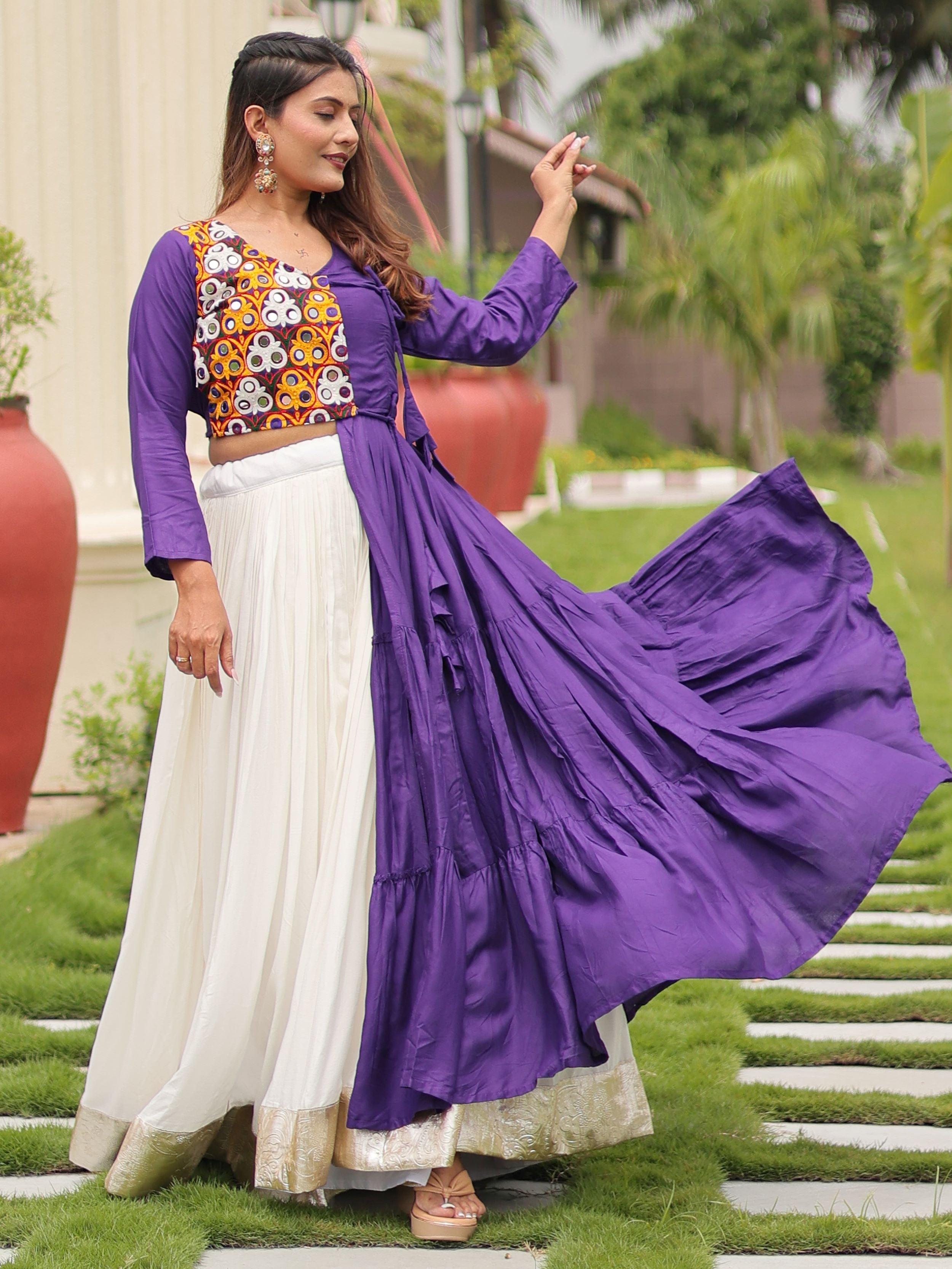 Celebrate Navratri in style with this Purple Cotton Lehenga Choli, featuring intricate Gamthi work and sparkling mirror embroidery. Perfect for Garba nights, festive occasions, and traditional celebrations, this lehenga set combines comfort with elegance for the confident Trinari.