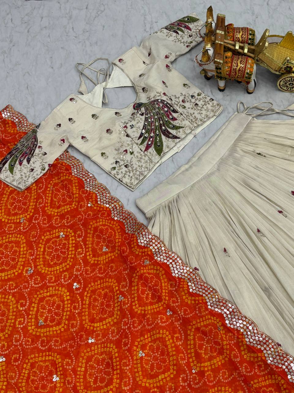 Amla Off-White Tissue Silk Sequins Thread Work Lehenga Choli with Orange Bandhej Dupatta