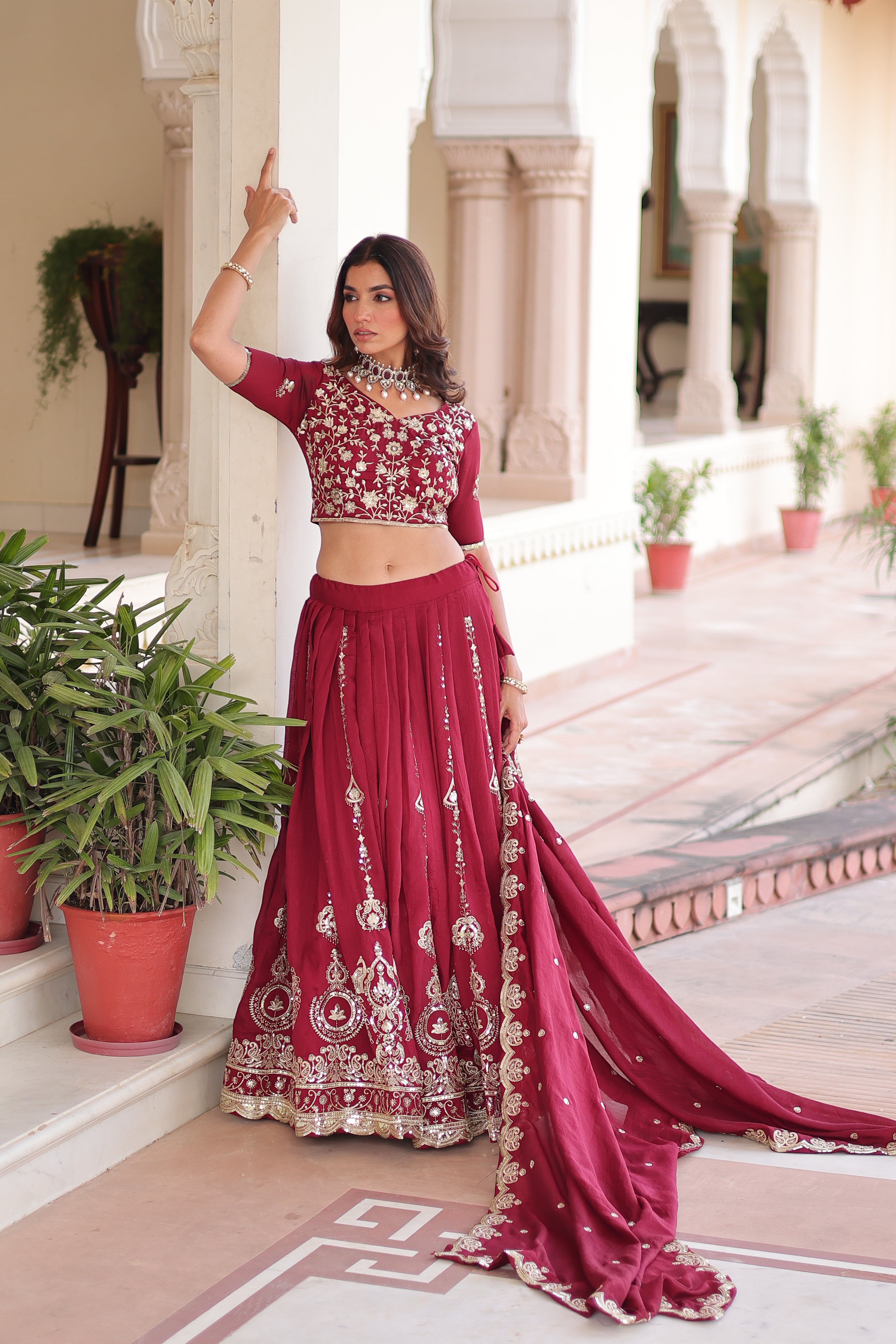 Elevate your festive wardrobe with this exquisite Rumi lehenga choli, crafted from luxurious Vichitra silk in a rich maroon hue. The ensemble showcases intricate heavy sequins and thread embroidery work that catches light beautifully, creating an enchanting shimmer with every movement. Perfect for weddings, celebrations, and special occasions, this piece combines traditional craftsmanship with timeless elegance. The sophisticated maroon tone pairs effortlessly with gold jewelry and accessories, making it a versatile choice for the discerning bride or guest seeking refined ethnic wear.