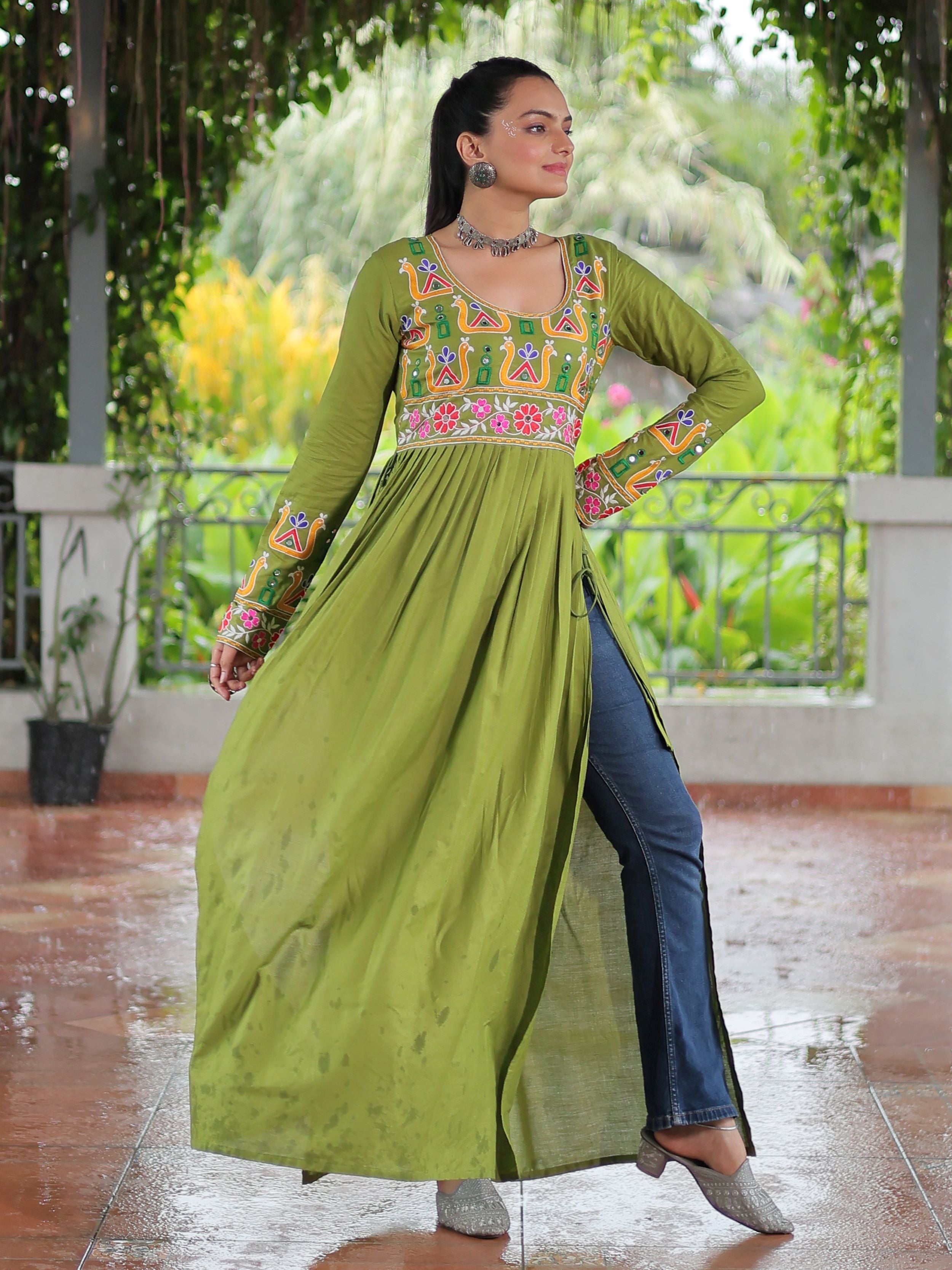 Embrace the fusion of tradition and contemporary charm with this elegant Nayra Cut Kurti in vibrant green. Crafted from premium 14 Kg Rayon, the kurti features intricate Kutchi Gamthi embroidery that celebrates heritage artistry. The Nayra cut silhouette adds a flattering flare, while the full sleeves and round neck ensure timeless elegance—perfect for festive wear, college days, or casual ethnic styling.