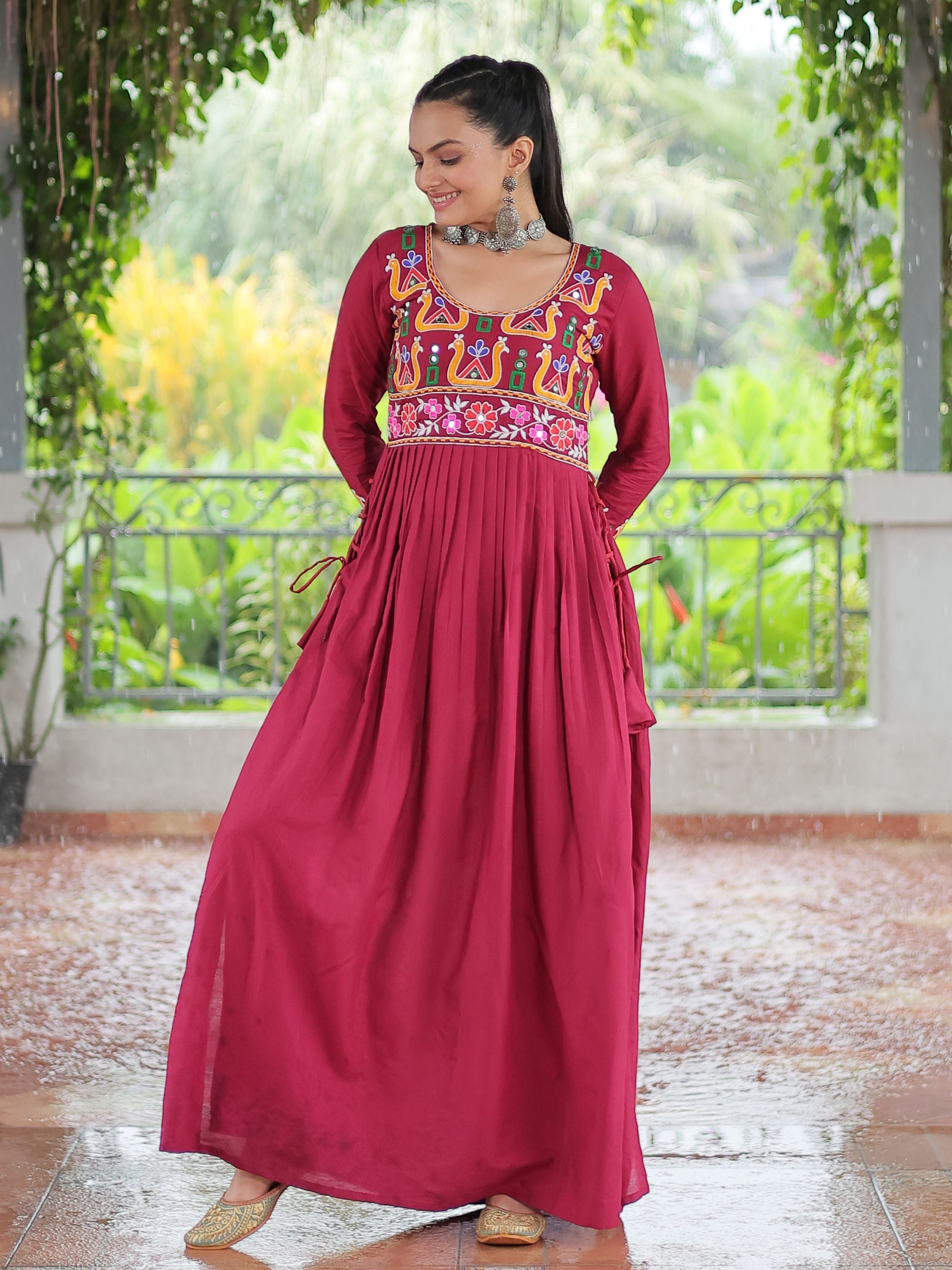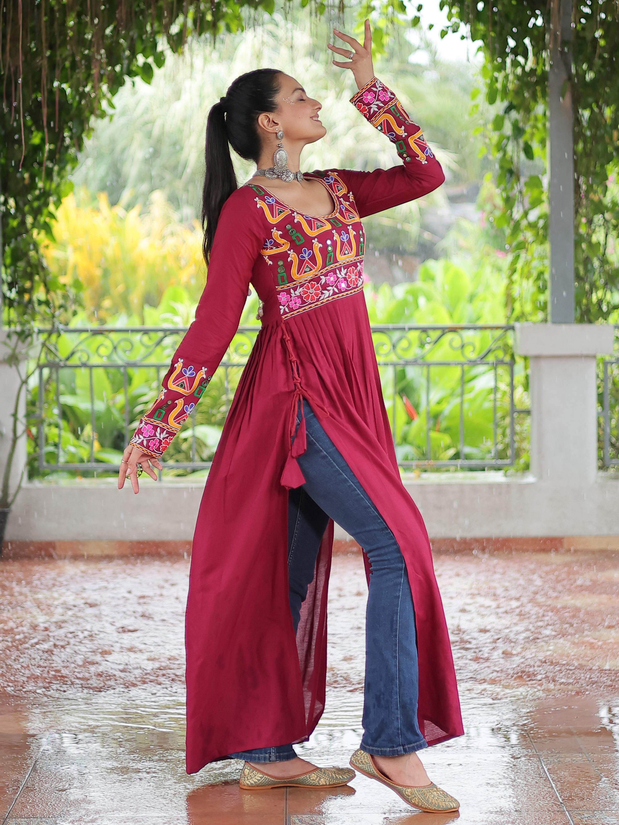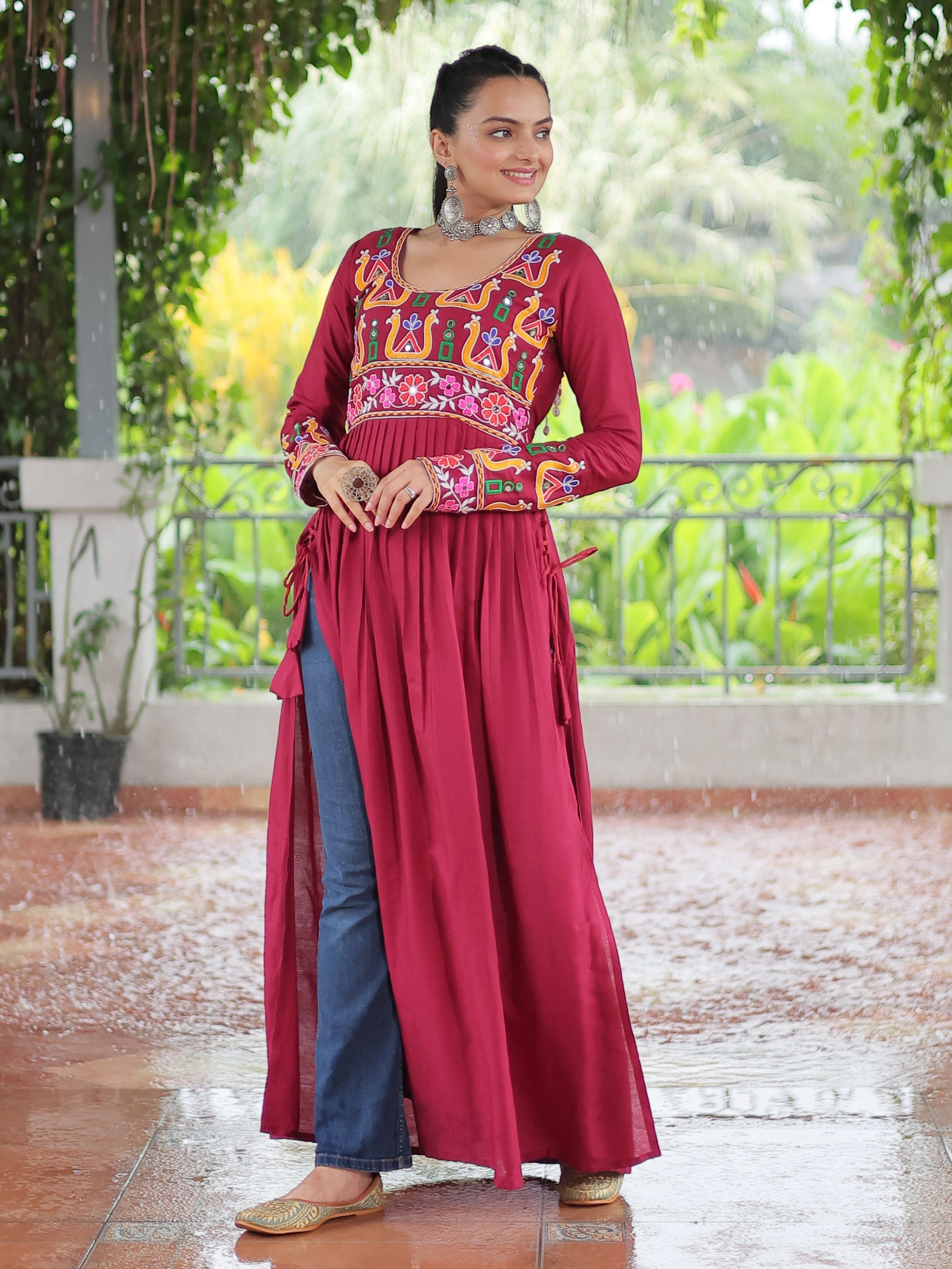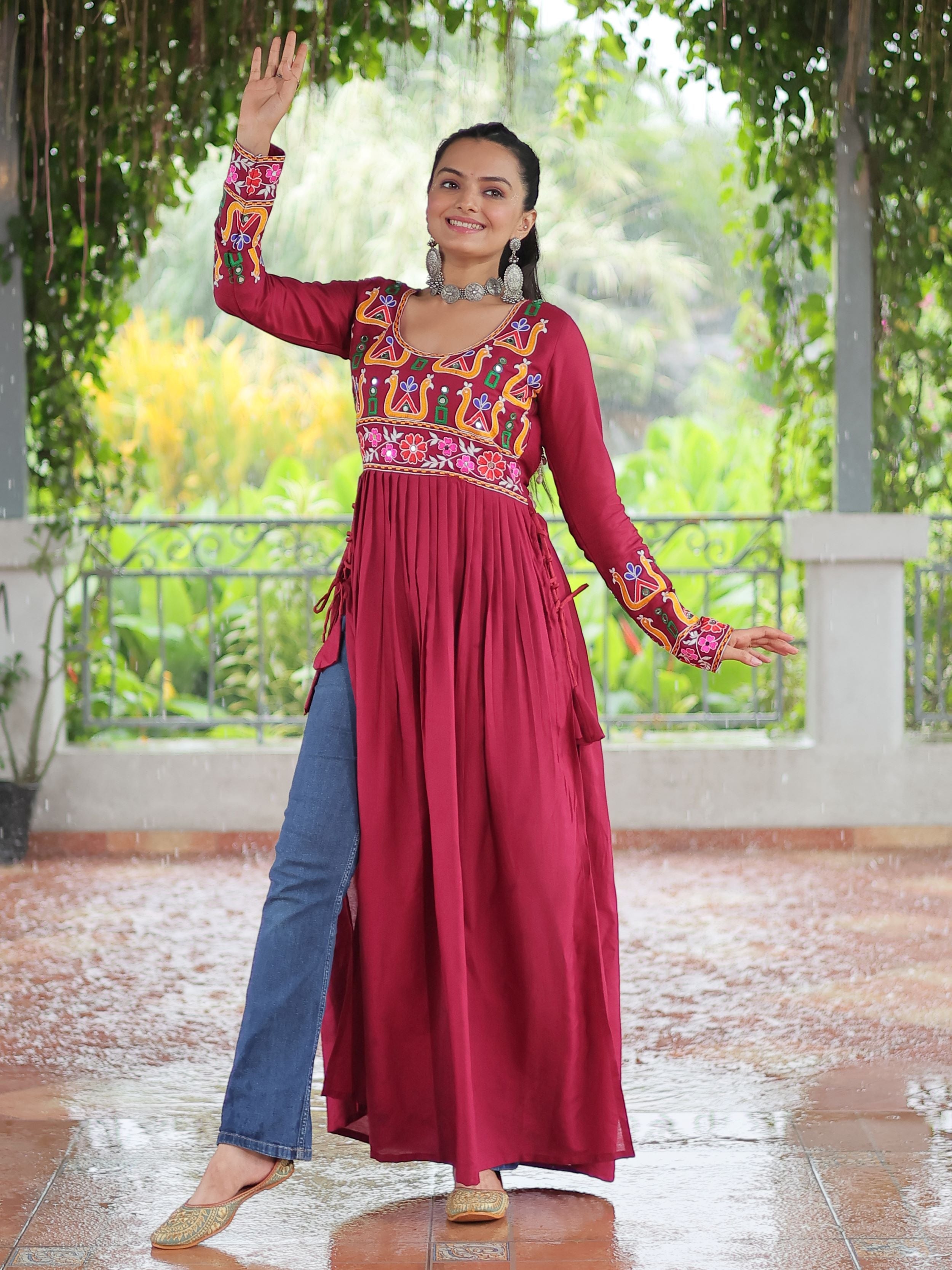 Embrace the fusion of tradition and contemporary charm with this elegant Nayra Cut Kurti in vibrant red color. Crafted from premium 14 Kg Rayon, the kurti features intricate Kutchi Gamthi embroidery that celebrates heritage artistry. The Nayra cut silhouette adds a flattering flare, while the full sleeves and round neck ensure timeless elegance—perfect for festive wear, college days, or casual ethnic styling.