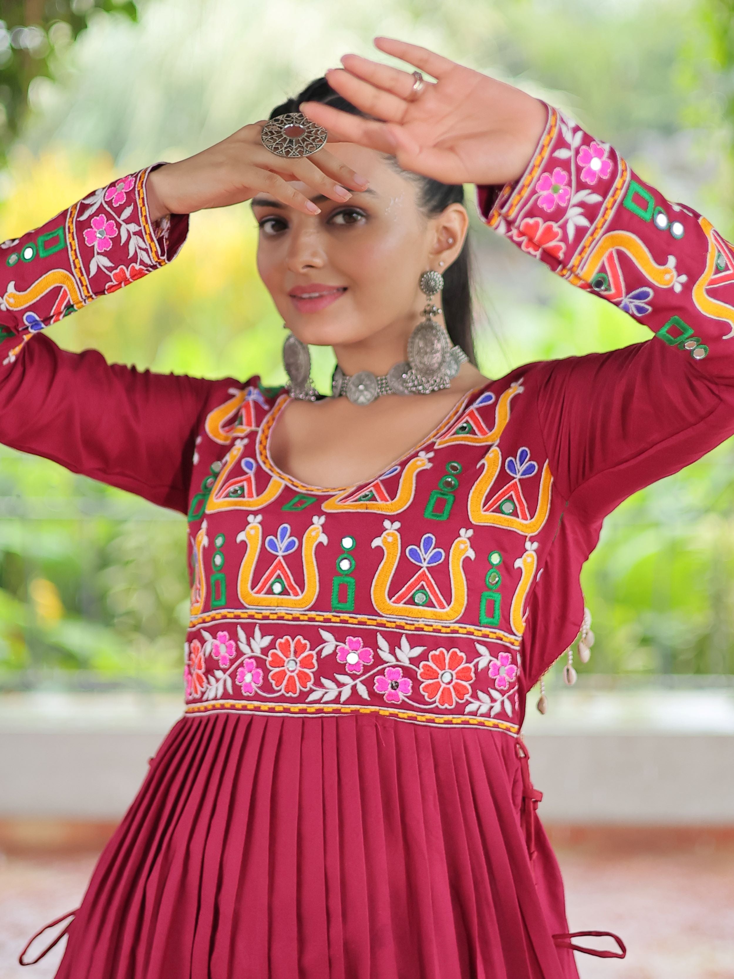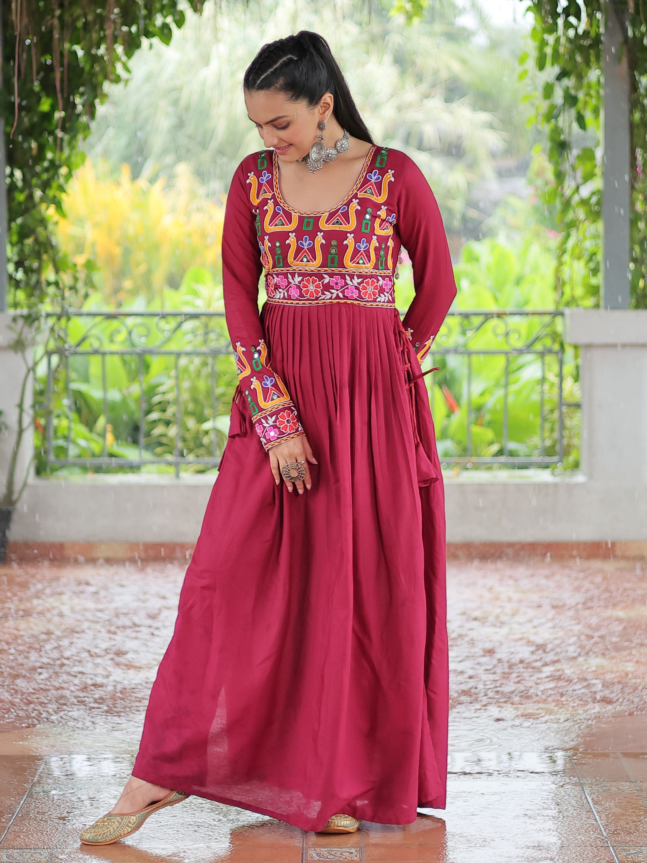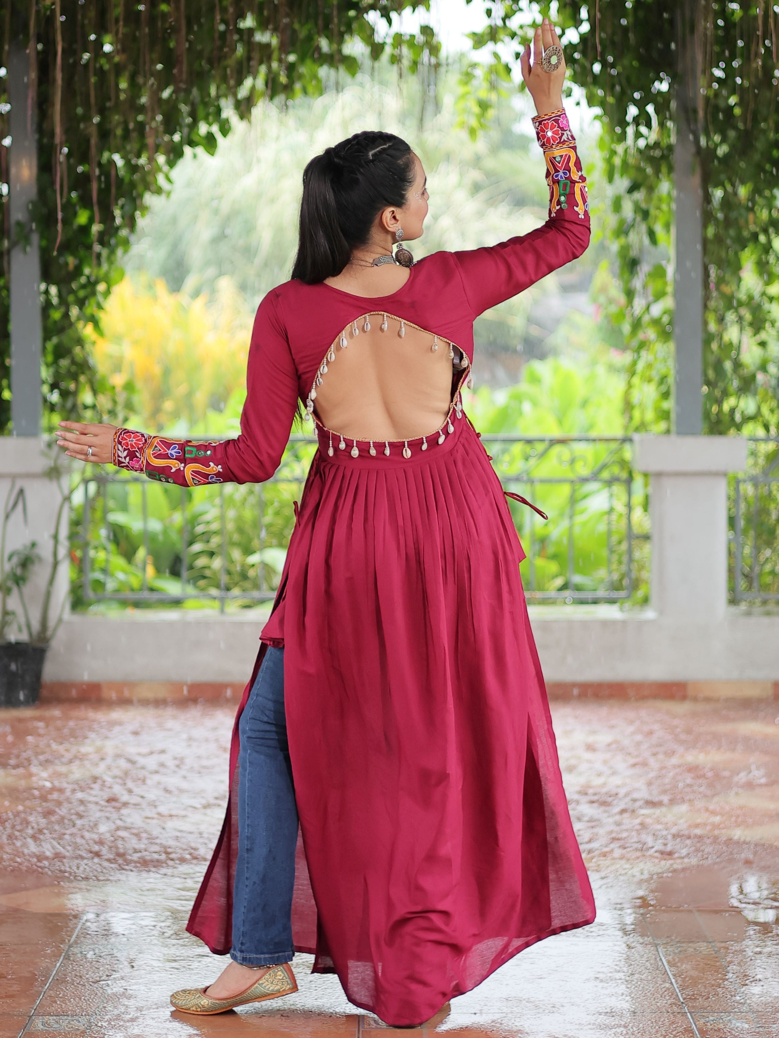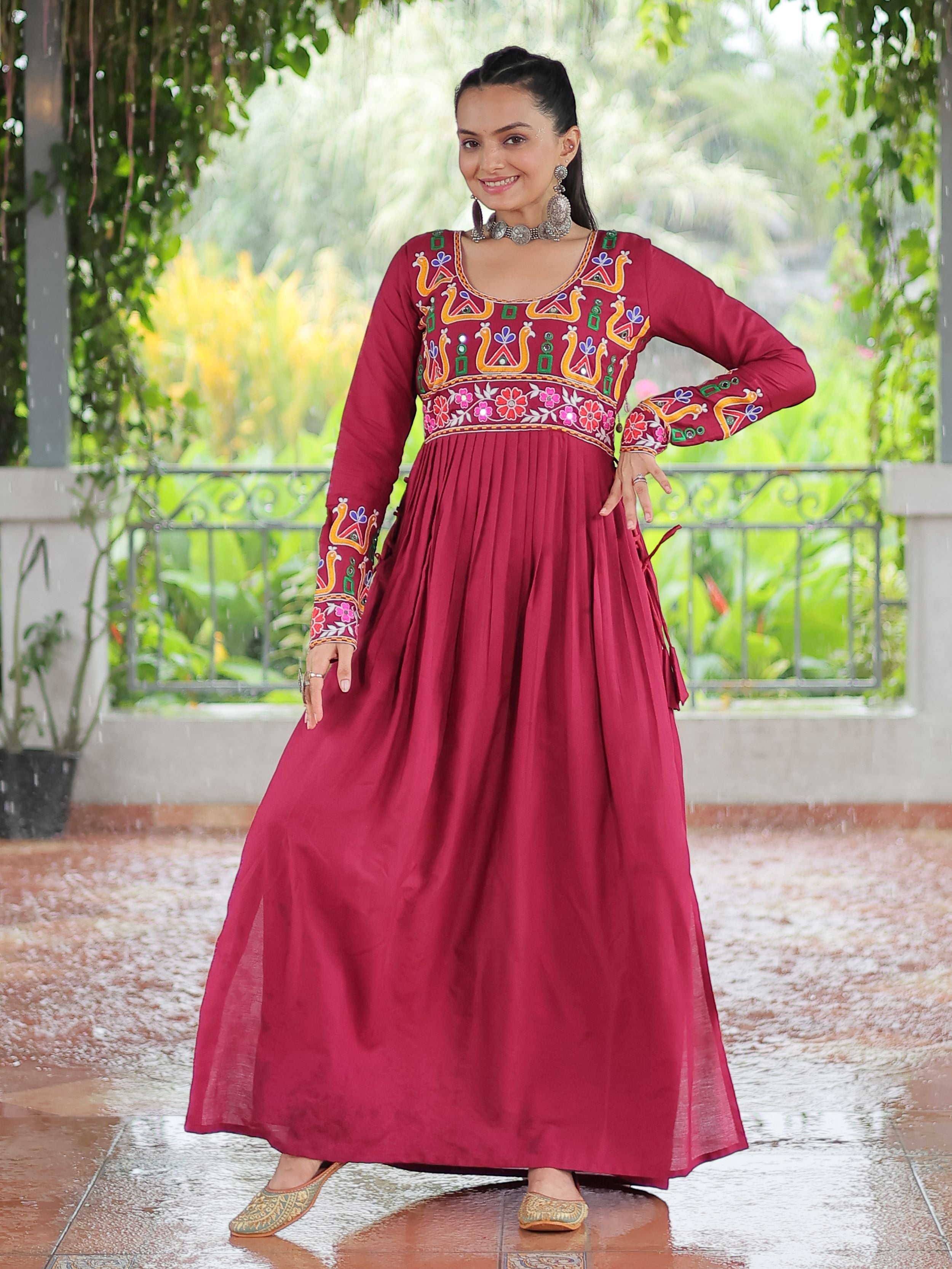 Embrace the fusion of tradition and contemporary charm with this elegant Nayra Cut Kurti in vibrant red color. Crafted from premium 14 Kg Rayon, the kurti features intricate Kutchi Gamthi embroidery that celebrates heritage artistry. The Nayra cut silhouette adds a flattering flare, while the full sleeves and round neck ensure timeless elegance—perfect for festive wear, college days, or casual ethnic styling.
