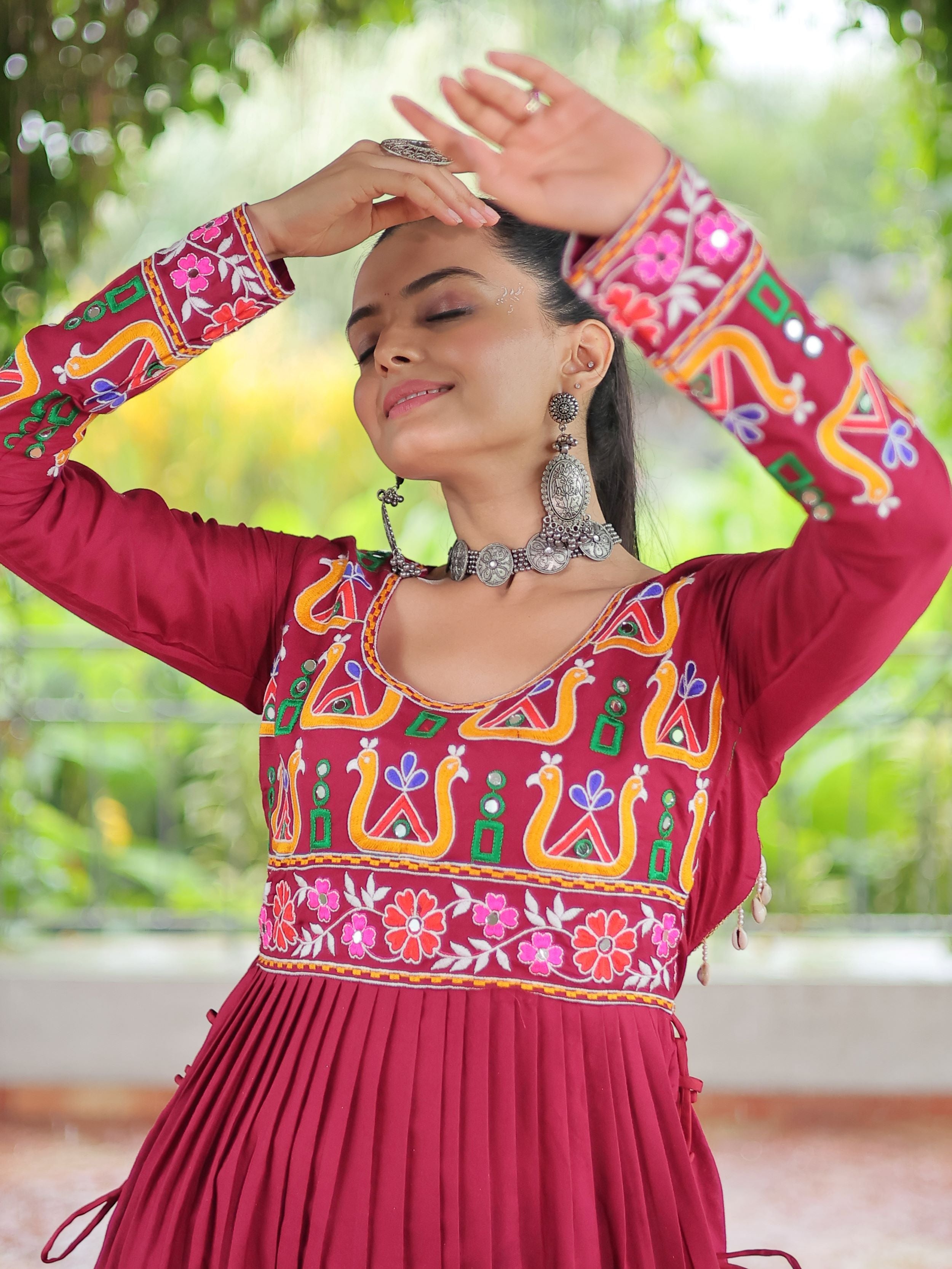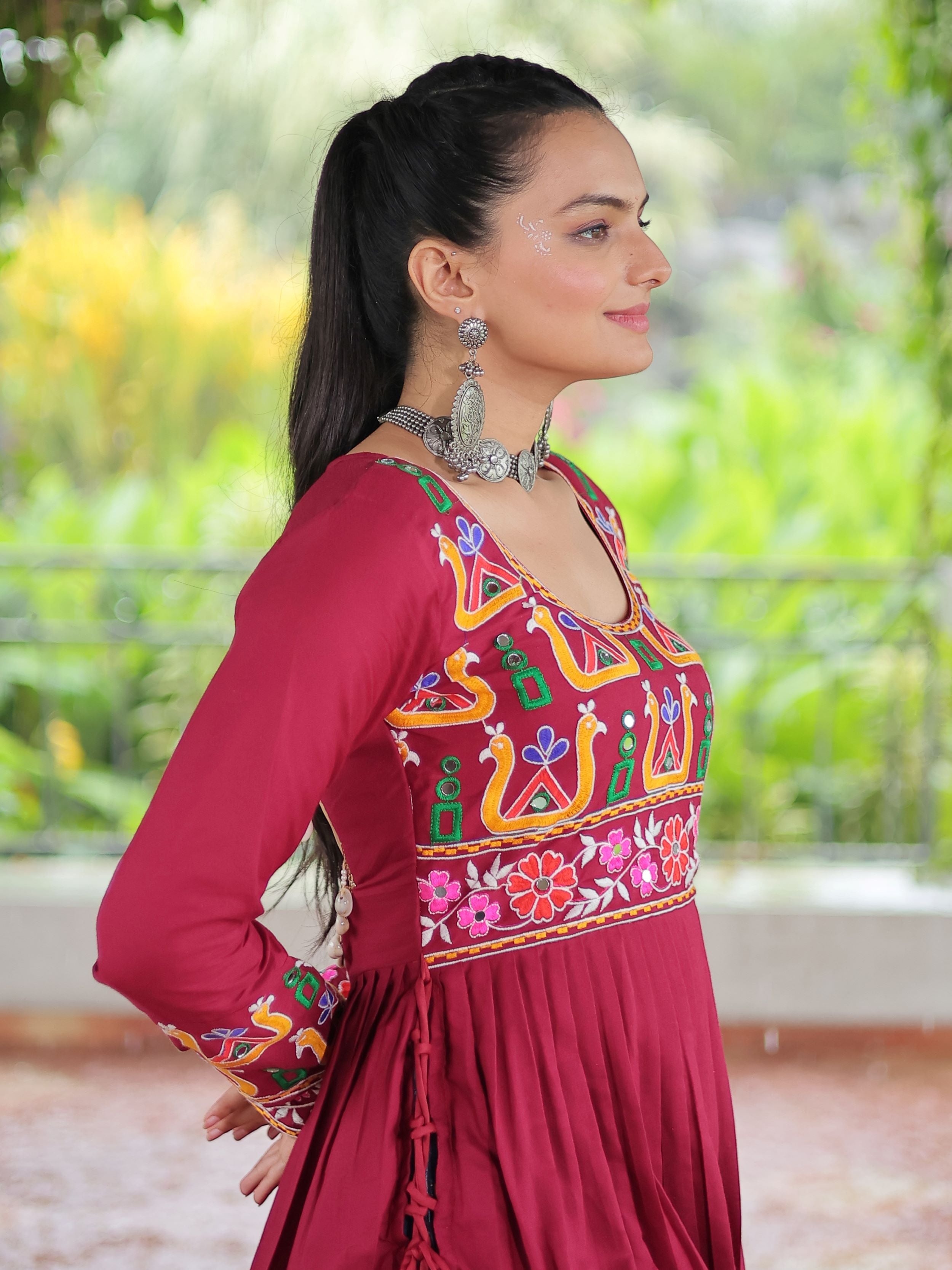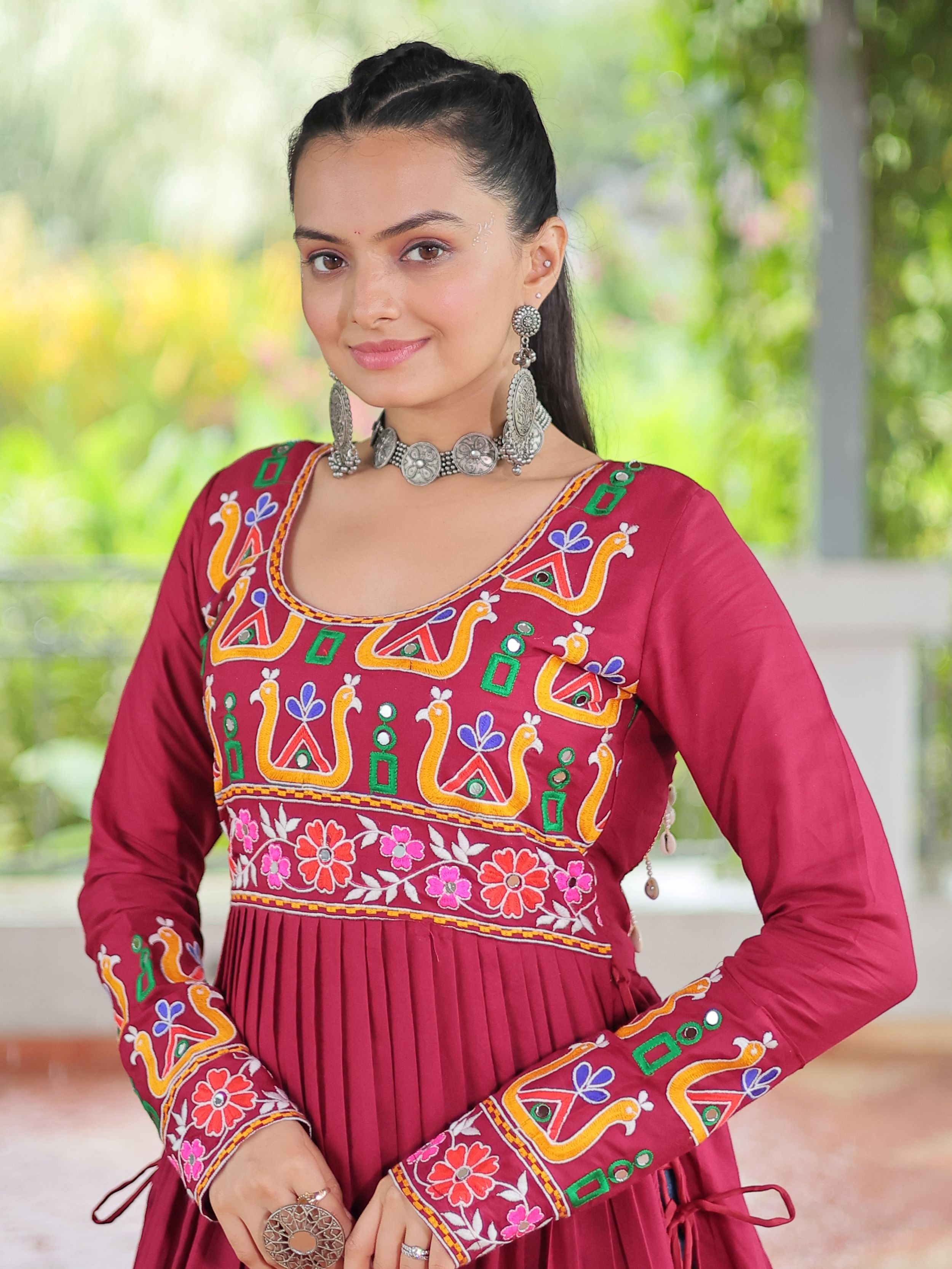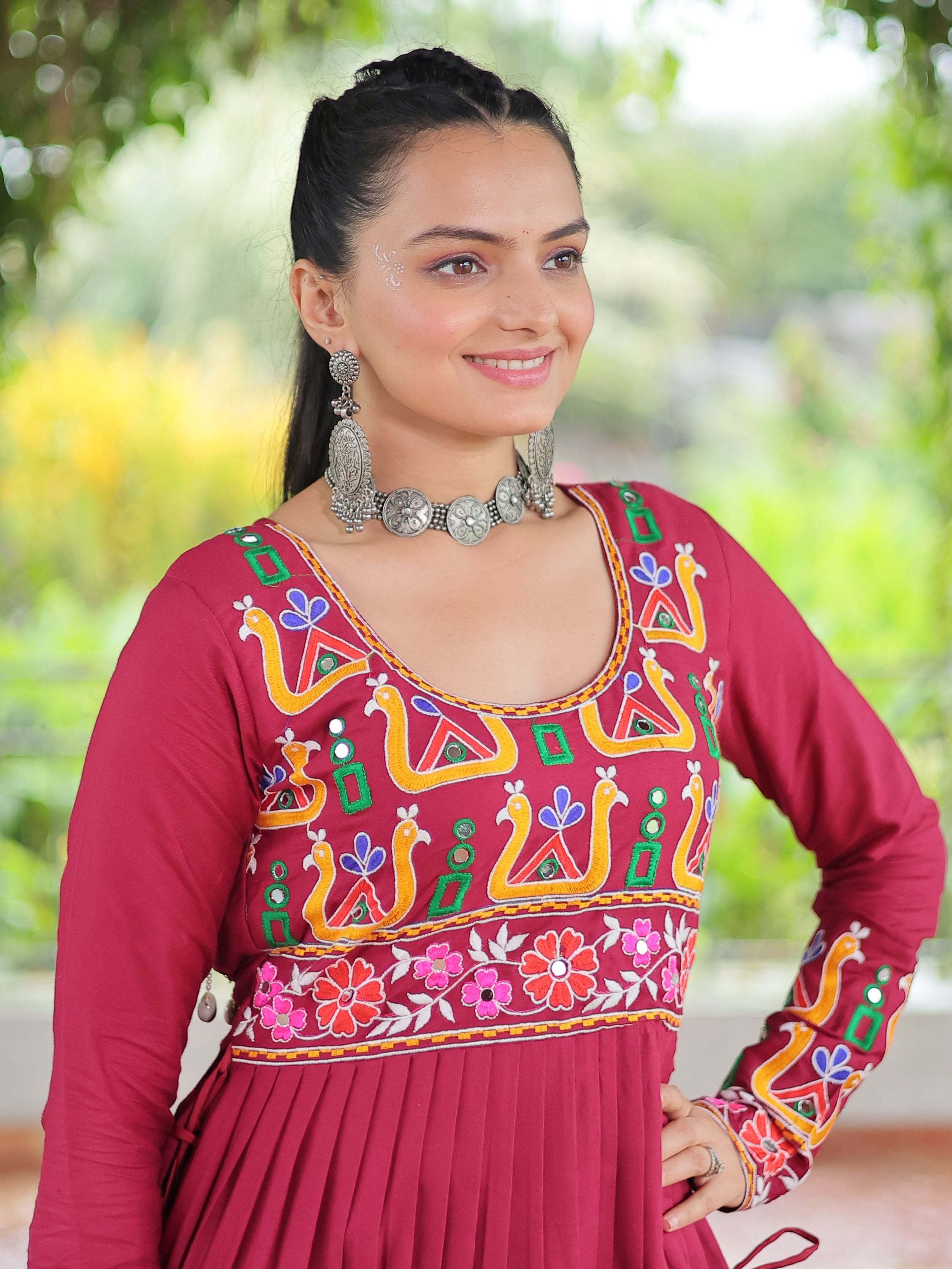 Embrace the fusion of tradition and contemporary charm with this elegant Nayra Cut Kurti in vibrant red color. Crafted from premium 14 Kg Rayon, the kurti features intricate Kutchi Gamthi embroidery that celebrates heritage artistry. The Nayra cut silhouette adds a flattering flare, while the full sleeves and round neck ensure timeless elegance—perfect for festive wear, college days, or casual ethnic styling.