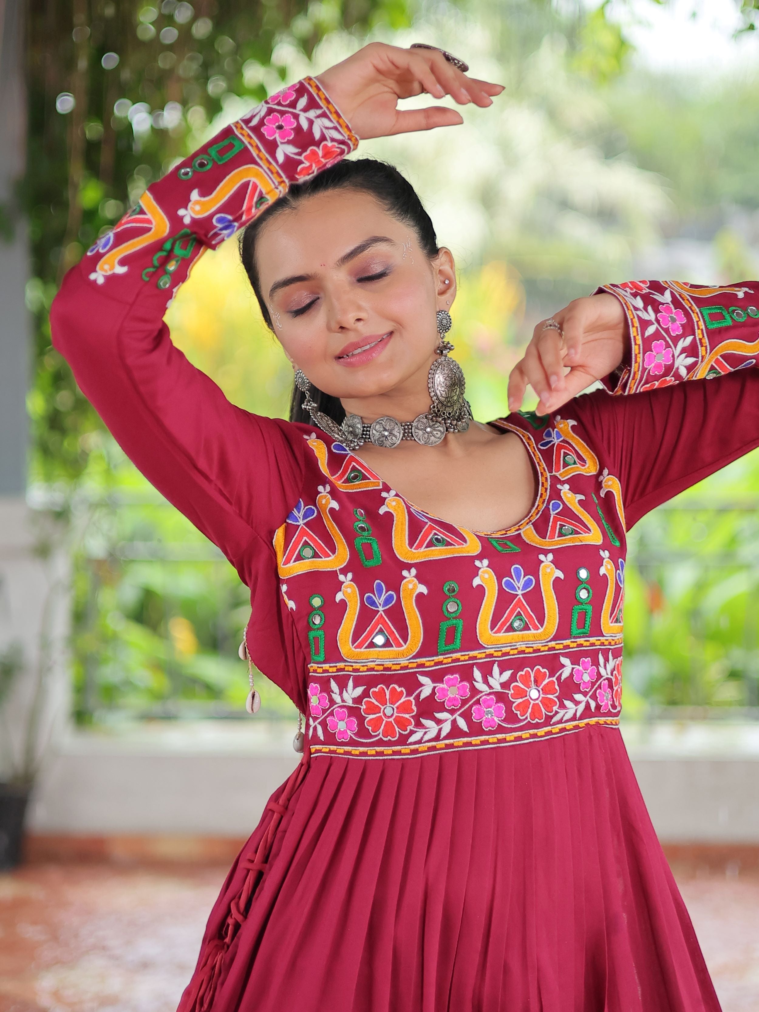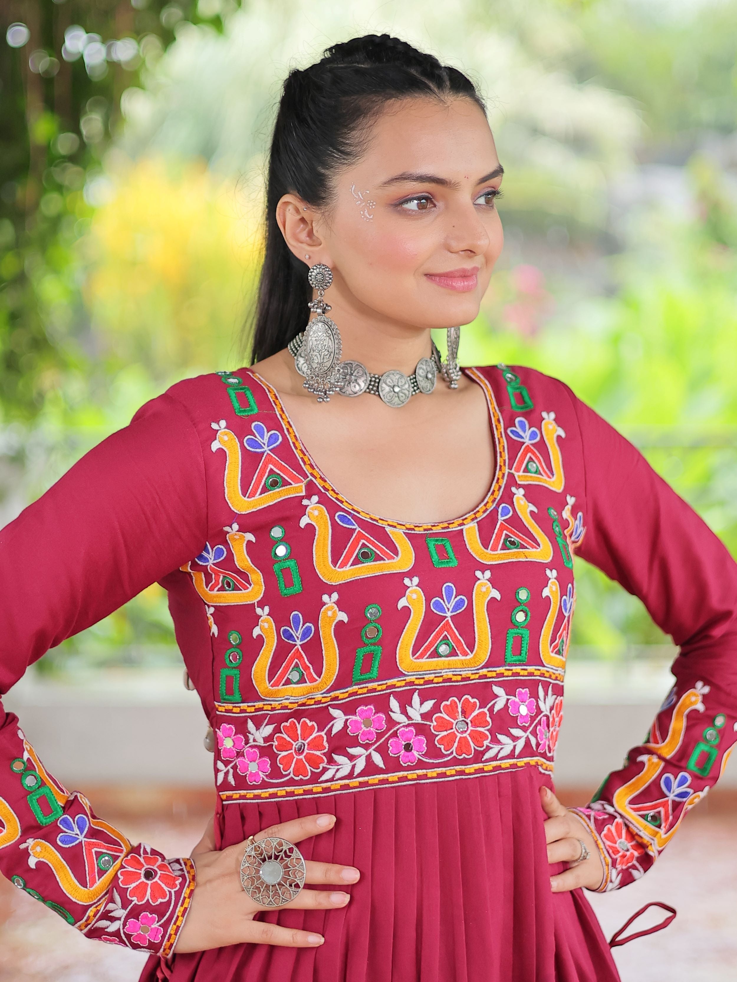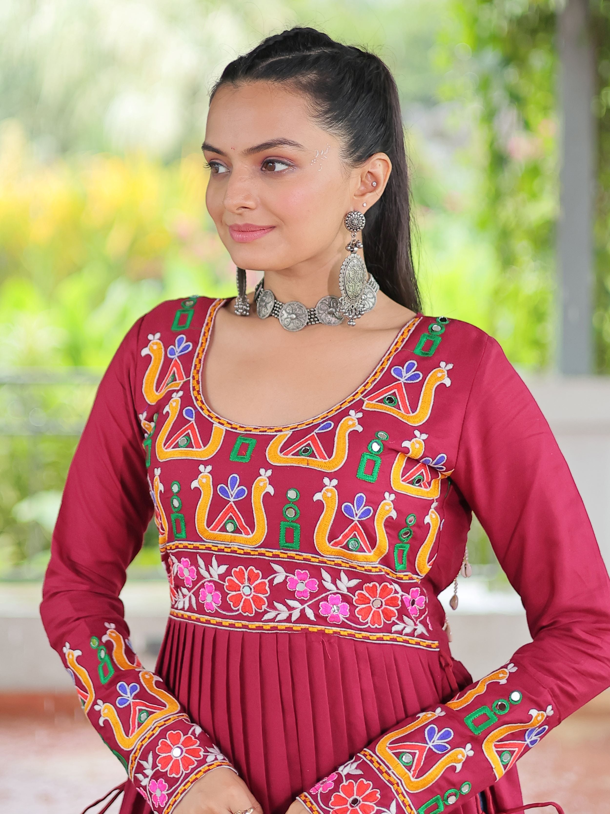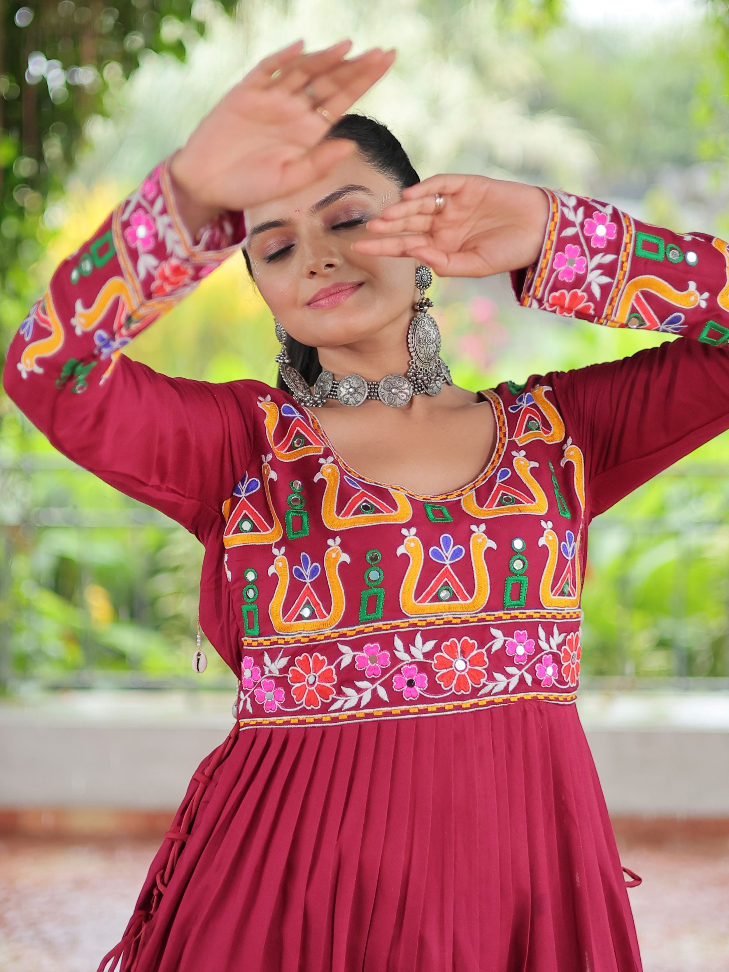Embrace the fusion of tradition and contemporary charm with this elegant Nayra Cut Kurti in vibrant red color. Crafted from premium 14 Kg Rayon, the kurti features intricate Kutchi Gamthi embroidery that celebrates heritage artistry. The Nayra cut silhouette adds a flattering flare, while the full sleeves and round neck ensure timeless elegance—perfect for festive wear, college days, or casual ethnic styling.