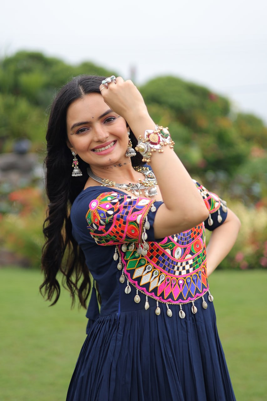 Step into the spirit of Navratri with this elegant and vibrant Black Gown, crafted in premium 14kg Rayon with traditional Kutchi Gamthi embroidery and cotton print work. Its dramatic 12-meter flair and 3-layer frill stitching create the perfect festive twirl, while the cotton lining ensures comfort through every celebration.