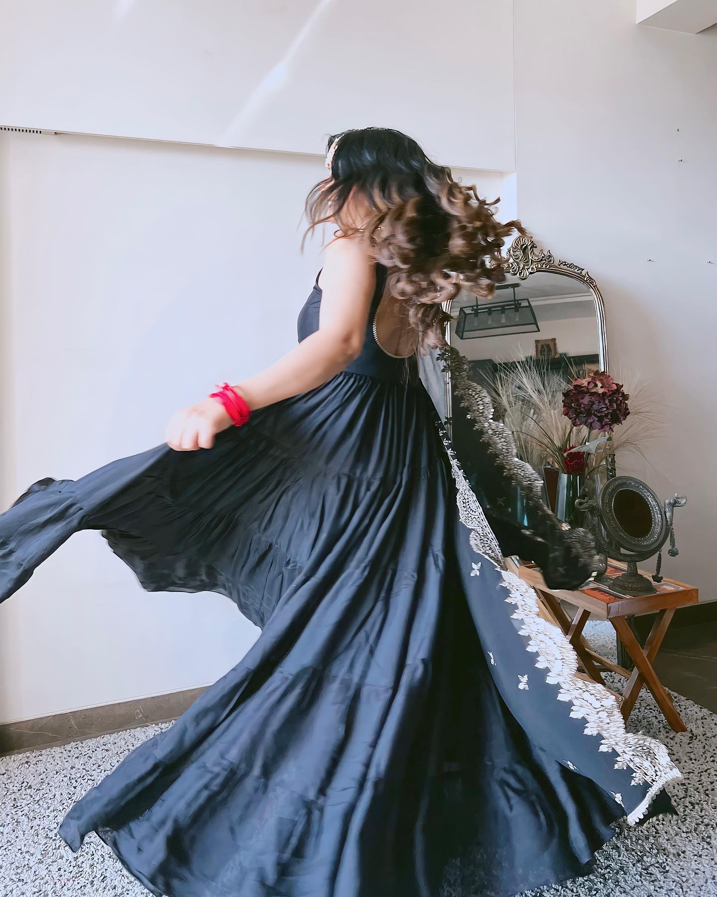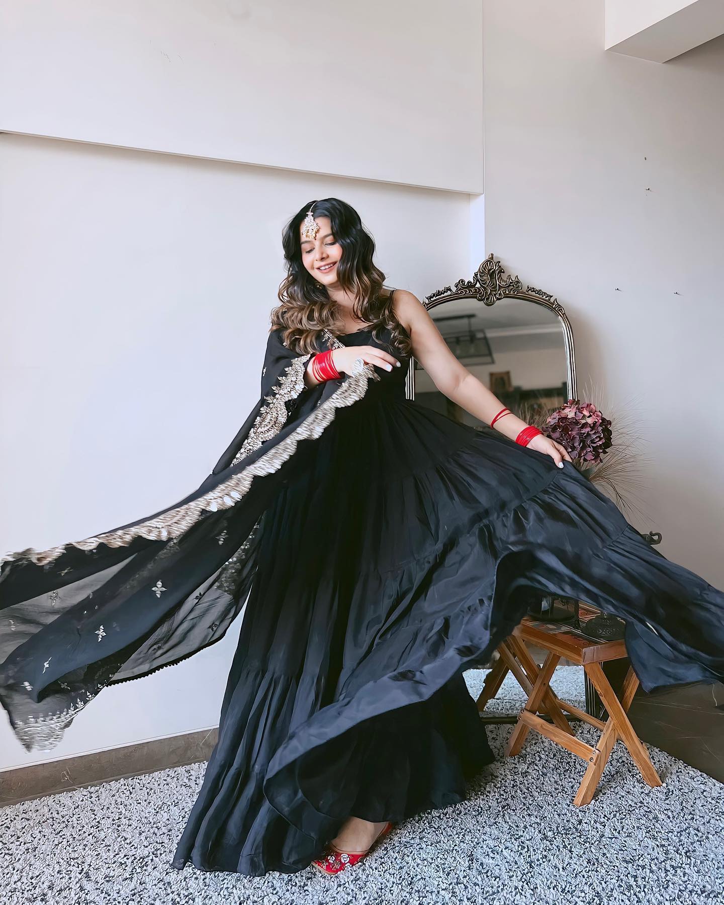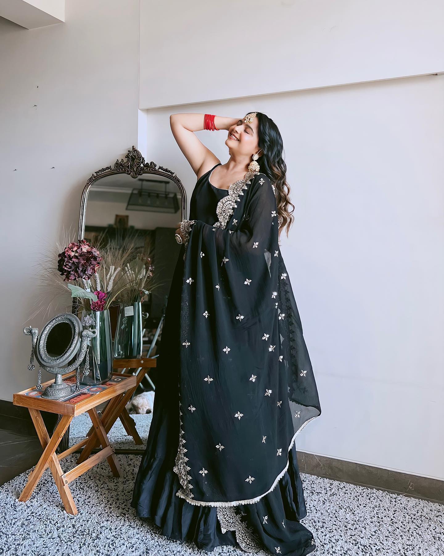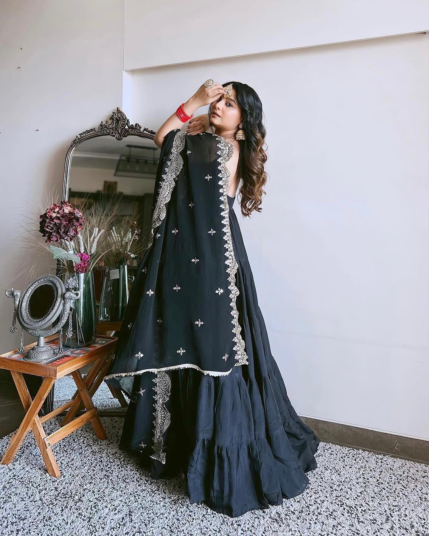 Get ready to stun in the Devayani Black Georgette Anarkali Gown Set. With its flowing fabric and elegant design, this set will make you feel like royalty. Perfect for any special occasion, this set is both stylish and comfortable. Claim your rightful place in the spotlight!