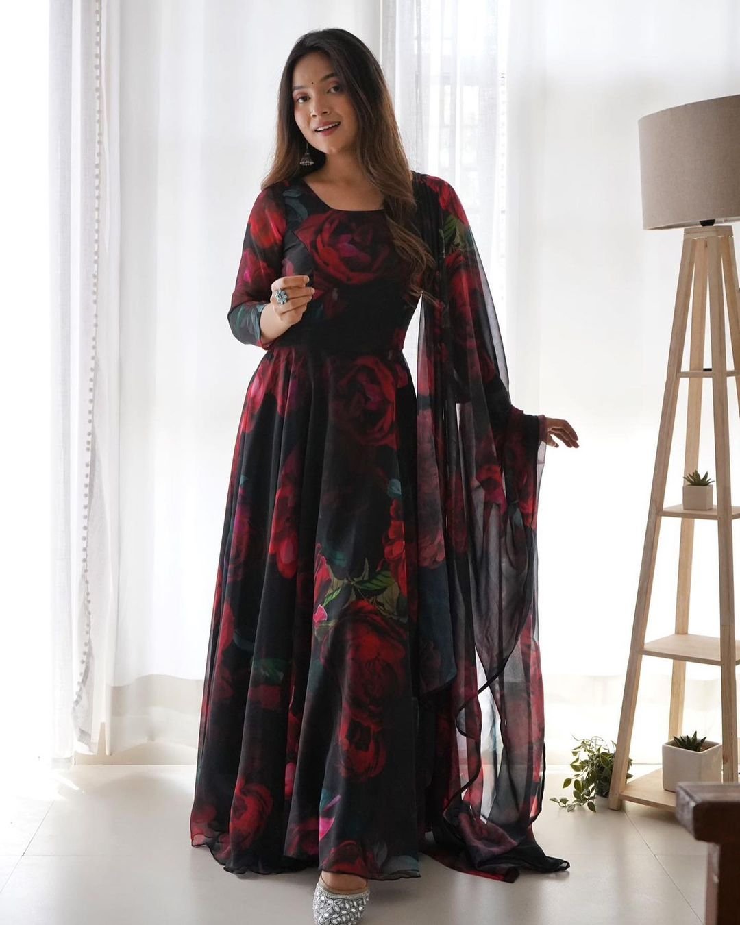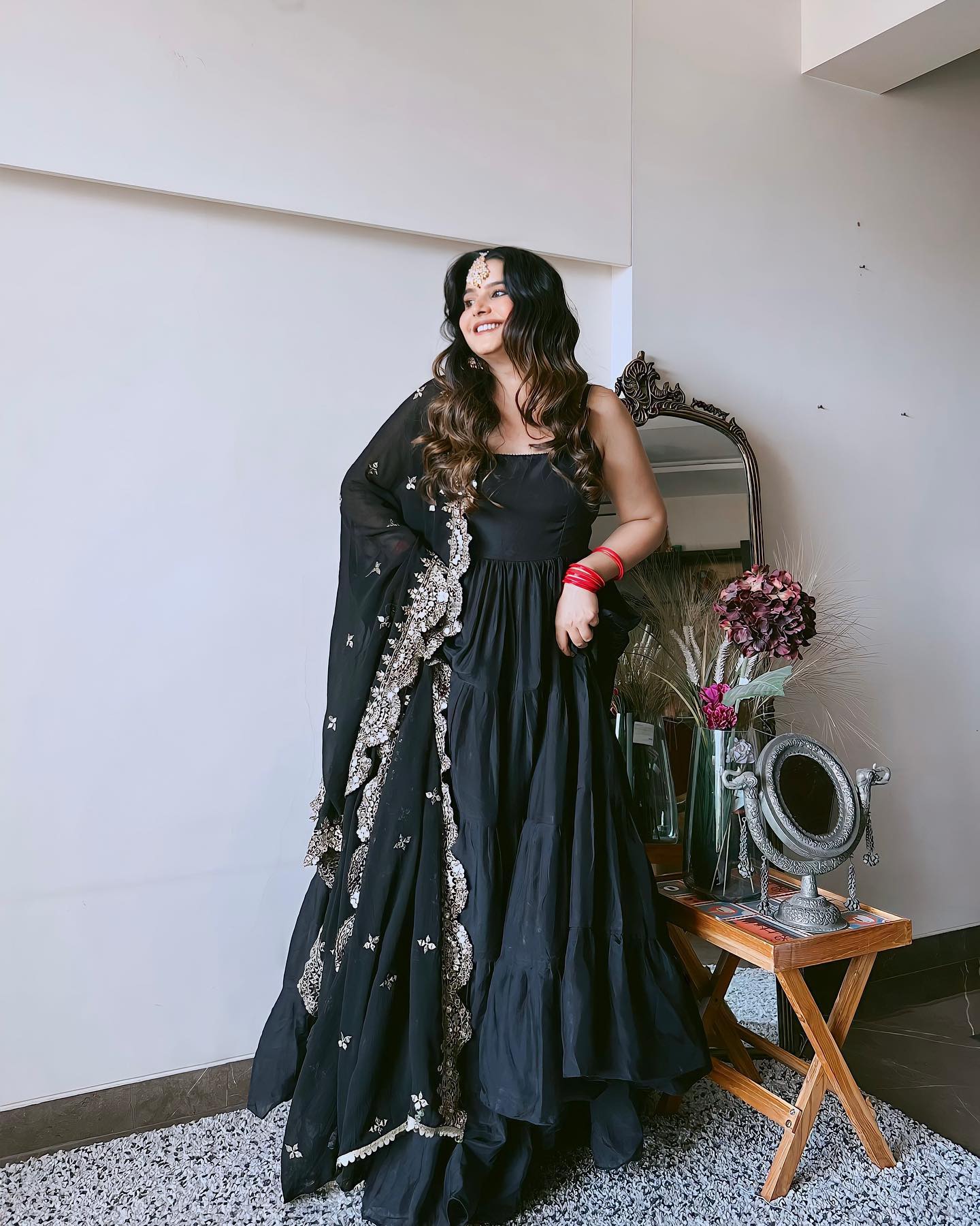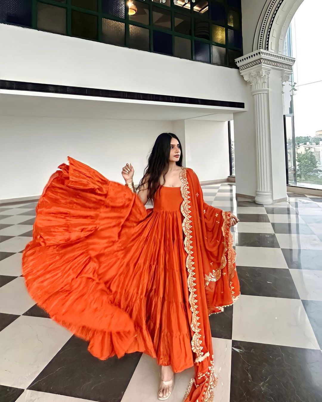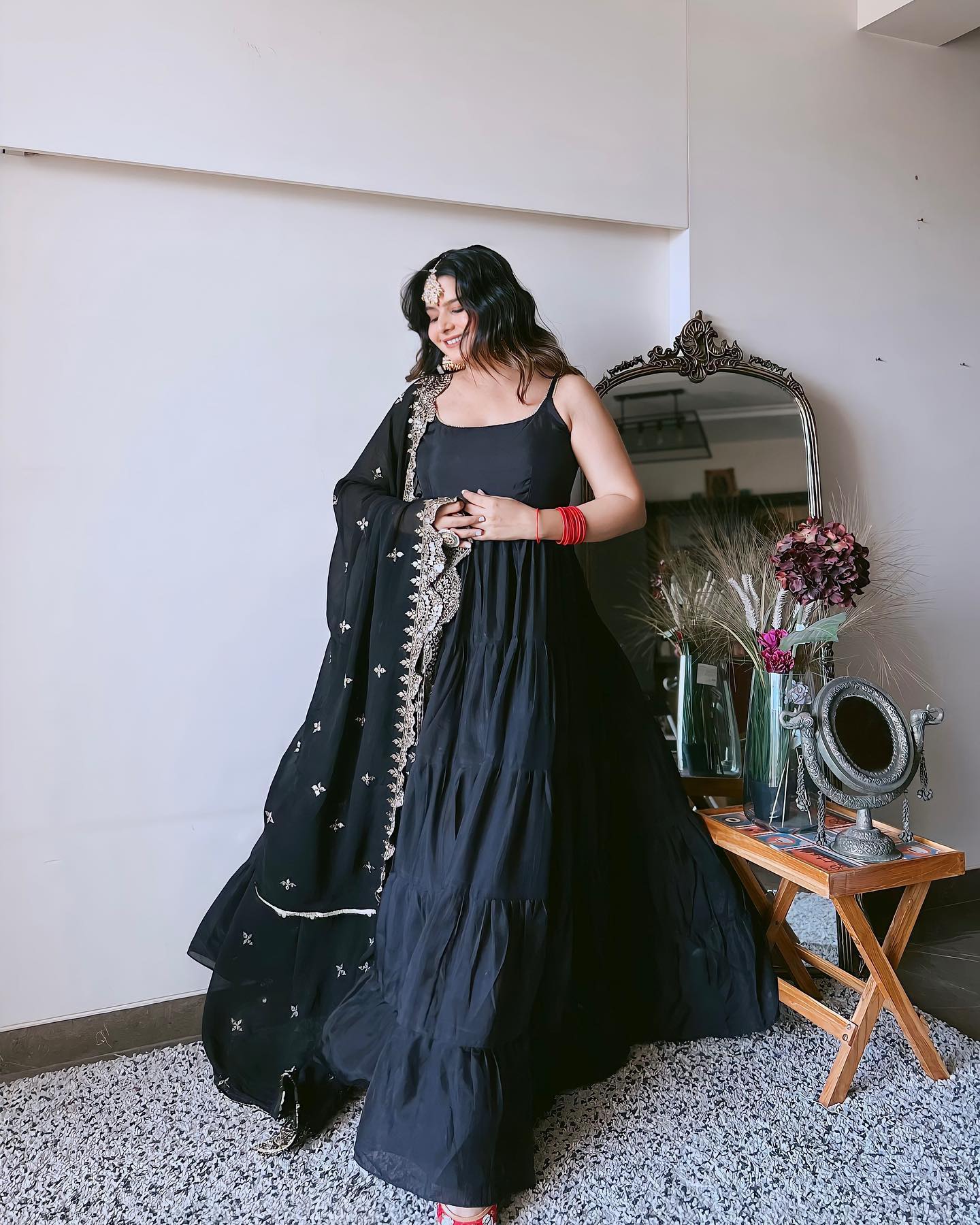 Step into the spotlight with our Emerald Elegance Green Anarkali Faux Georgette Ruffle Flair Gown Set. Crafted to enchant, this ensemble exudes sophistication and grace. The rich emerald green hue accentuates the faux georgette fabric, while the exquisite ruffle flair adds a touch of elegance. With its flowing silhouette and intricate detailing, including delicate embellishments and fine craftsmanship, this ensemble is perfect for special occasions and celebrations. Embrace timeless style and effortless glamour with our Emerald Elegance Anarkali Gown Set, designed to make you feel like royalty with every step you take.