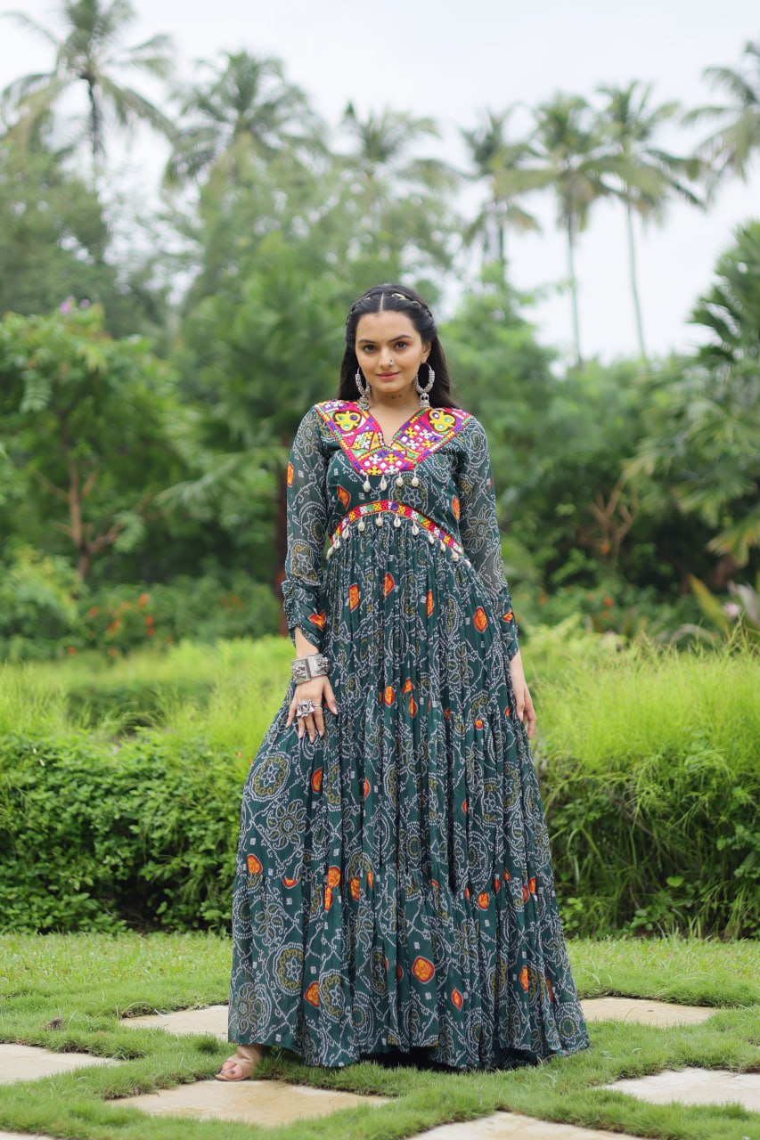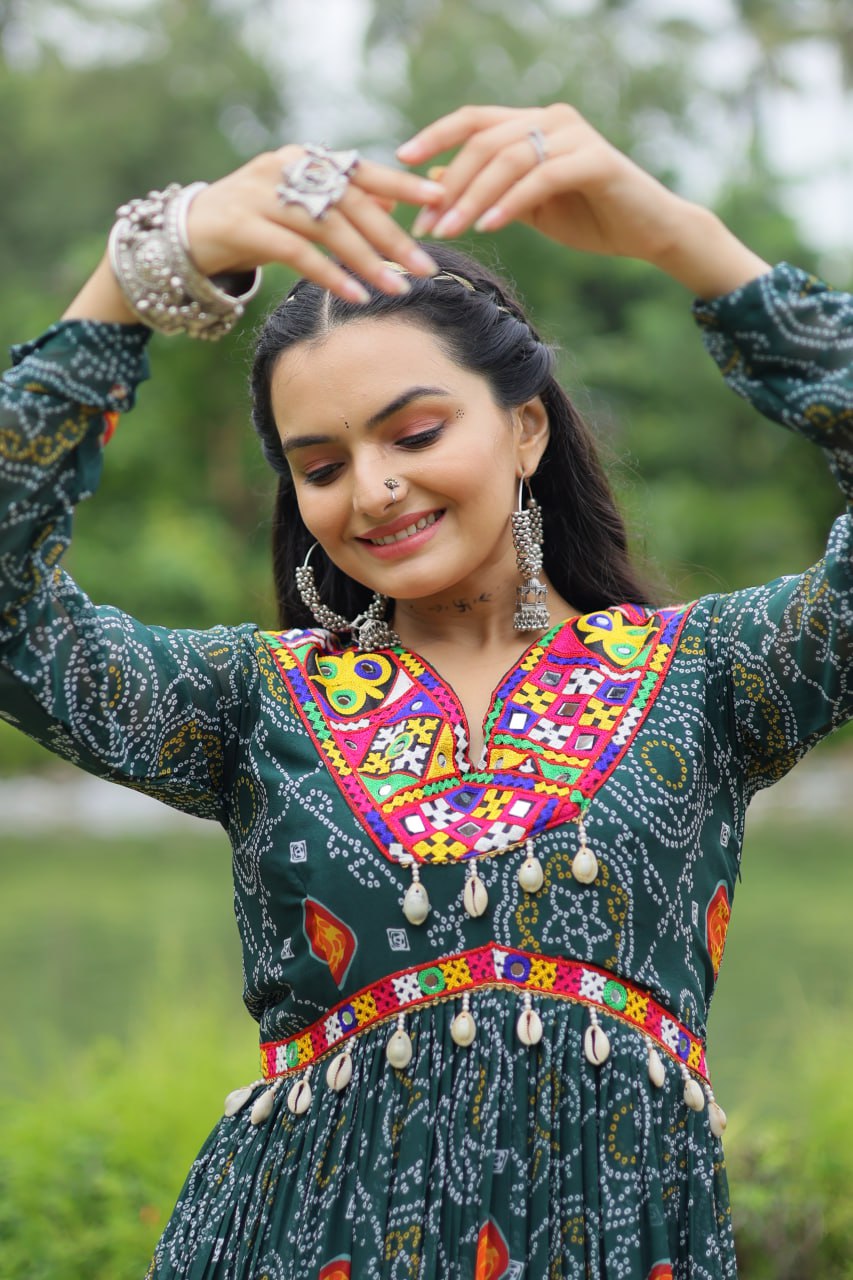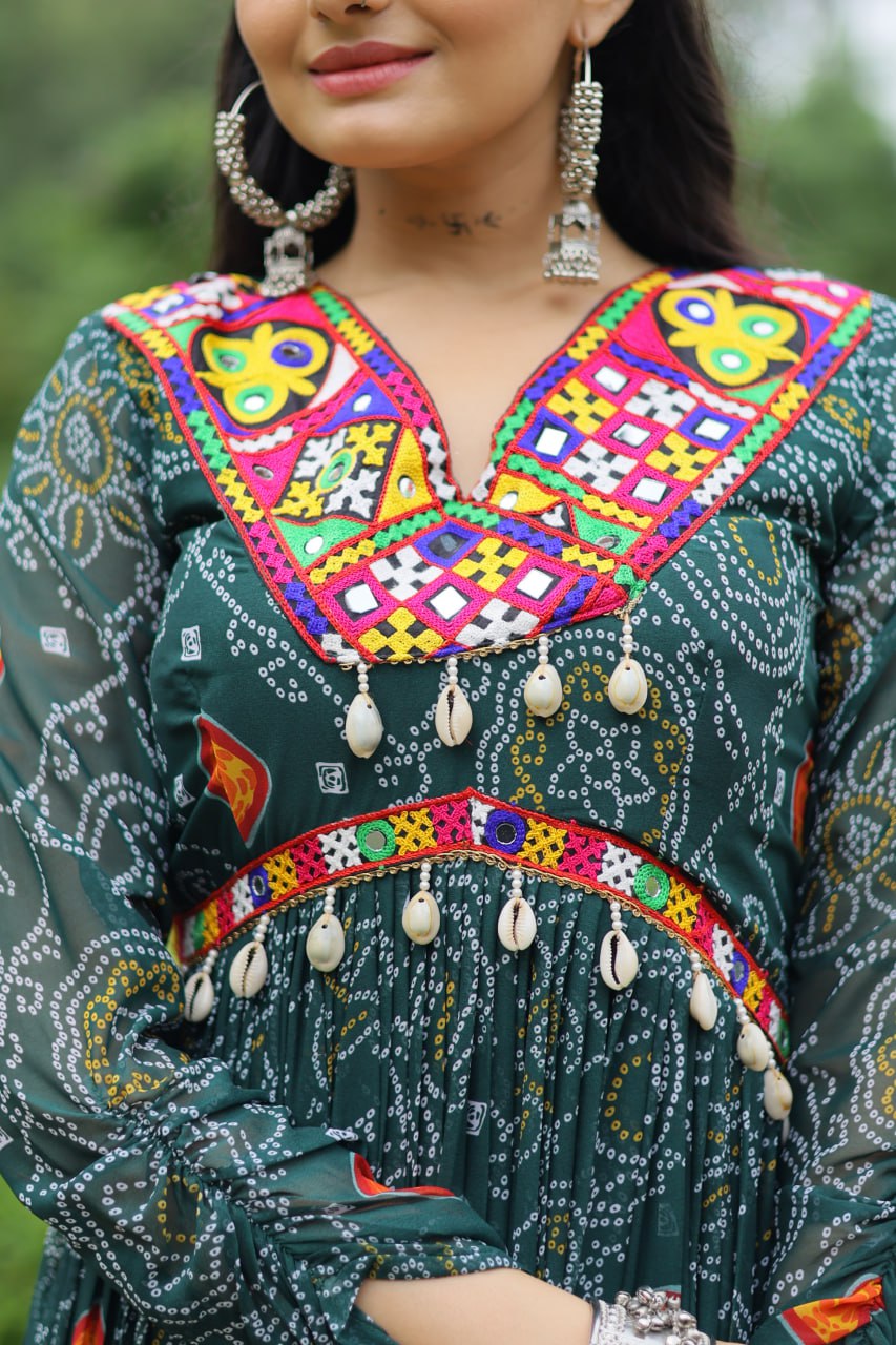 This Dhruvi Green Georgette Bandhani Printed Navratri Gown is a perfect blend of traditional Kutchi Gamthi artwork and modern fashion. Made with high-quality georgette fabric, this gown features intricate bandhani prints that are synonymous with Navratri celebrations. Elevate your style and grace with this elegant and vibrant ensemble.