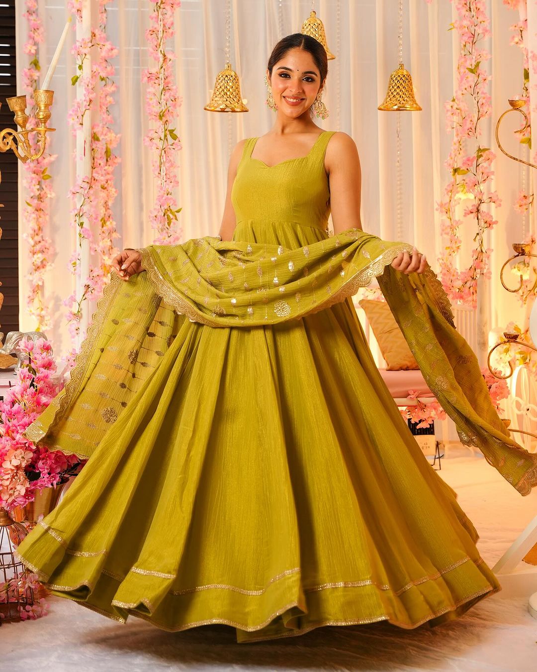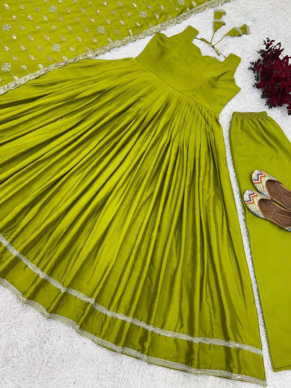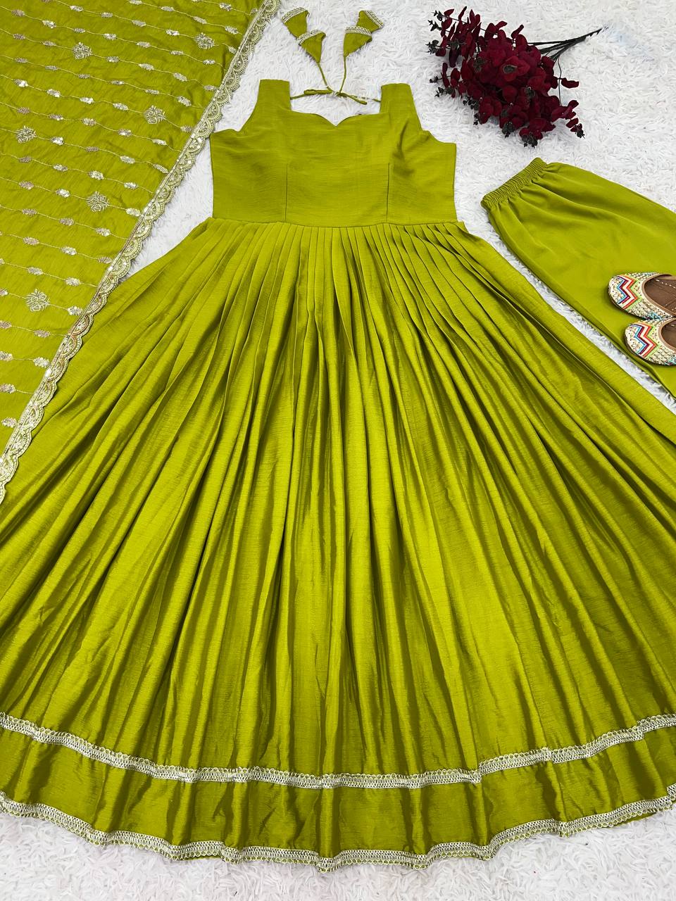 Crafted from high-quality chinon silk, this sleeveless gown set features elegant embroidery for a luxurious touch. Perfect for formal occasions, this dress exudes sophistication and style. Elevate your wardrobe with this versatile and timeless piece.