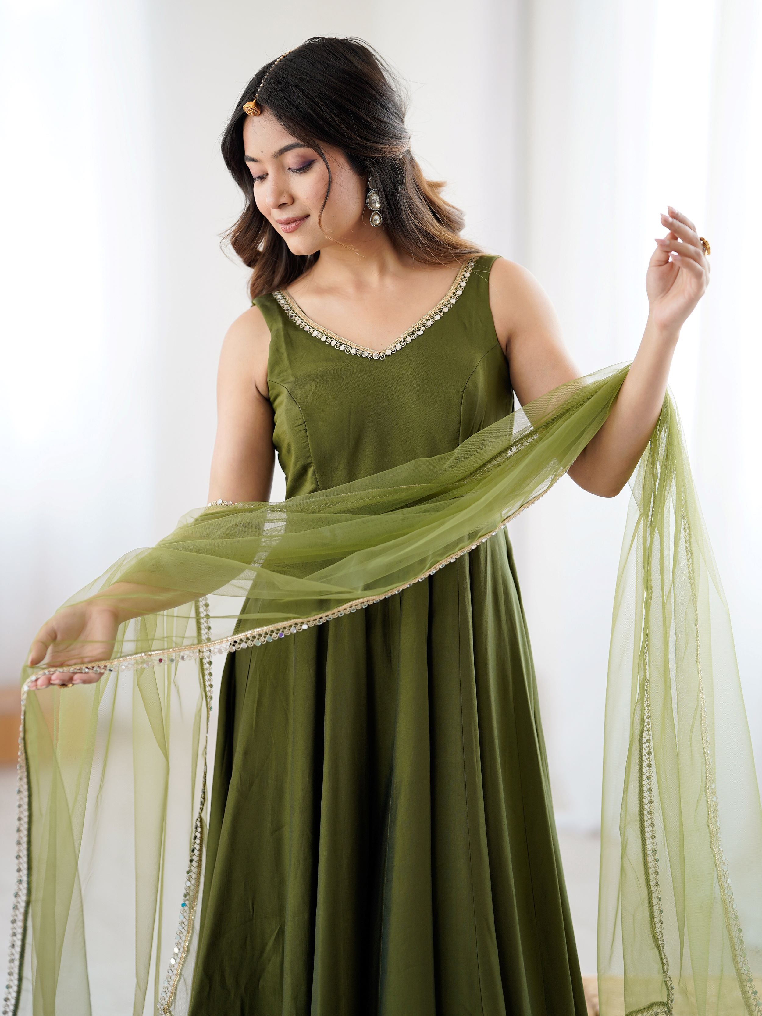 Green Roman Silk Chanderi Mirror Lace Anarkali Suit with Dupatta