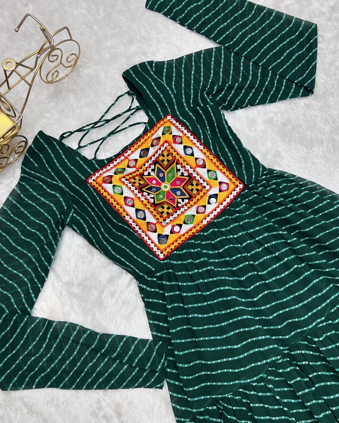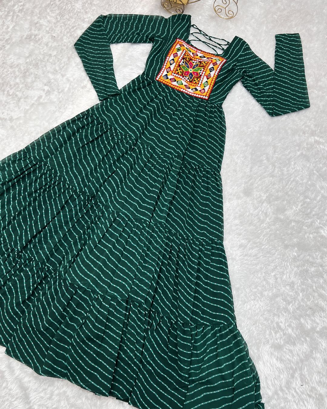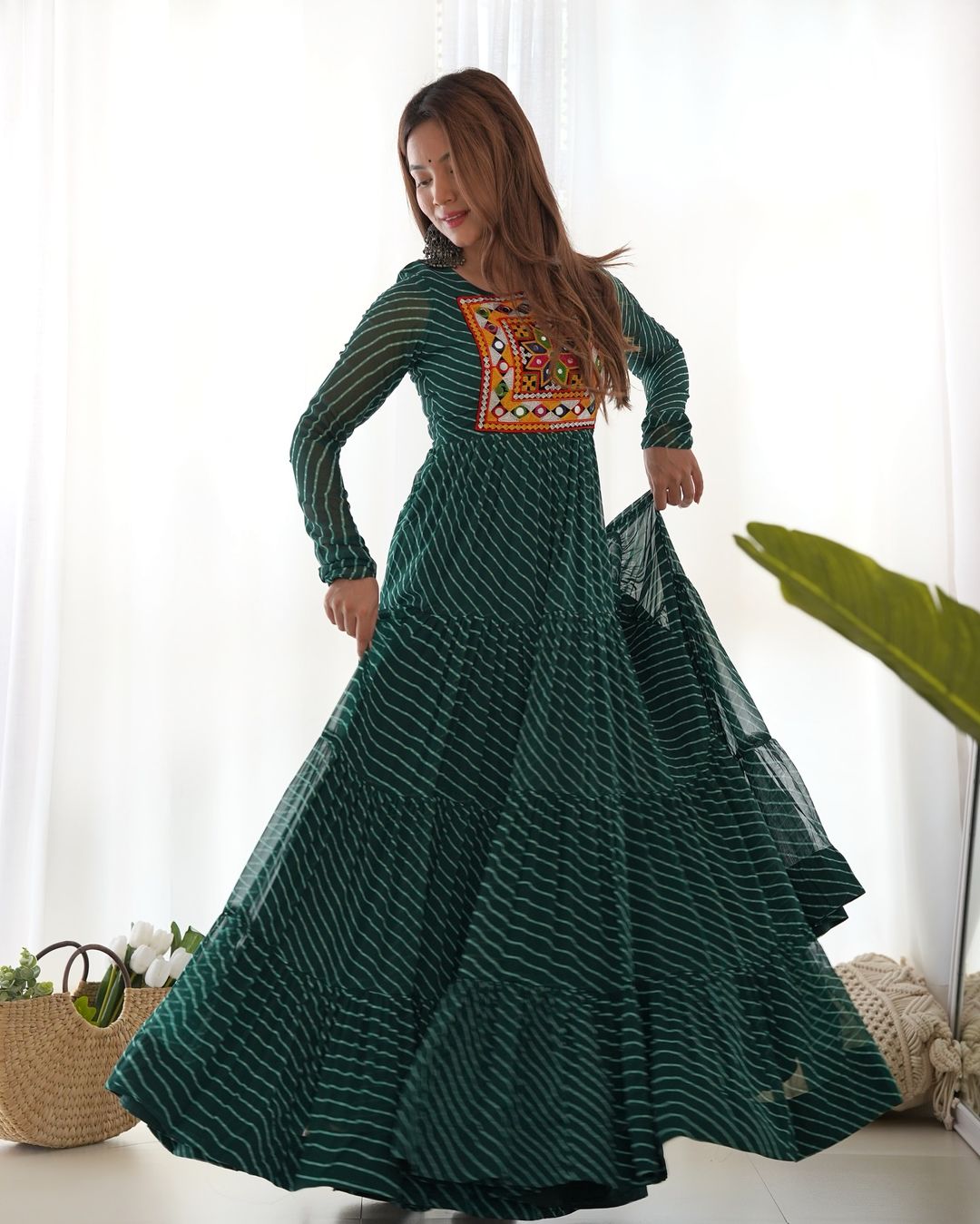 Expertly crafted for the festive season, the Manvitha Green Georgette Leheriya Printed Navratri Gown is a perfect blend of traditional style and contemporary fashion. Made of high quality georgette fabric, this gown features a stunning leheriya print that adds a touch of elegance to the outfit. Impress your friends and family with this stylish and comfortable gown.