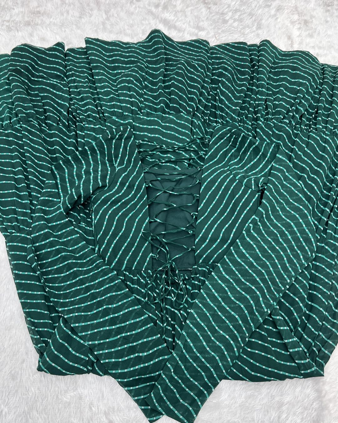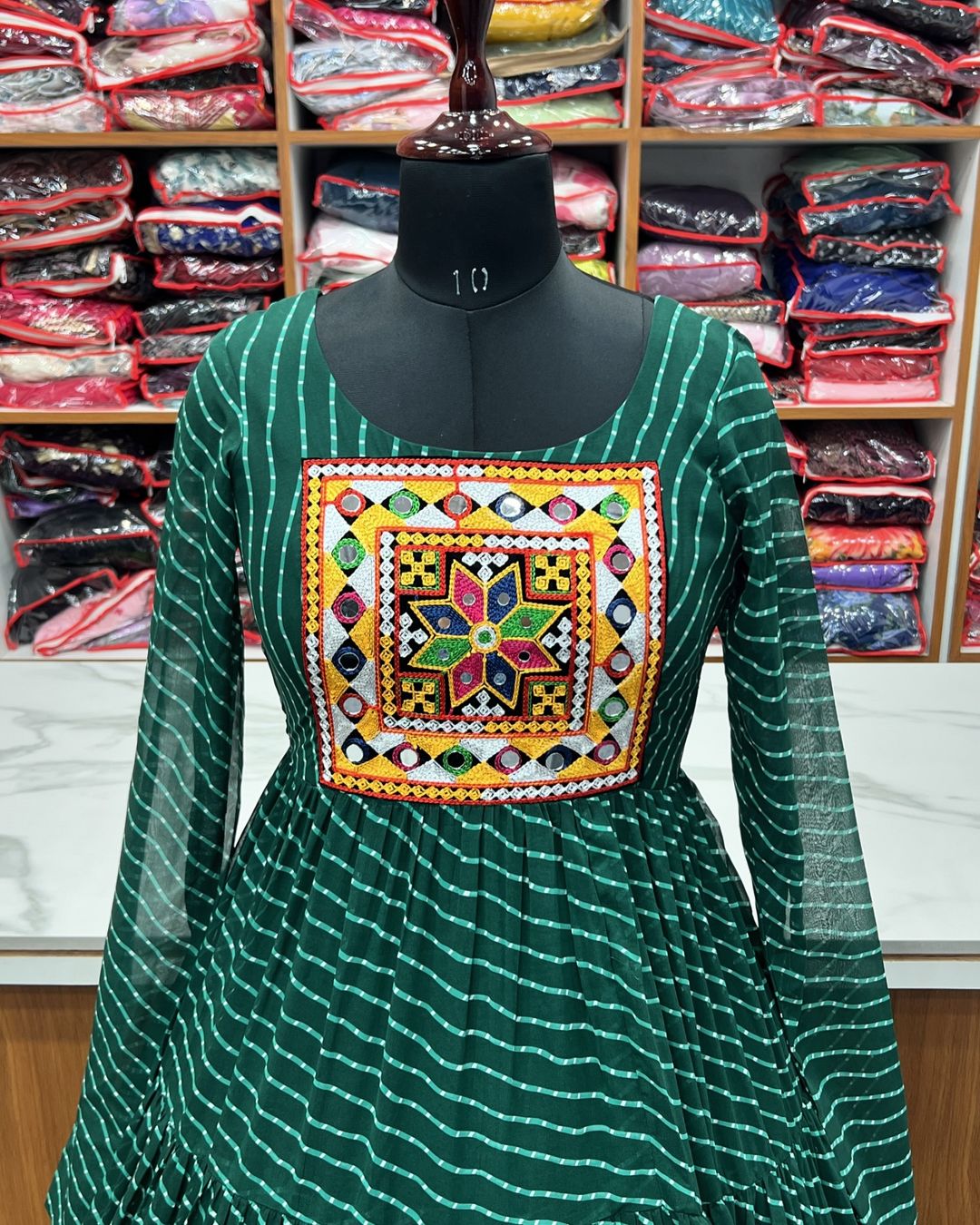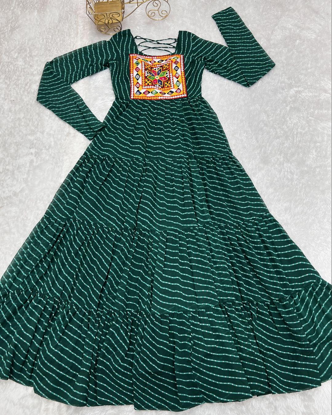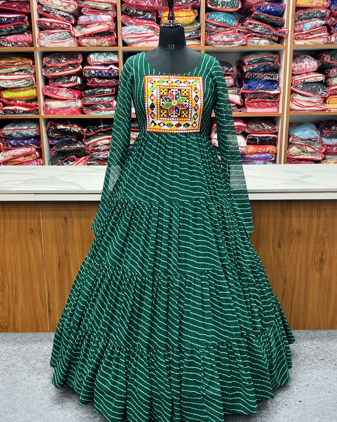 Expertly crafted for the festive season, the Manvitha Green Georgette Leheriya Printed Navratri Gown is a perfect blend of traditional style and contemporary fashion. Made of high quality georgette fabric, this gown features a stunning leheriya print that adds a touch of elegance to the outfit. Impress your friends and family with this stylish and comfortable gown.