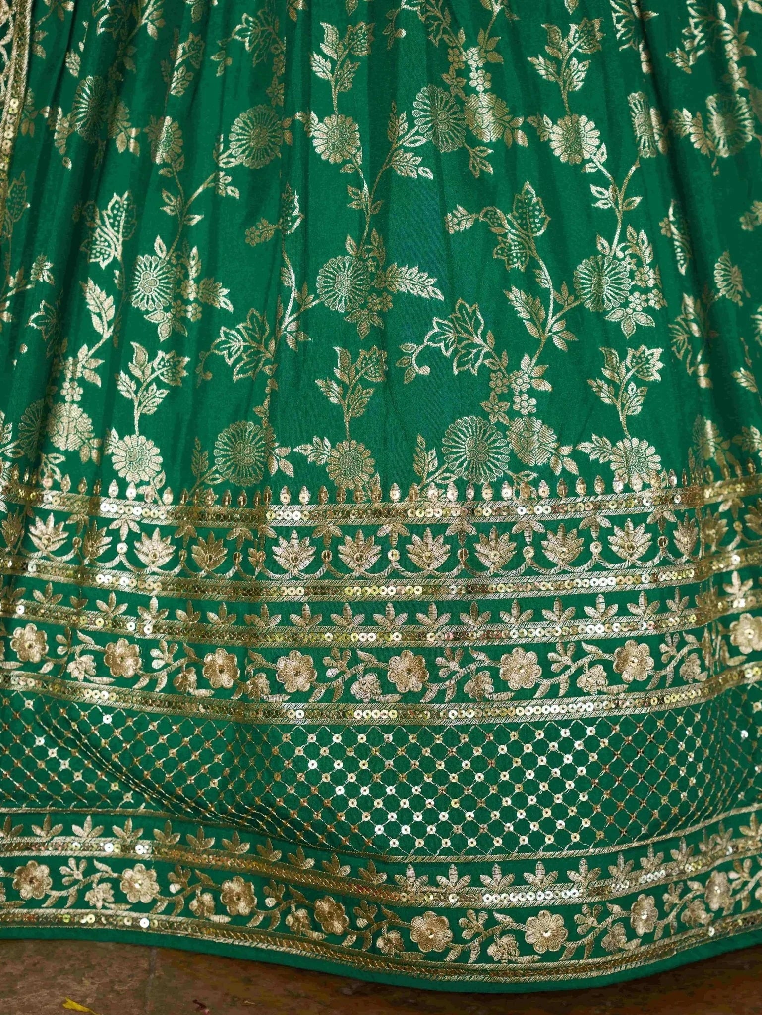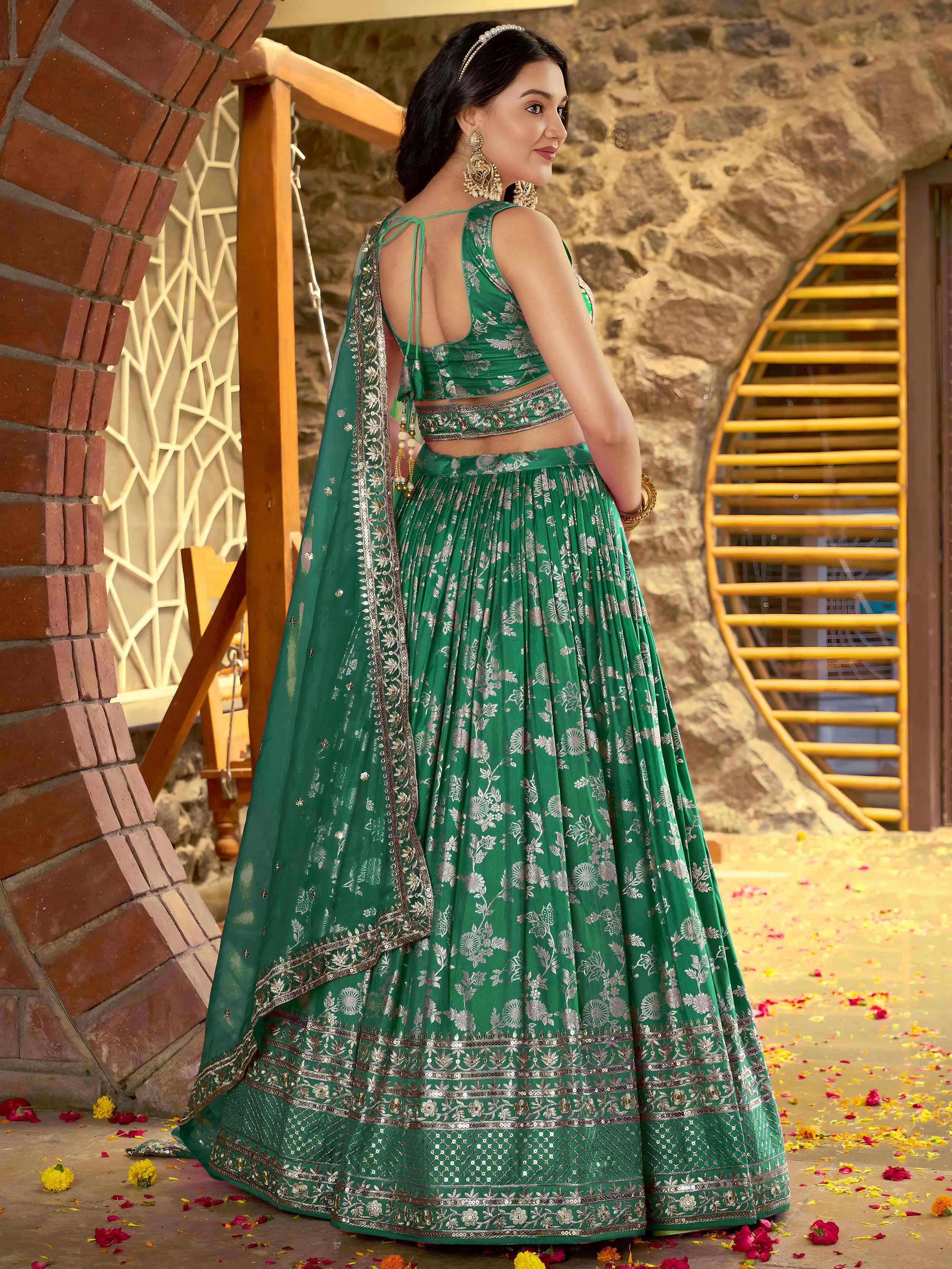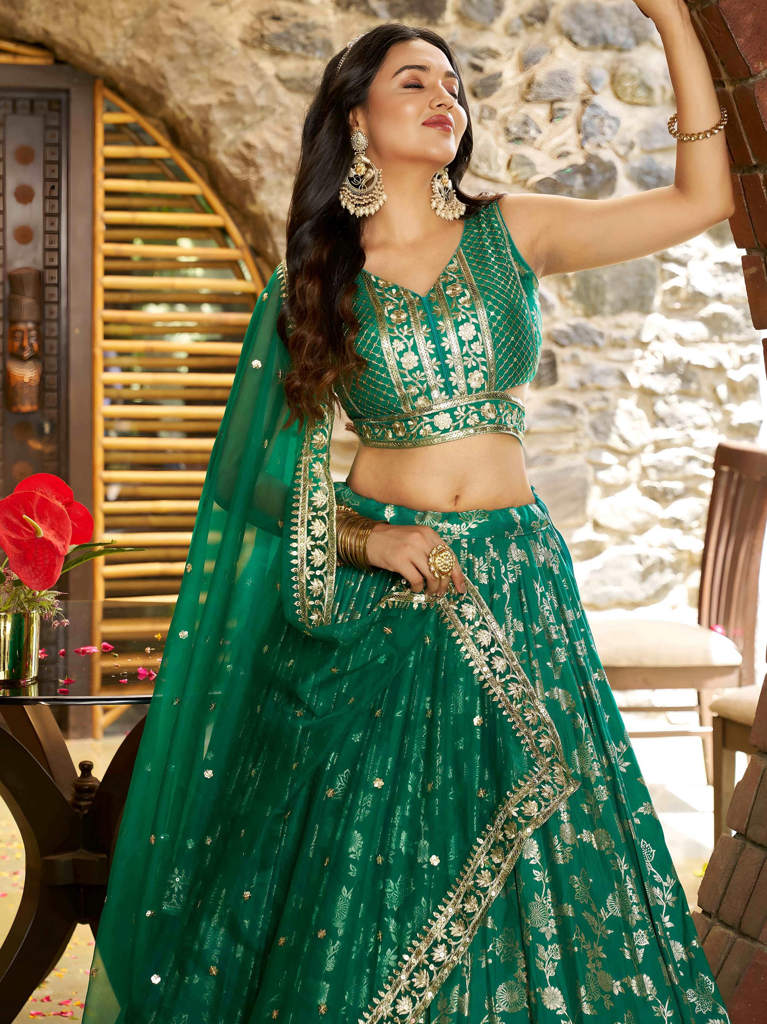 Command attention at every celebration with this Dola Silk Jacquard Lehenga Choli Set, intricately embroidered with Zari and Sequin Work. Paired with a delicate Organza Sequins Dupatta, this ensemble reflects timeless elegance—perfect for festive occasions, weddings, receptions, and grand cultural events.