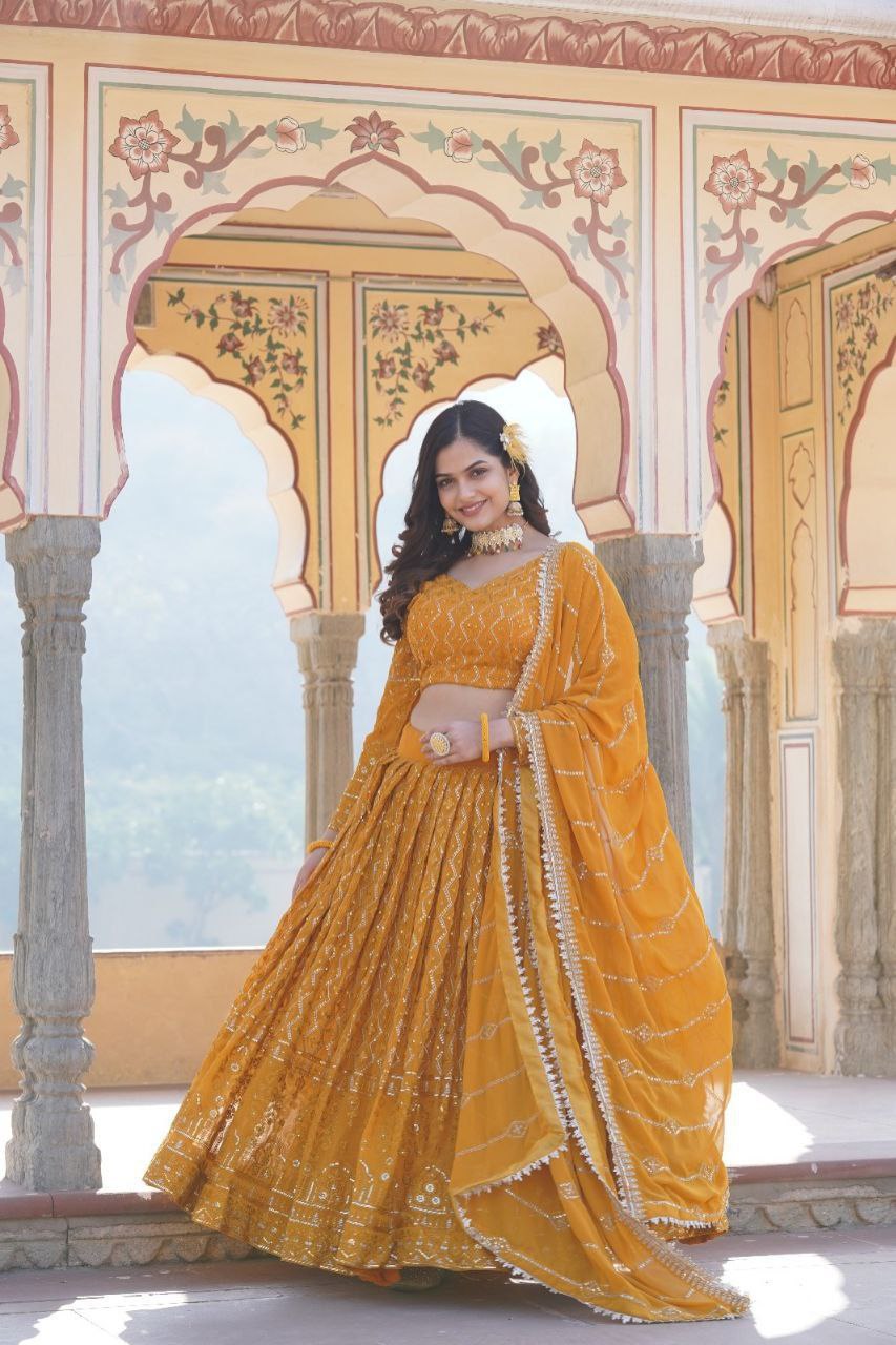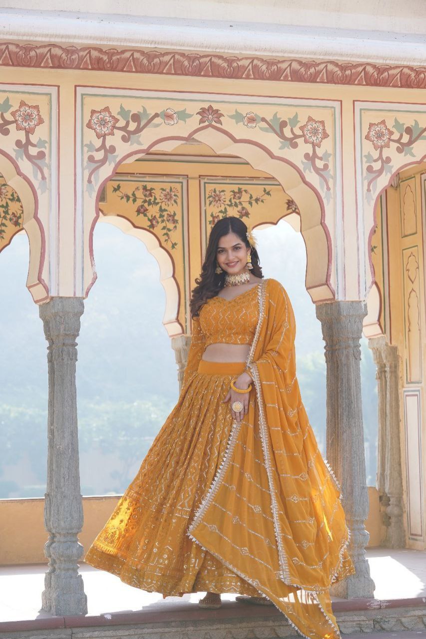 Expertly crafted from high-quality georgette, the Kalika Yellow Lehenga Set features stunning embroidery that adds a touch of elegance to any occasion. With its vibrant yellow hue, this set is sure to make you stand out. Feel confident and stylish in this beautifully designed lehenga set.