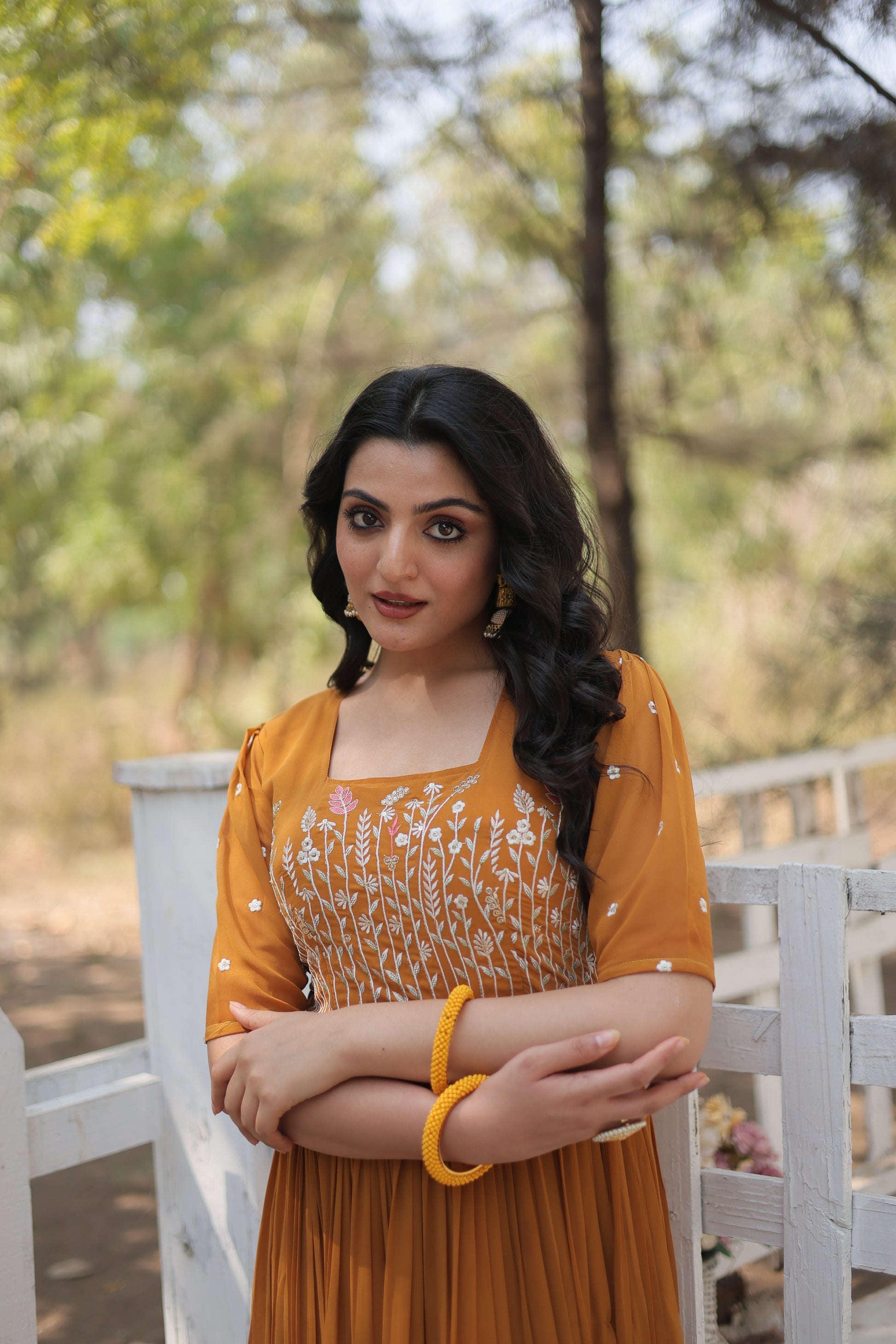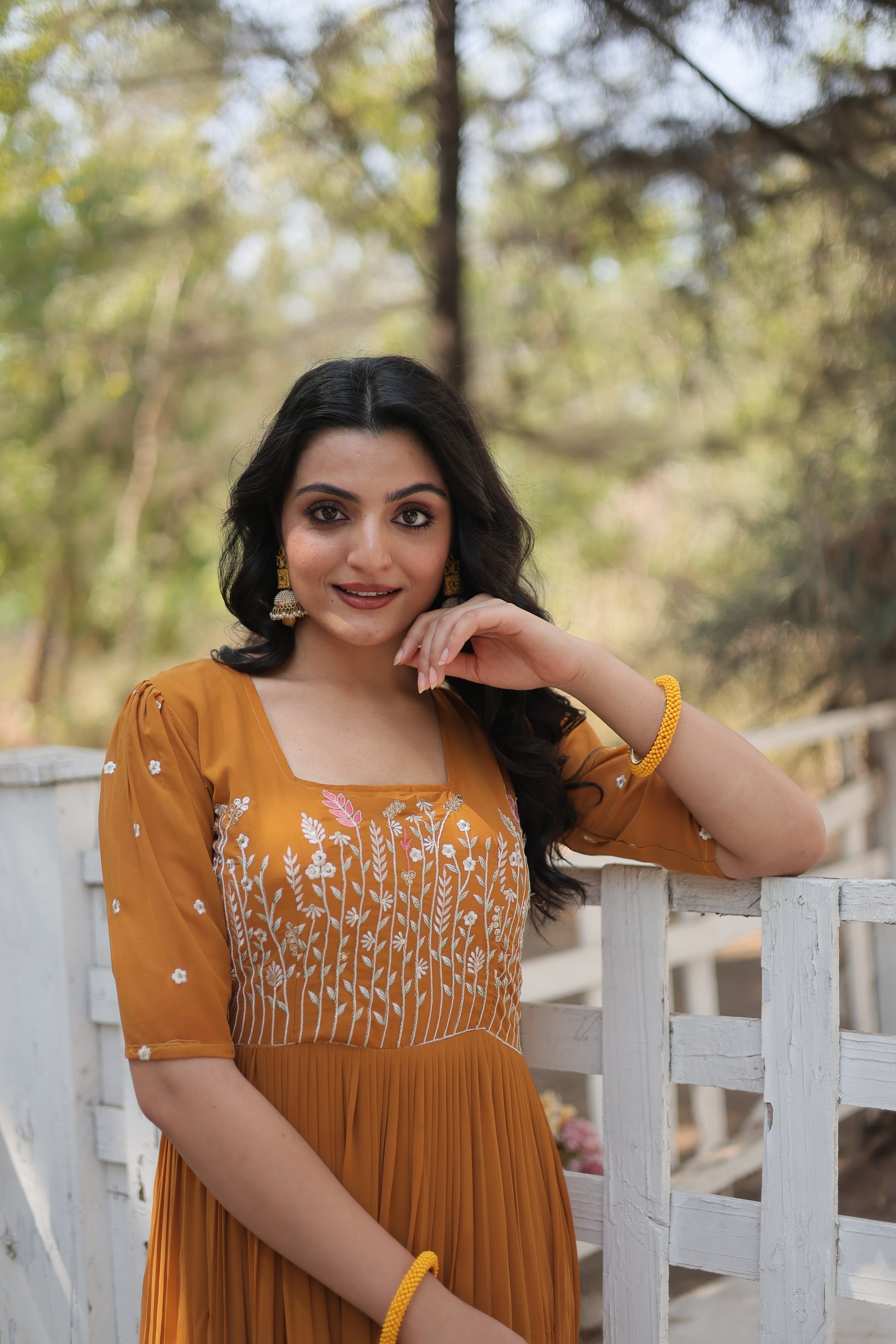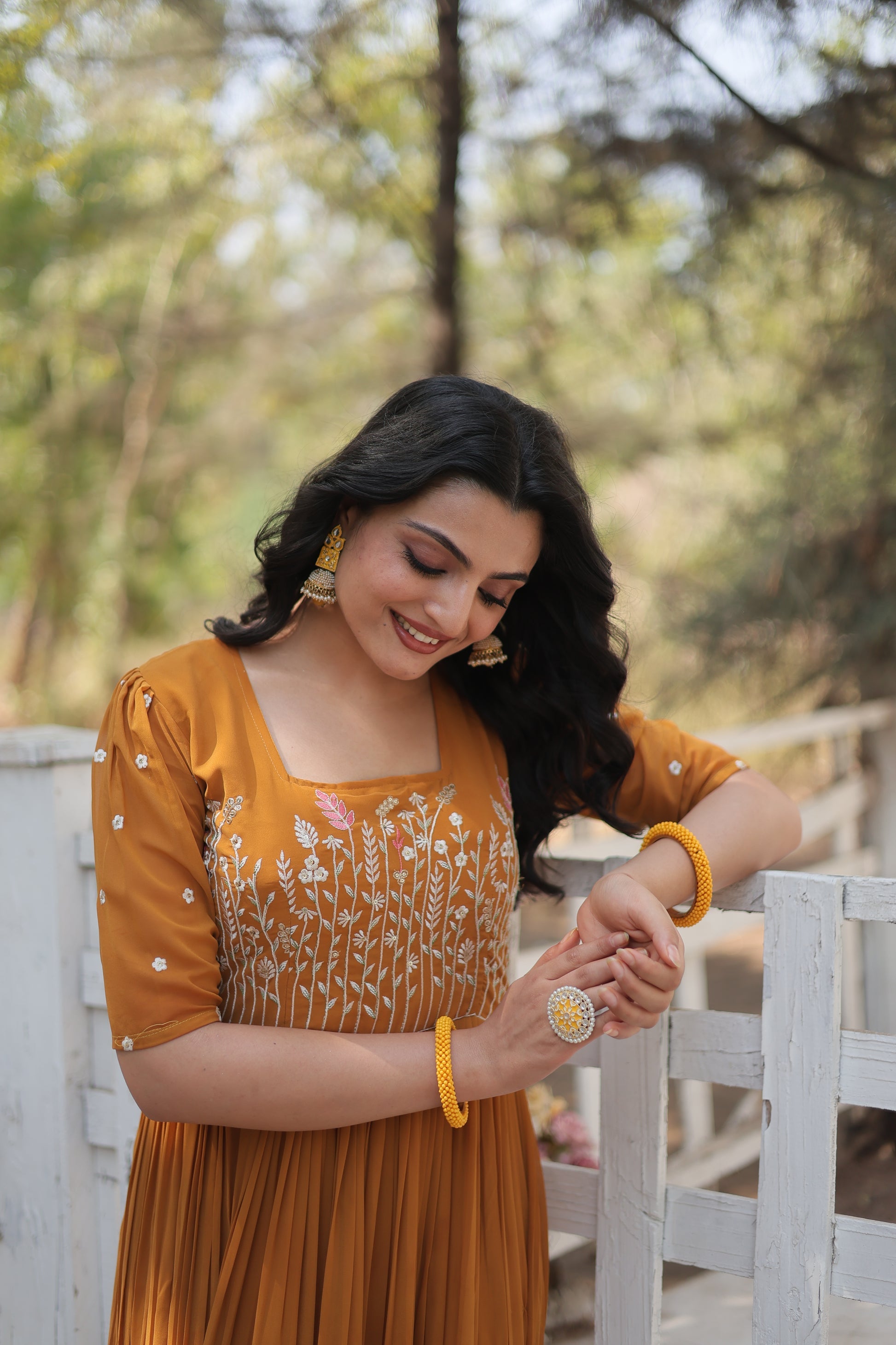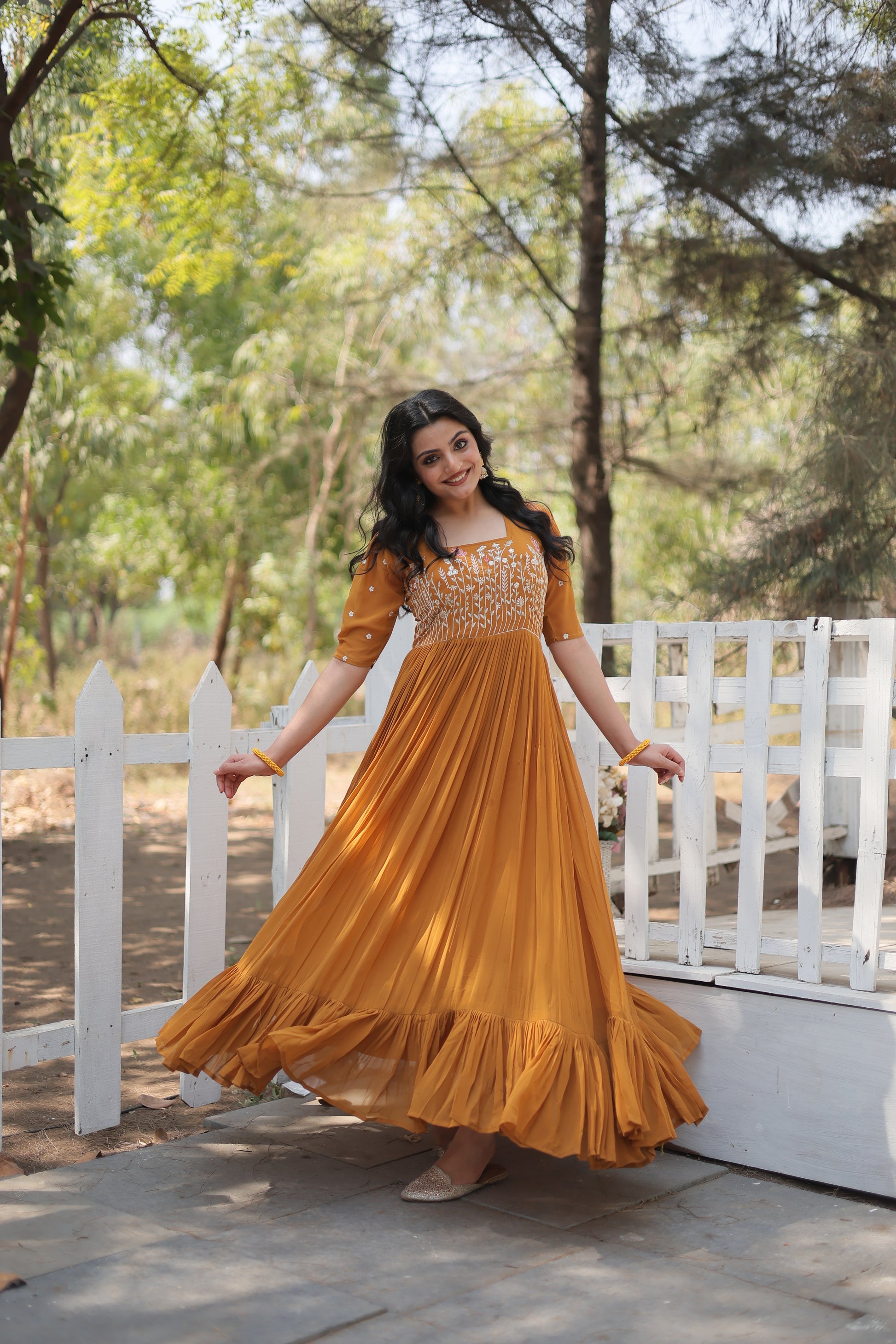 This Nitara Mustard Yellow Georgette Embroidered Anarkali Gown is the epitome of elegance and grace. Crafted with high-quality georgette, it features intricate embroidery that adds a touch of glamour to the outfit. The anarkali silhouette flatters every body type, making it a must-have for all your special occasions.