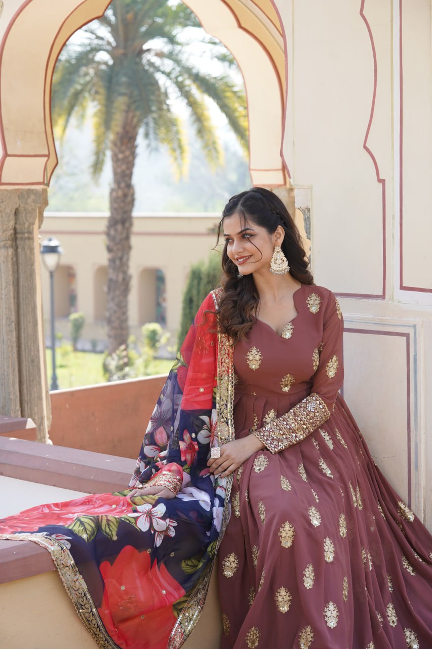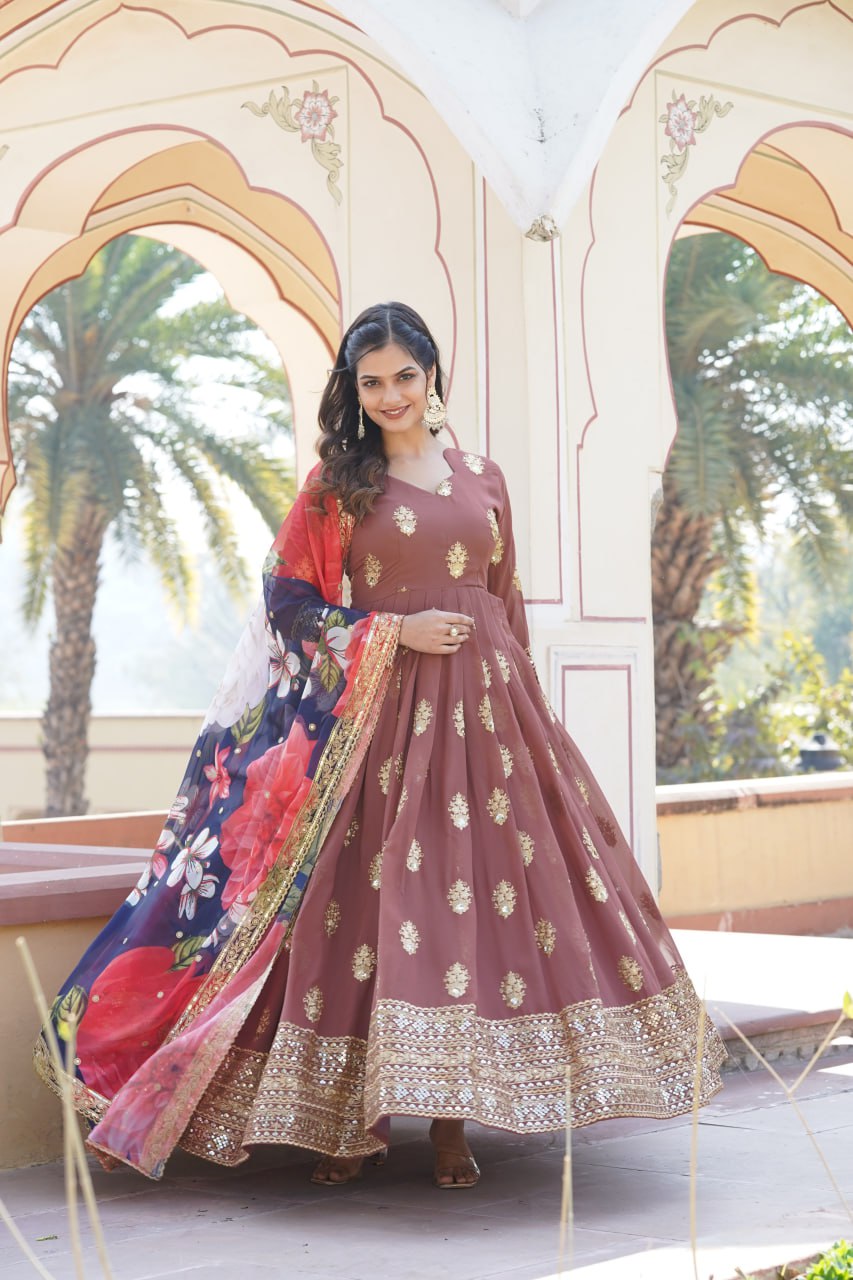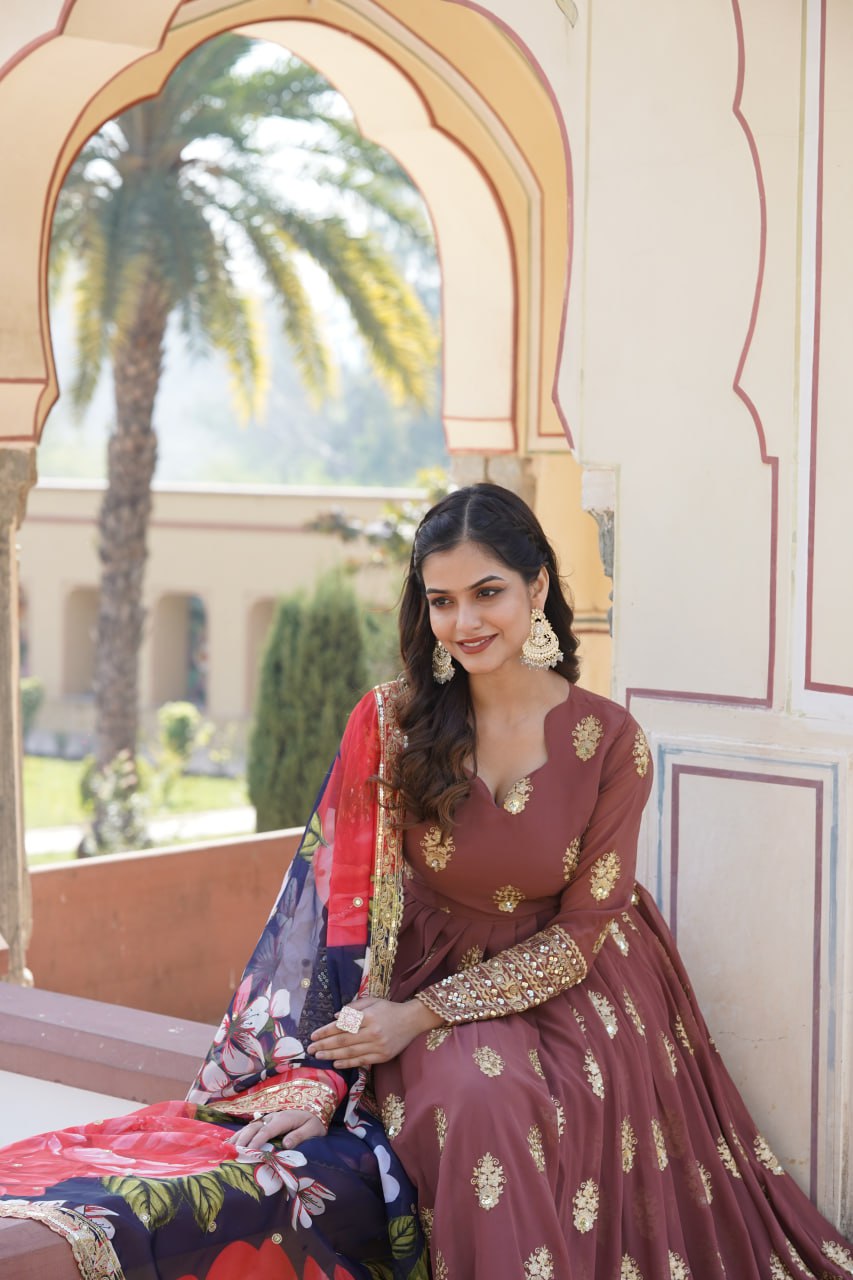 Padmini Georgette Brown Embroidery Anarkali Gown Set