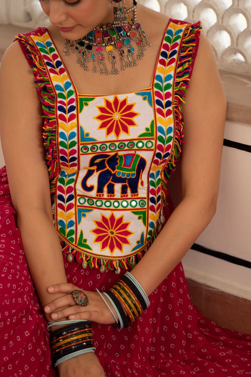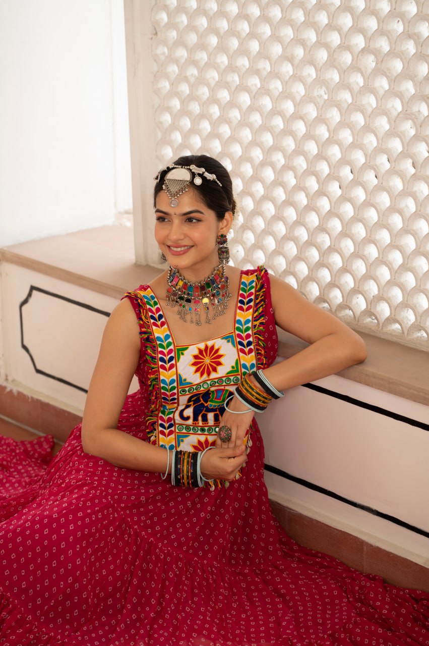 Pink Faux Georgette Bandhani Print Kutchi Patch Mirror Work Gown