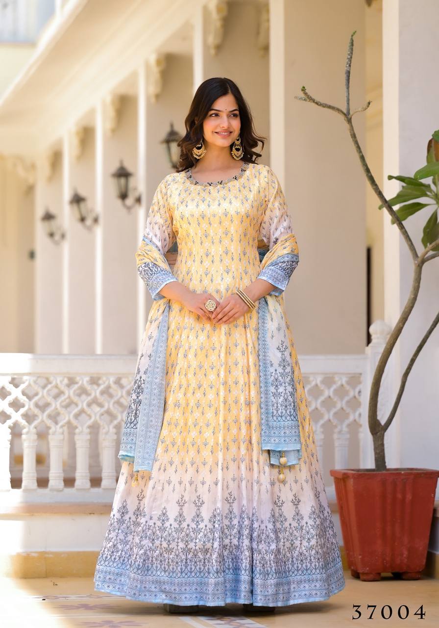 Manvi Yellow Silk Flared Anarkali Gown Set
