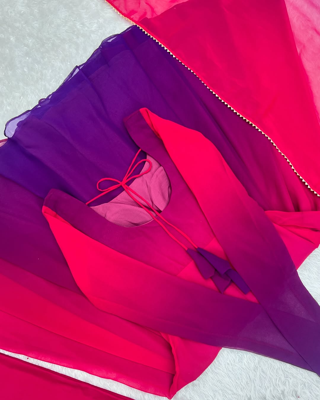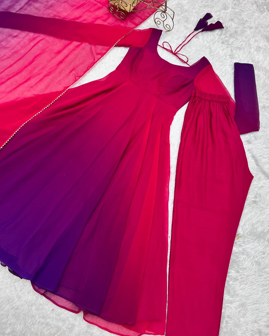 Introducing the Devika Dark Pink Flair Georgette Anarkali Gown Set, crafted with pure soft fox georgette to provide a luxurious feel. With a huge flair and included dupatta and pant, this set is perfect for any occasion. Elevate your style with this elegant and comfortable gown set.