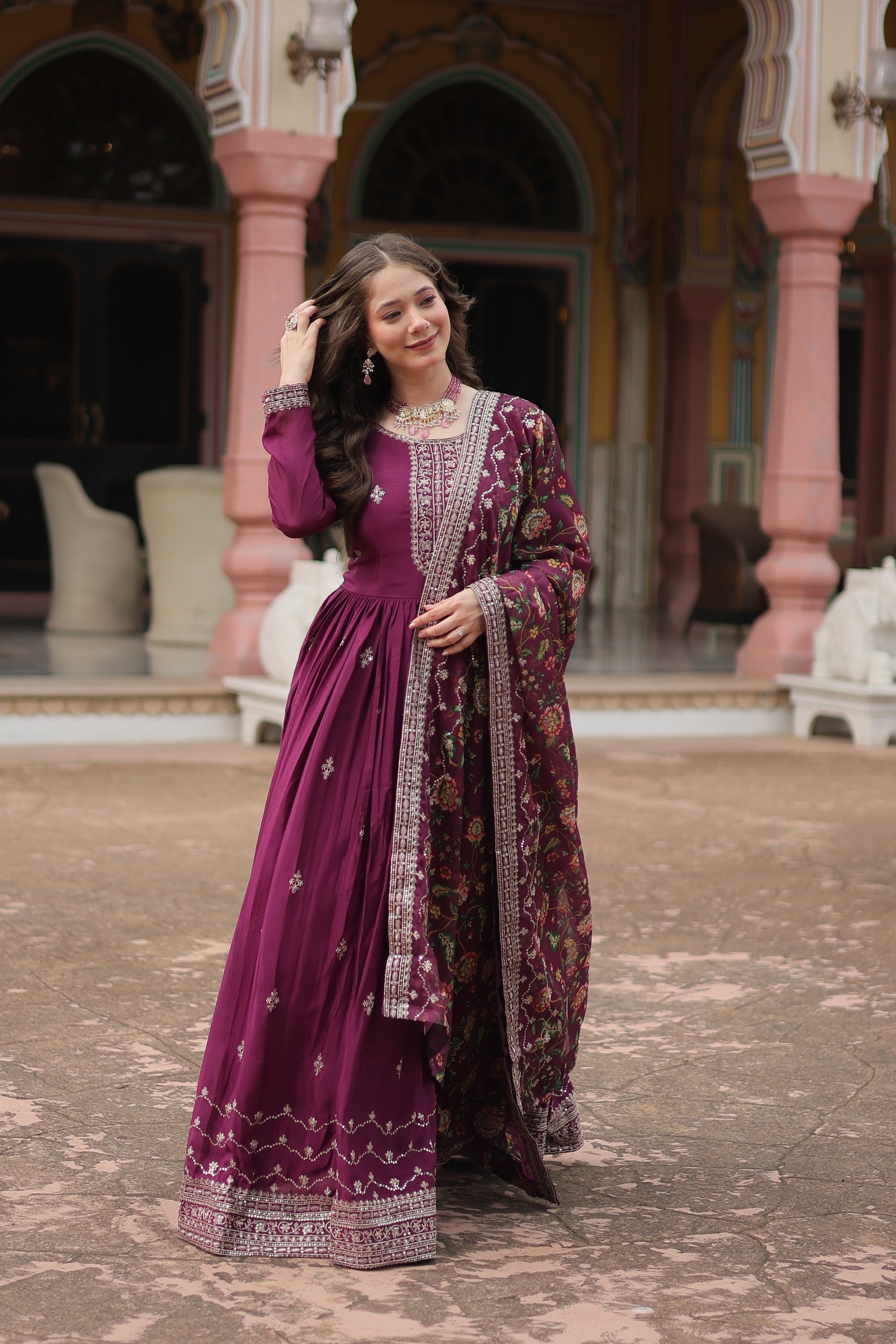 Gaurangi Wine Chinon Embroidered Anarkali Gown Set