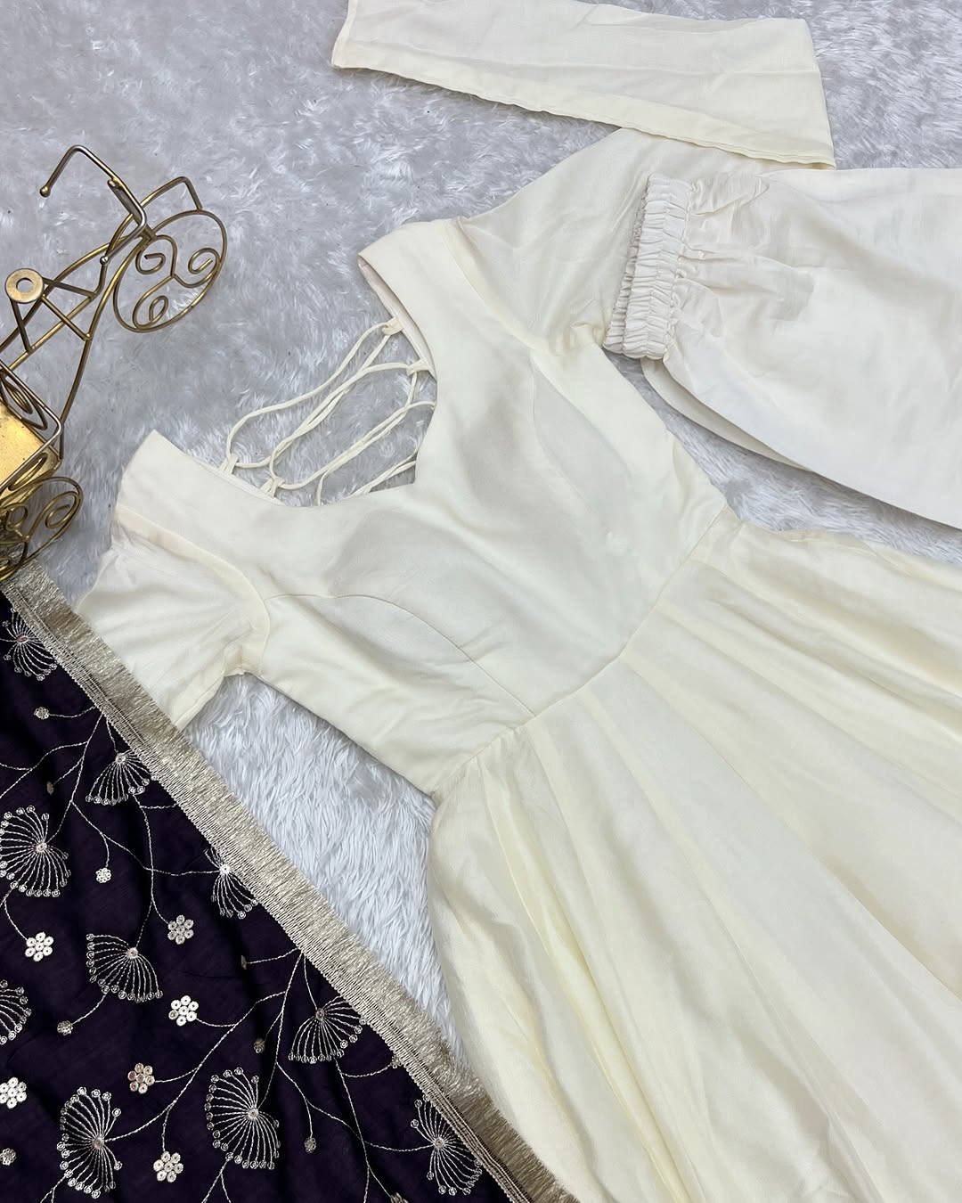 Take a risk and stand out in this Saesha White Vichitra Silk Anarkali Gown with Purple Dupatta Set. Featuring a bold and unique design, this set is perfect for those who crave adventure. Made with high-quality Vichitra silk, this gown and dupatta duo will make you feel confident and stylish. Don't blend in, dare to be different!
