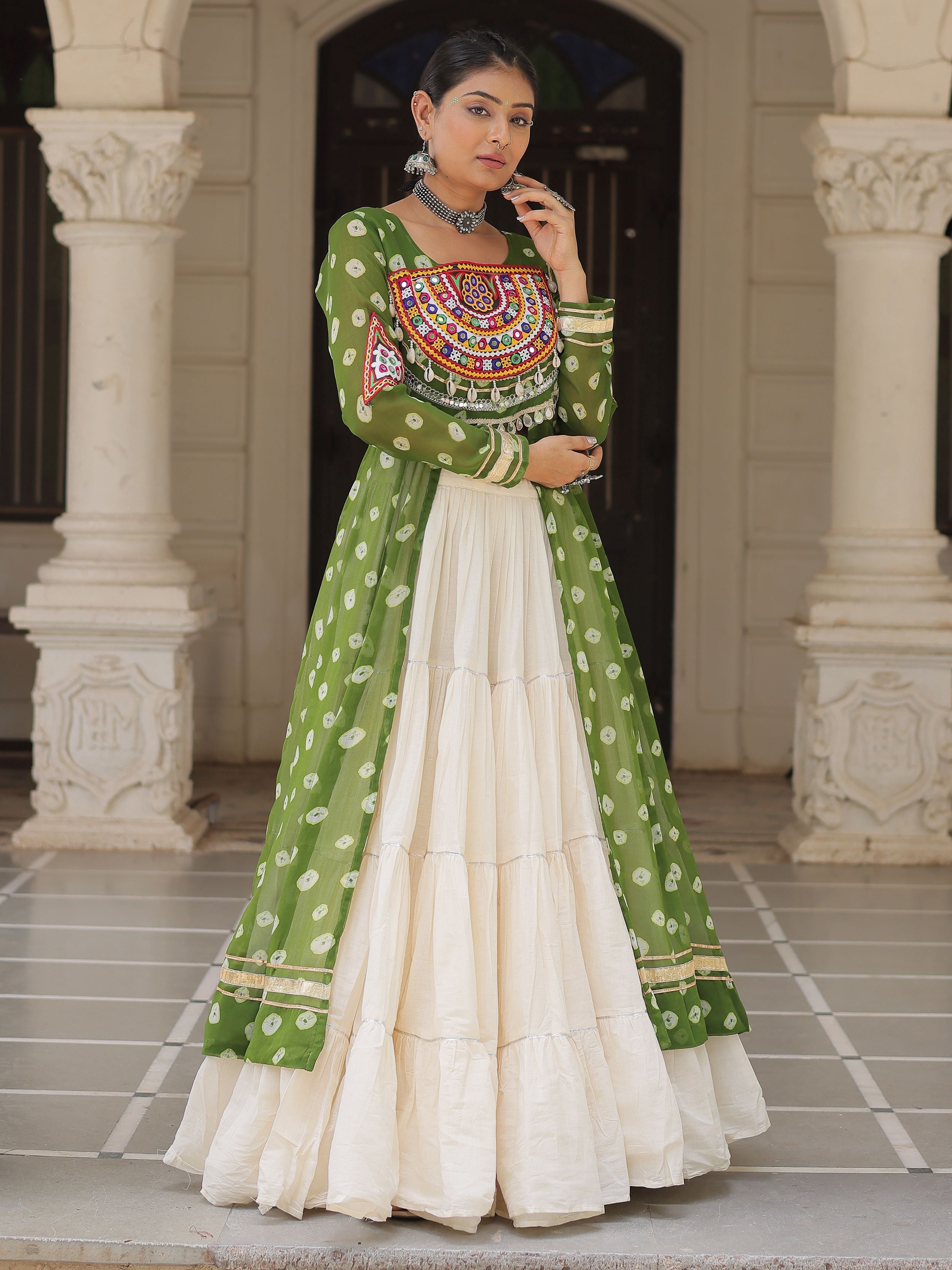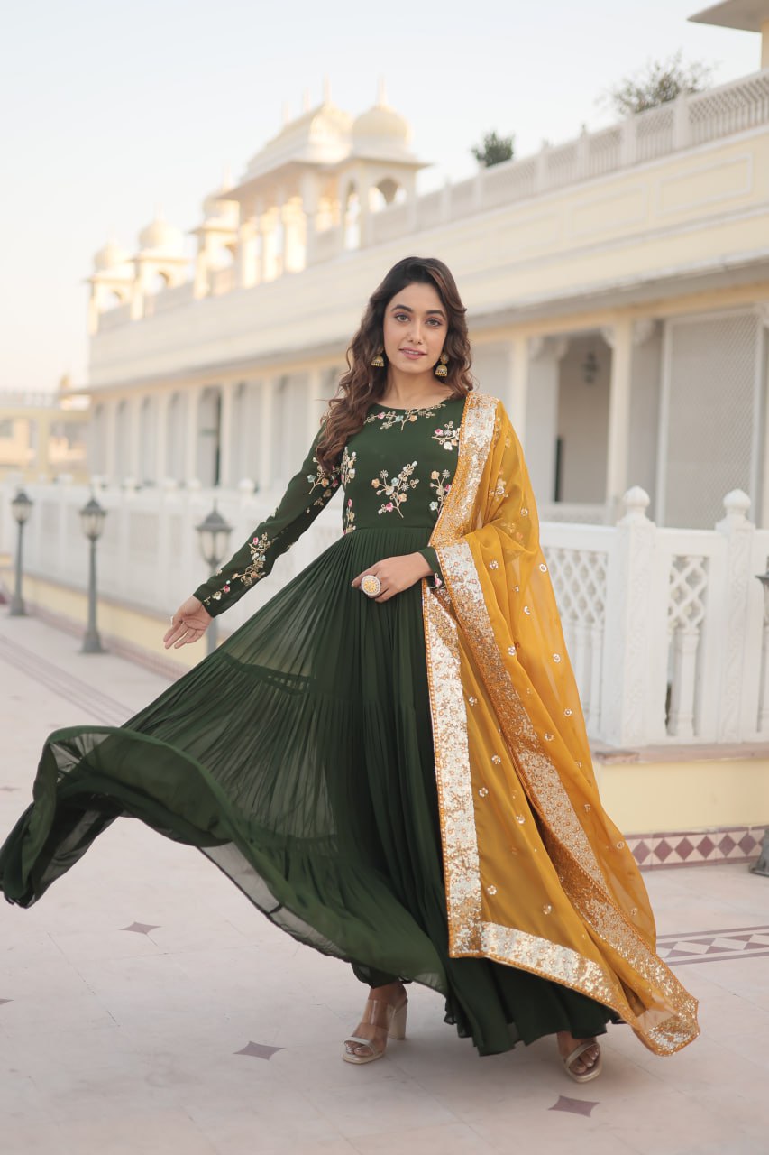 Vikarni Green Printed Anarkali Gown in faux georgette with 12-meter flair – perfect ethnic wear for women, long gown for women, printed gown for girls, Anarkali gown for wedding, georgette gown for festive wear, Indian dress for women, traditional wear for haldi ceremony, party wear gown online, readymade gown under 1000, stylish green ethnic gown for mehndi function.